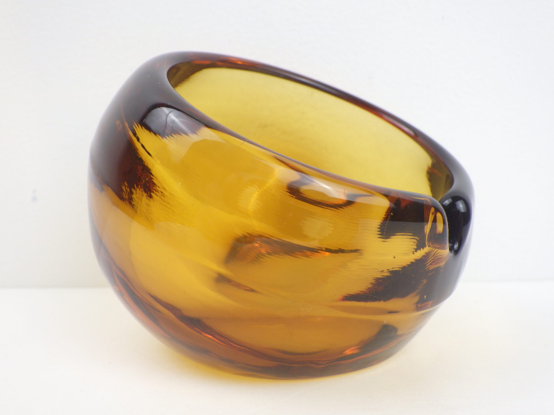 | アメリカで買い付けました。 ガラスメーカー「バイキング社」の灰皿です。 スペースエイジを思わせる、分厚いガラスの球体を斜めにカットしたような独特なデザインが特徴的です。 灰皿としてだけでなく、アクセサリートレイやお香の受け皿としてもお使いいただけそうですね。 また、オブジェとしてお部屋のアクセントにもなってくれそうです。 |