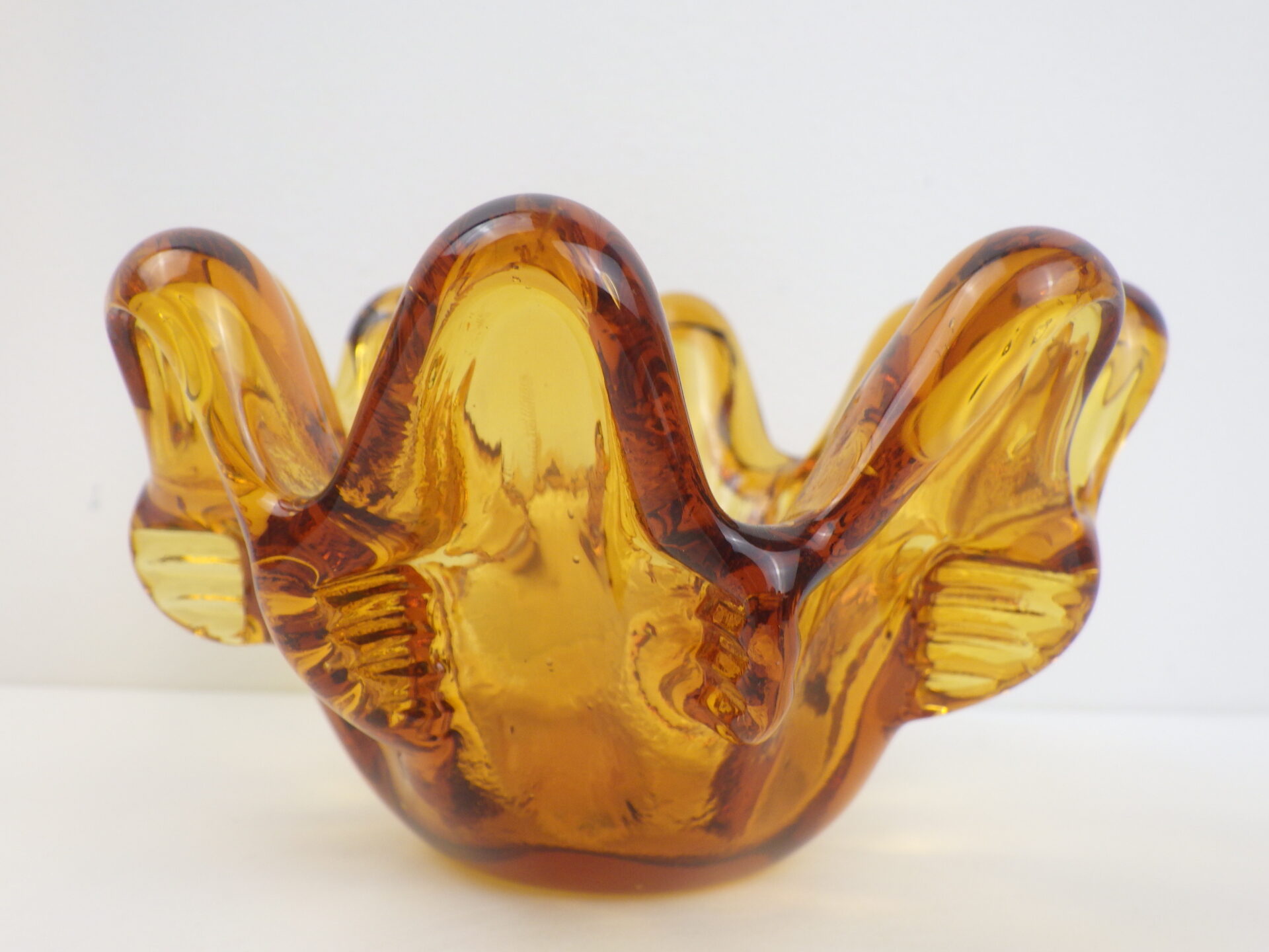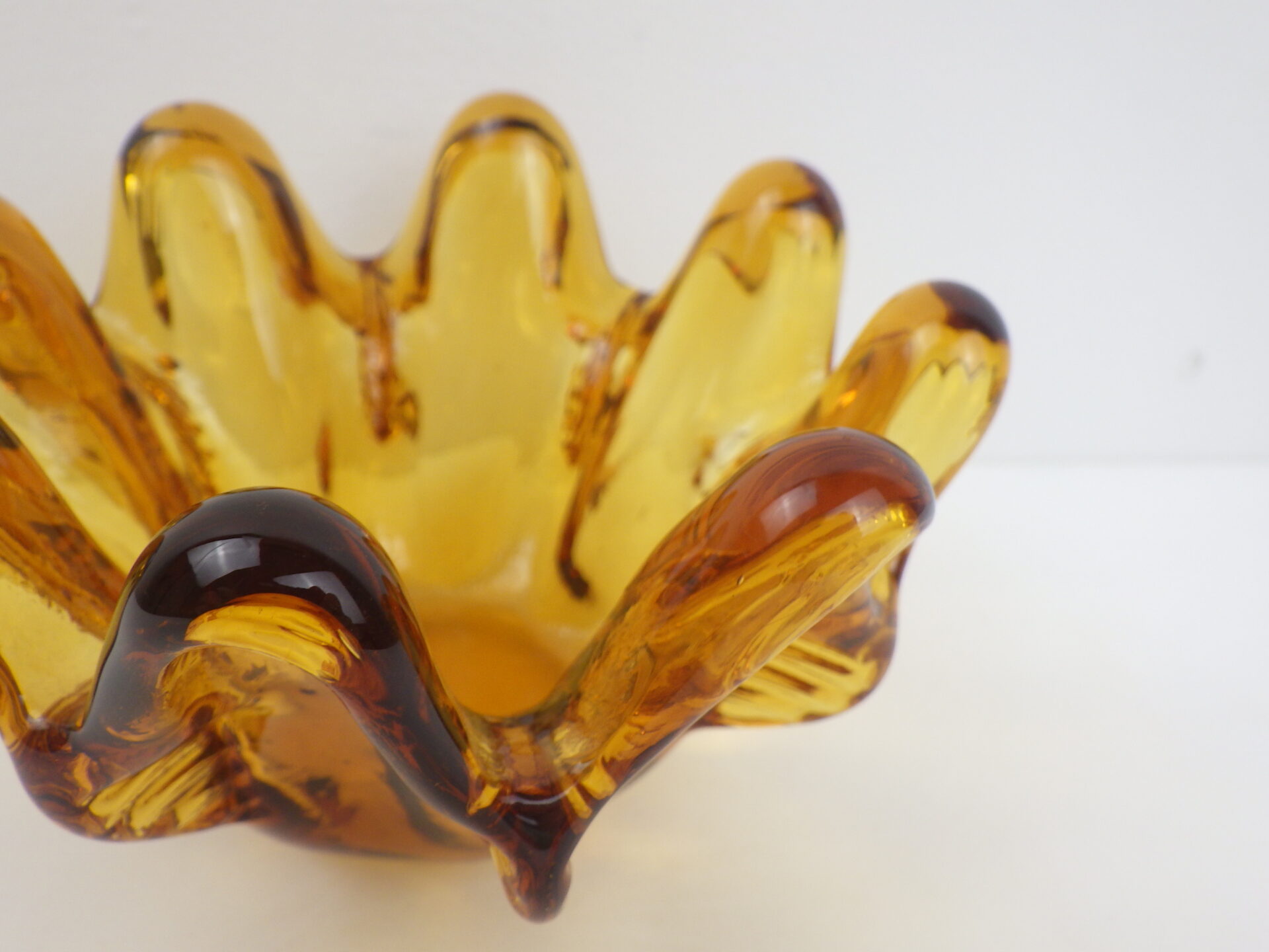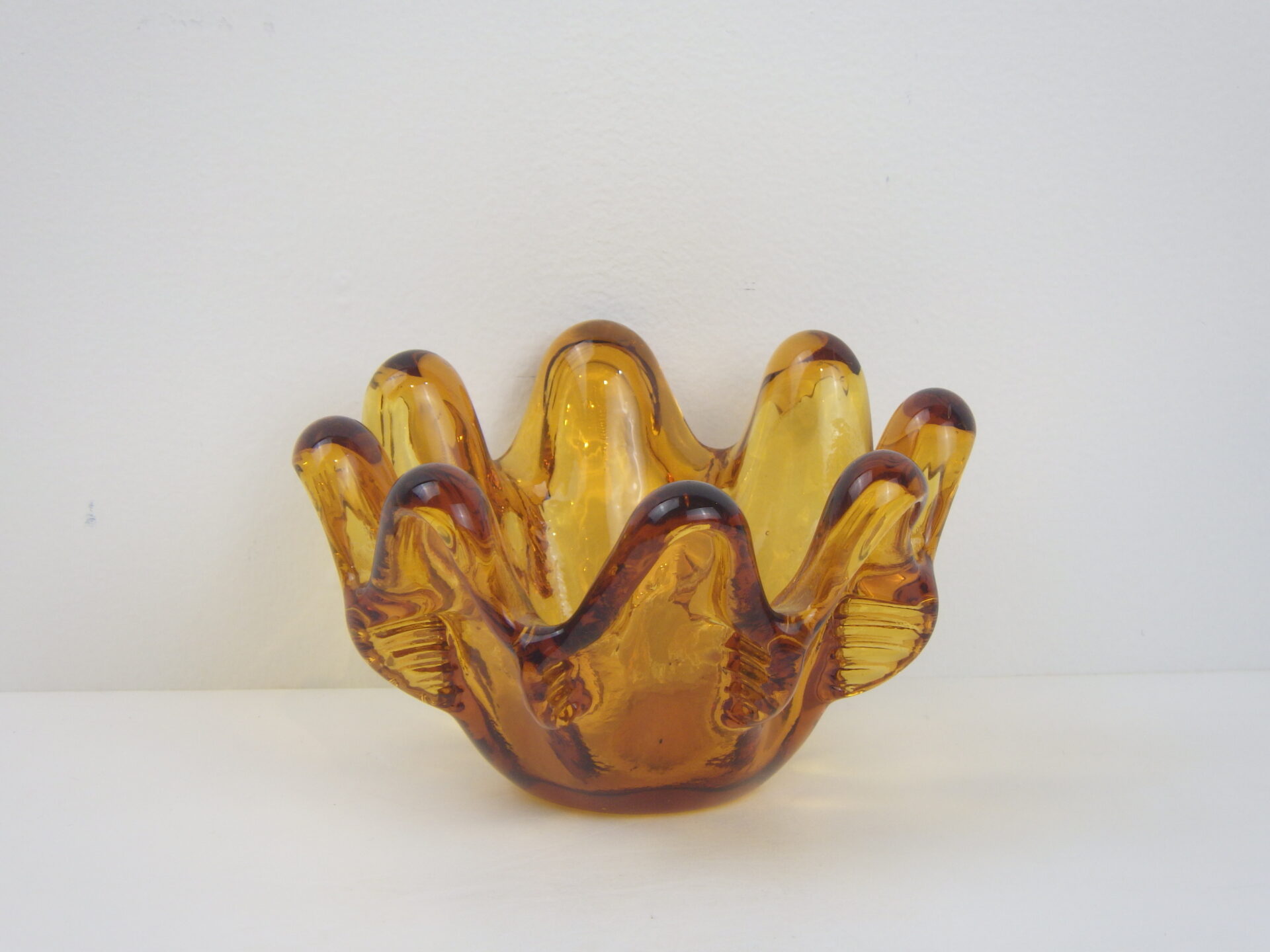 | アメリカで買い付けました。 アンバーカラーが美しい、ビンテージのガラスの灰皿です。 波打つような造形が大変印象的で、インテリアのアクセントとして活躍してくれそう。 アクセサリートレイにしたり、お香受けにしたりと、色々なアレンジが楽しめそうです。 |