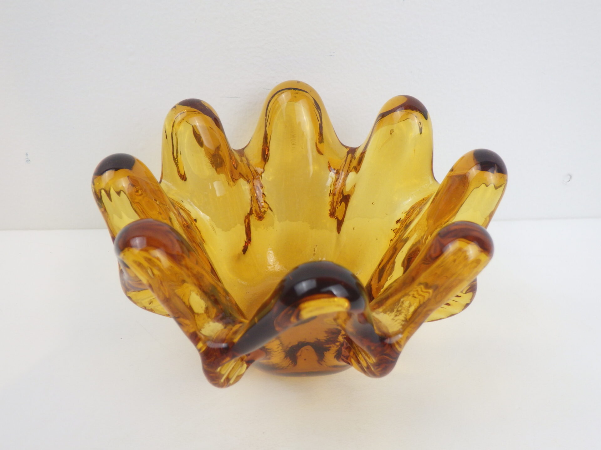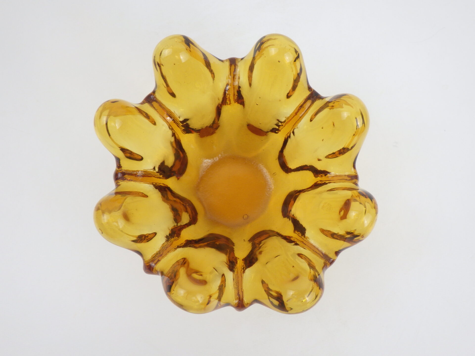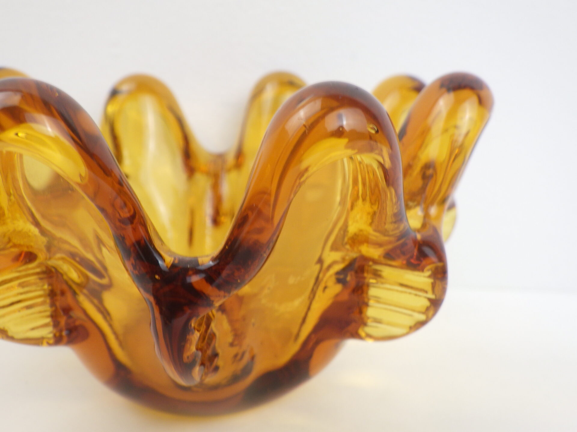 | アメリカで買い付けました。 アンバーカラーが美しい、ビンテージのガラスの灰皿です。 波打つような造形が大変印象的で、インテリアのアクセントとして活躍してくれそう。 アクセサリートレイにしたり、お香受けにしたりと、色々なアレンジが楽しめそうです。 |