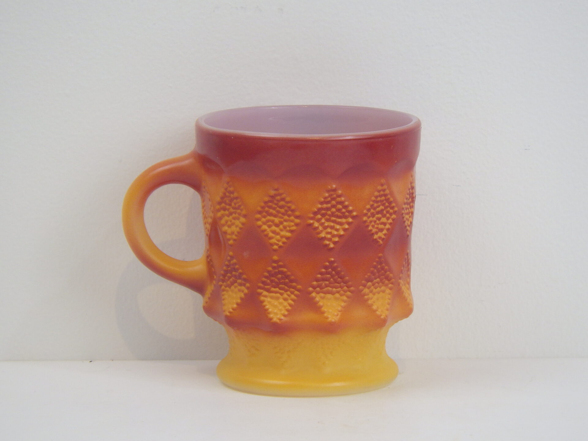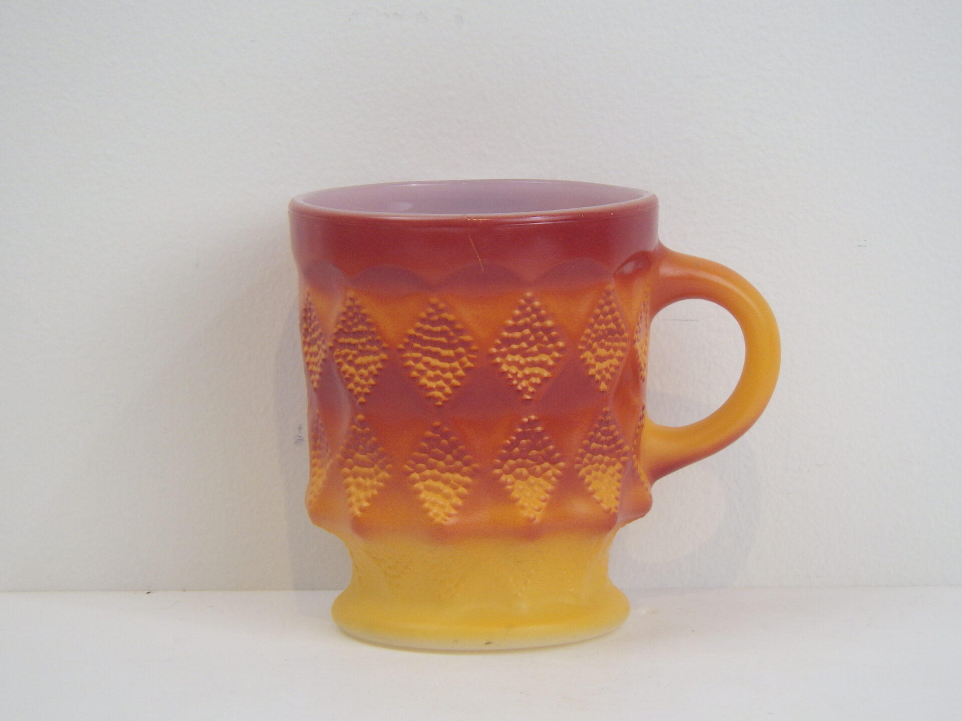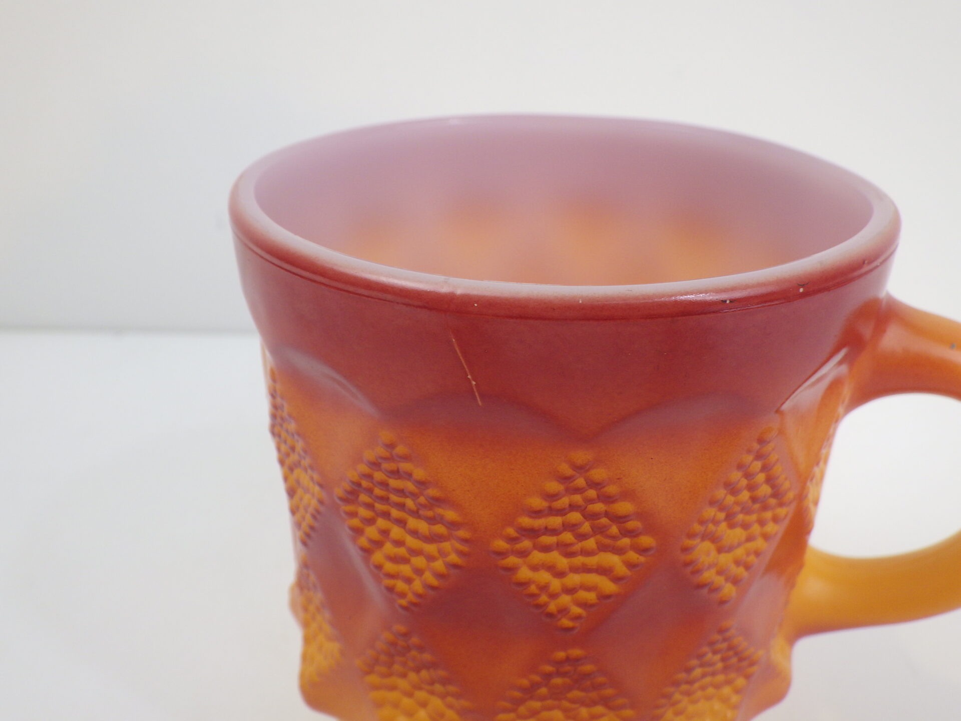 | アメリカで買い付けました。 ファイヤーキングのキンバリーマグです。 有名なダイアモンドの原産地、南アフリカ共和国の都市「キンバリー」が名前の由来と言われています。 ダイアの原石がモチーフとなっており、男女共に人気のシリーズです。 様々なカラーが展開されているので、思わずコレクションしたくなりますね。 こちらのシリーズは個体によってカラーの濃淡がかなり異なるのが特徴ですが、こちらは赤い部分が多いグラデーションになっています。 |