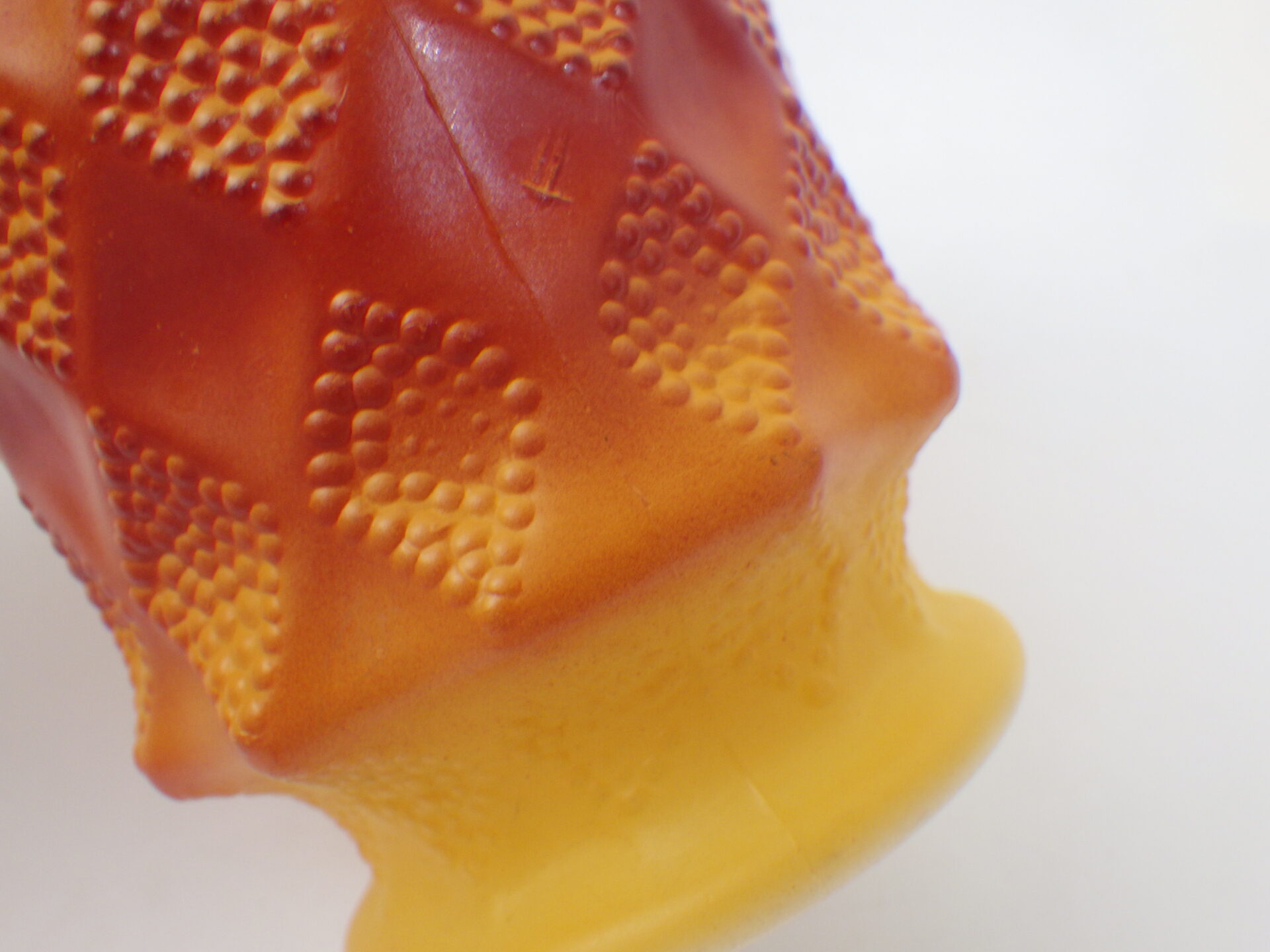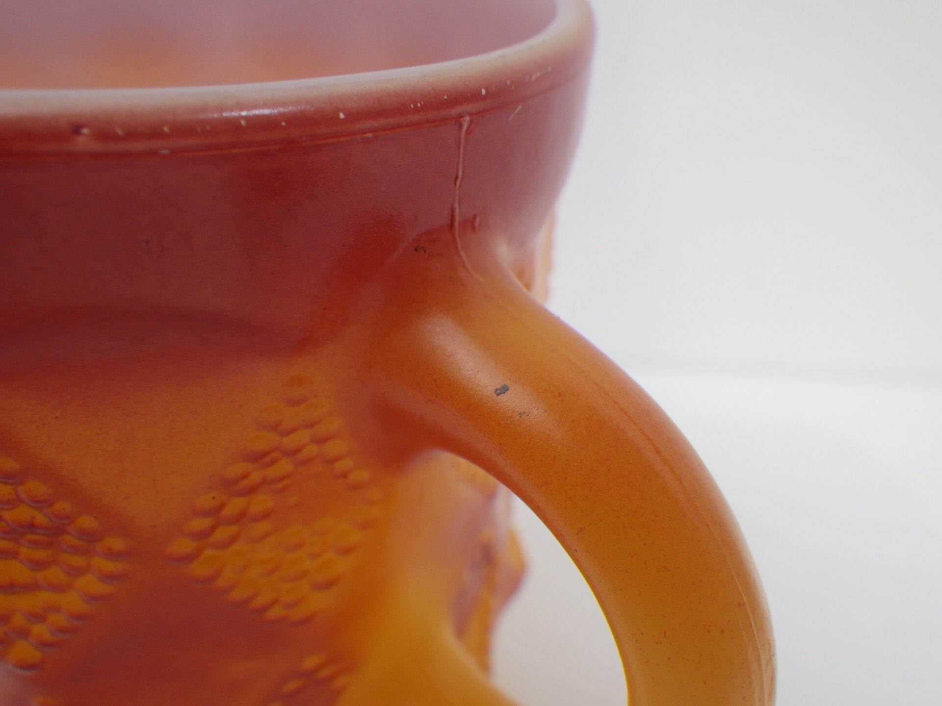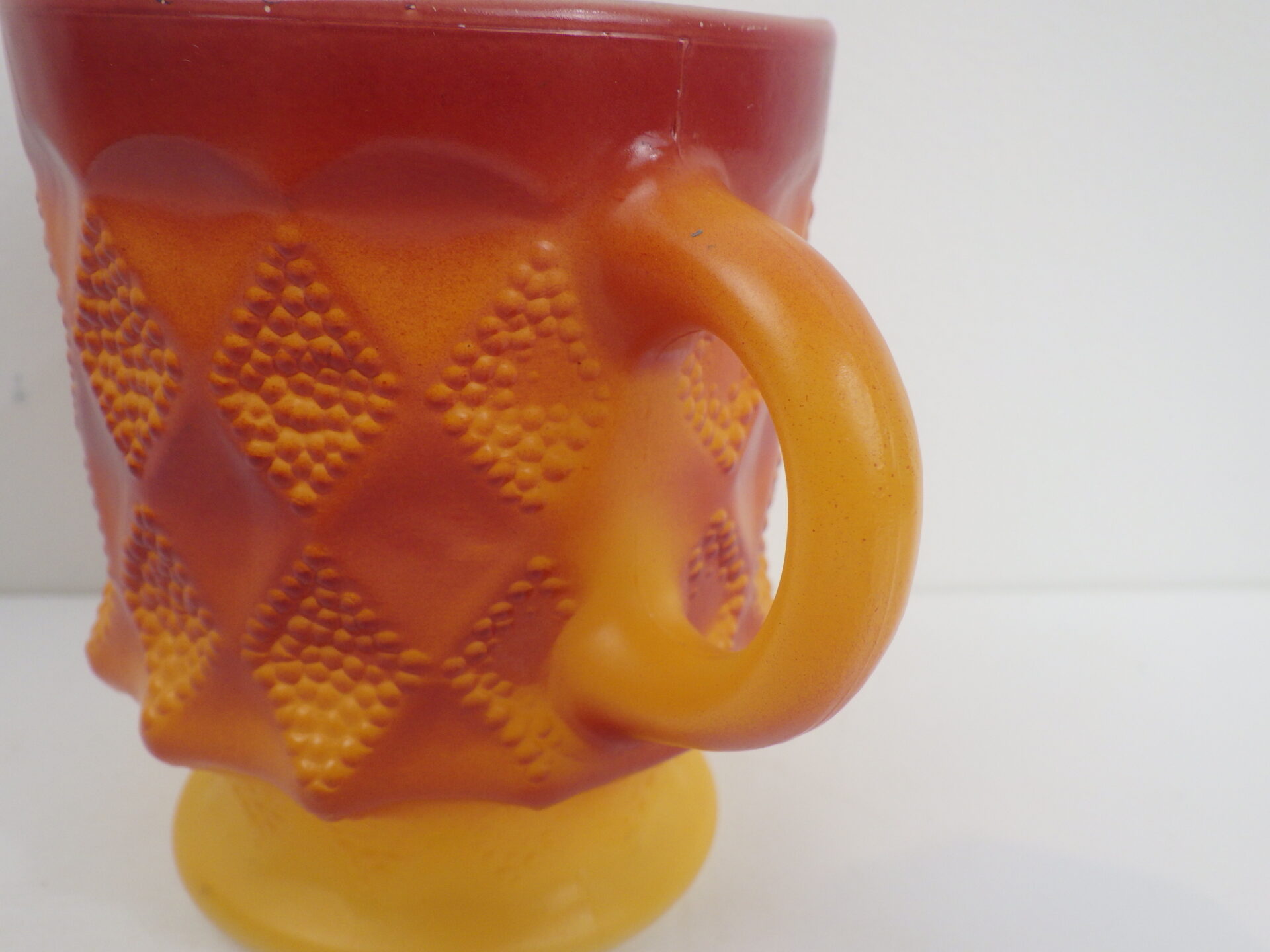 | アメリカで買い付けました。 ファイヤーキングのキンバリーマグです。 有名なダイアモンドの原産地、南アフリカ共和国の都市「キンバリー」が名前の由来と言われています。 ダイアの原石がモチーフとなっており、男女共に人気のシリーズです。 様々なカラーが展開されているので、思わずコレクションしたくなりますね。 こちらのシリーズは個体によってカラーの濃淡がかなり異なるのが特徴ですが、こちらは赤い部分が多いグラデーションになっています。 |