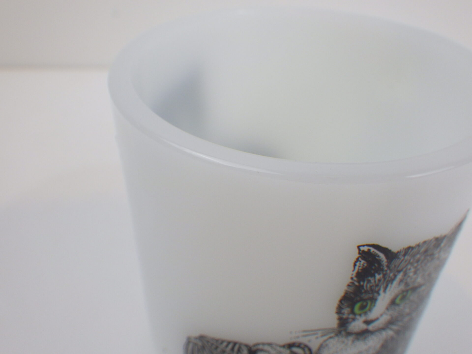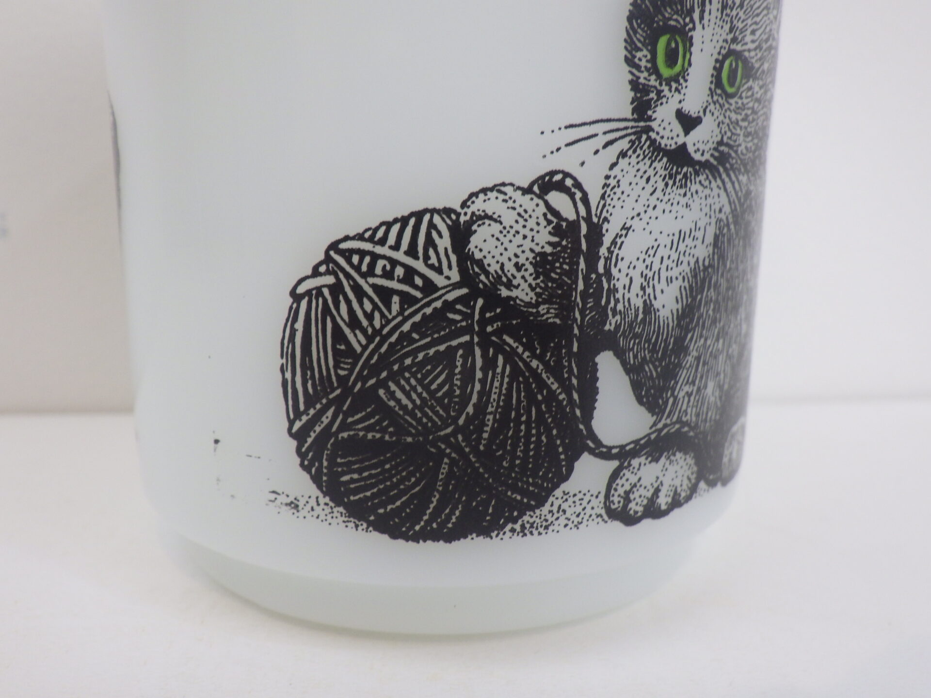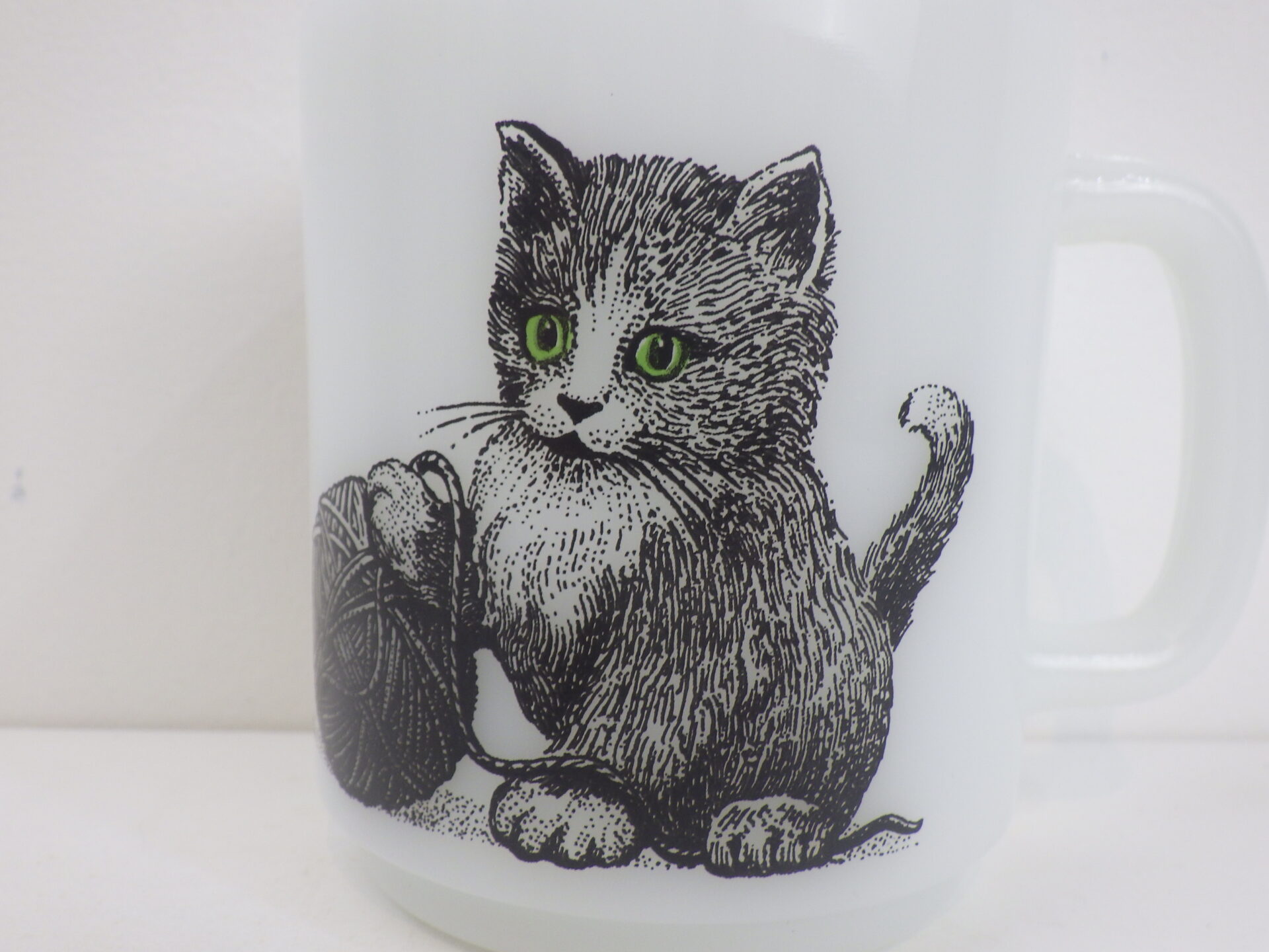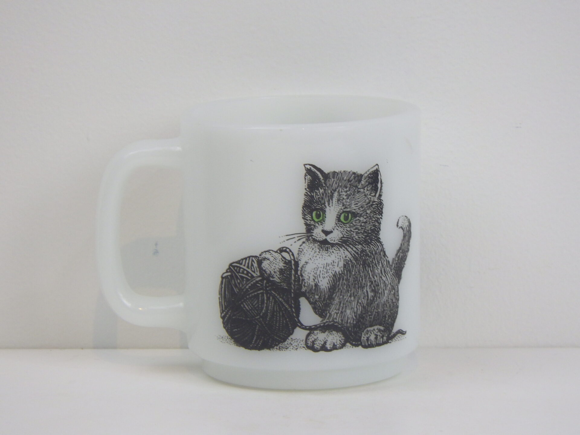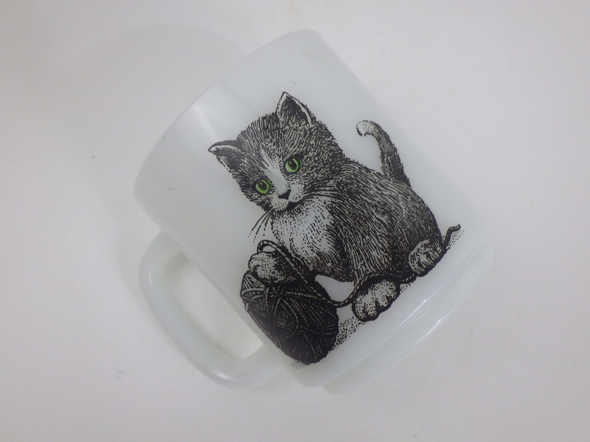 | アメリカで買い付けました。 毛糸で遊んでいるネコちゃんのプリントが可愛い、グラスベイクのマグです。 瞳にだけグリーンで色付けされています。 猫好きの方におすすめのアイテムです。 容量約280mlと大き目で、コーヒーなどたっぷり飲みたい方にもおすすめですよ。 |