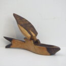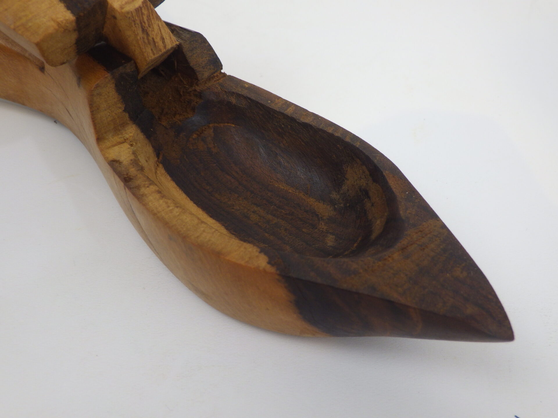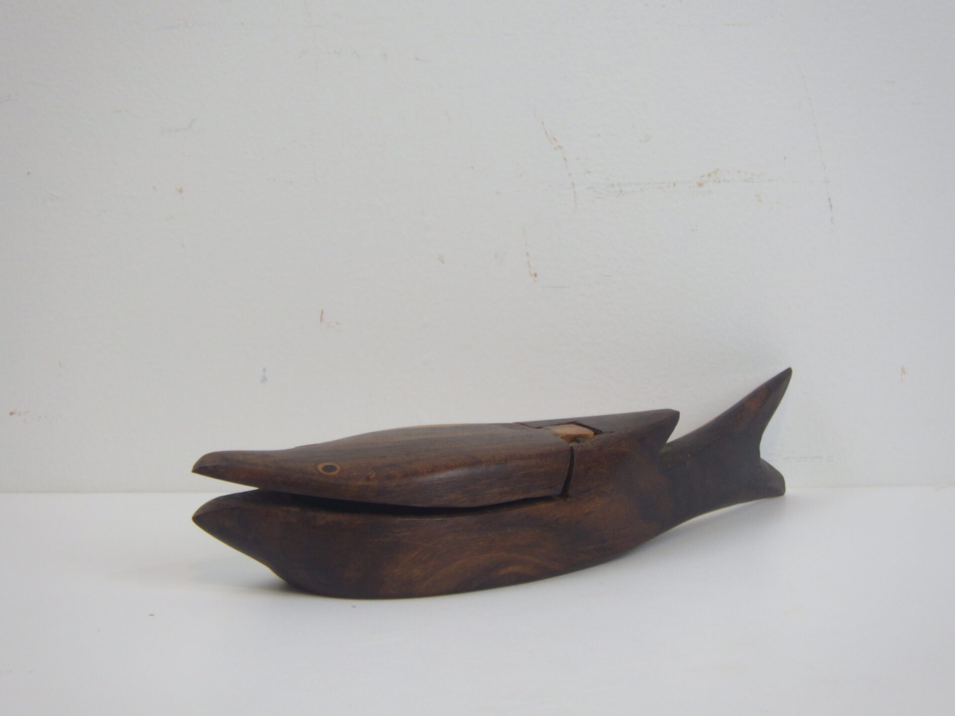 | アメリカで買い付けました。 クジラのように口を大きく開くと内側が受け皿になっている木製オブジェです。 口の開きはクジラのようですが、尾ひれは魚のよう。 つぶらな瞳が可愛らしいです。 元は灰皿、もしくは小物入れとして作られたのでしょうか? 木目を生かしたデザインが、あたたかみのある印象を与えてくれますね。 |