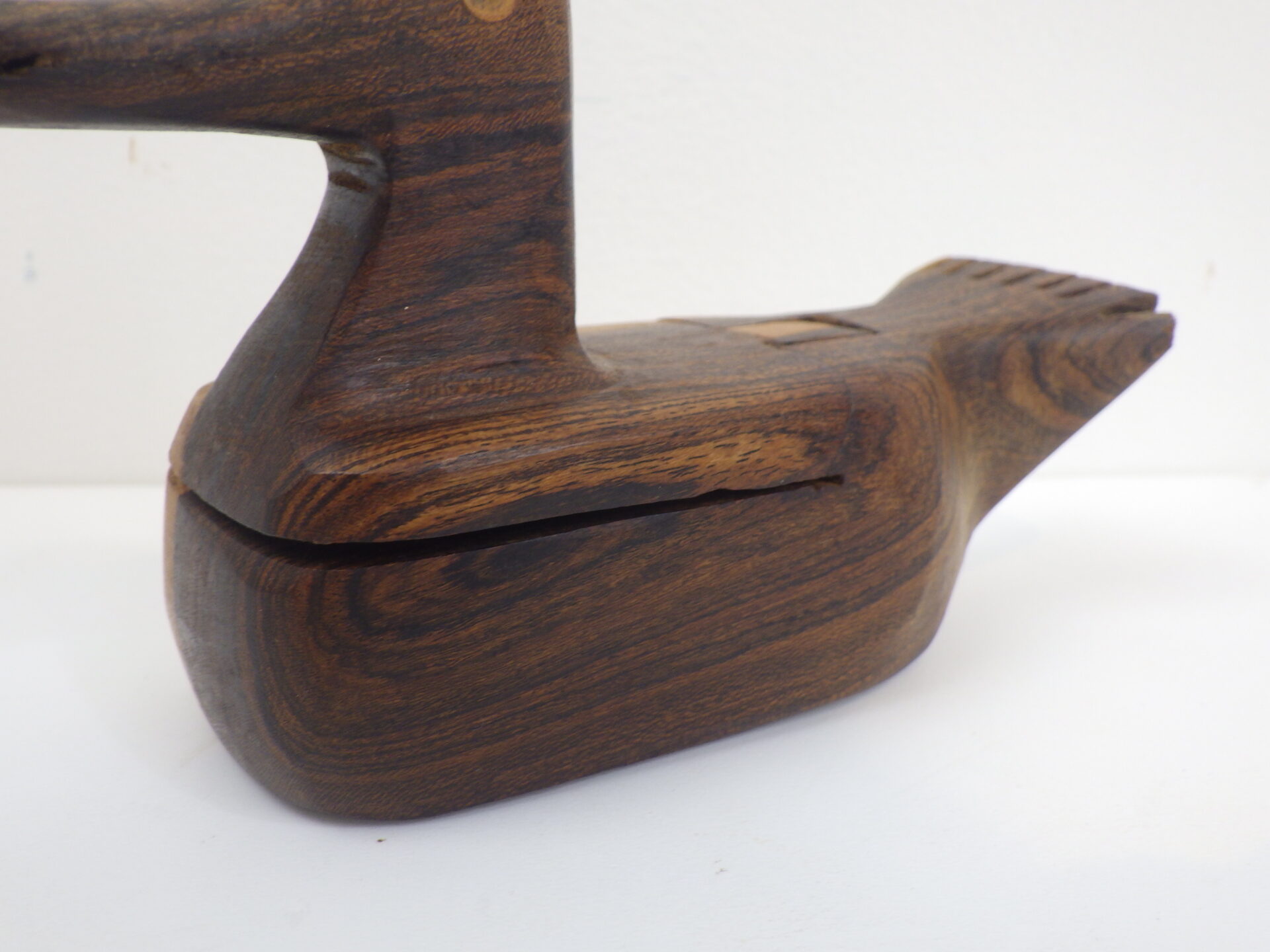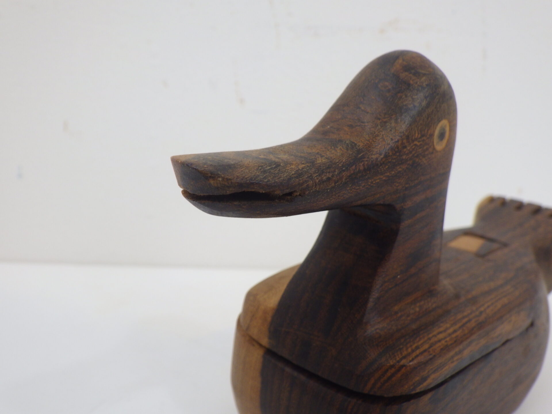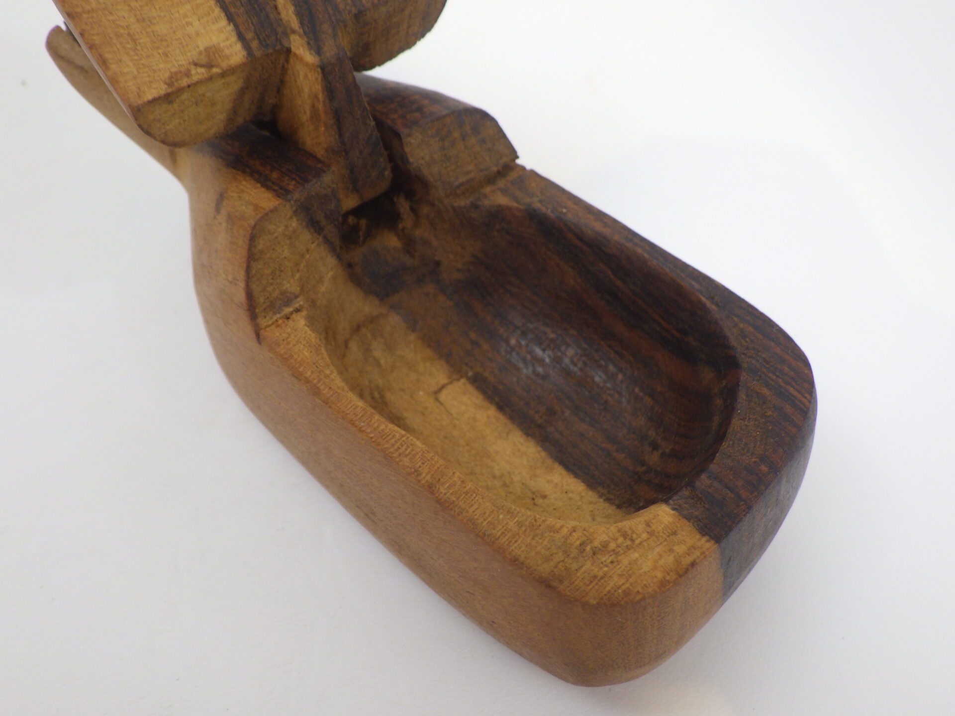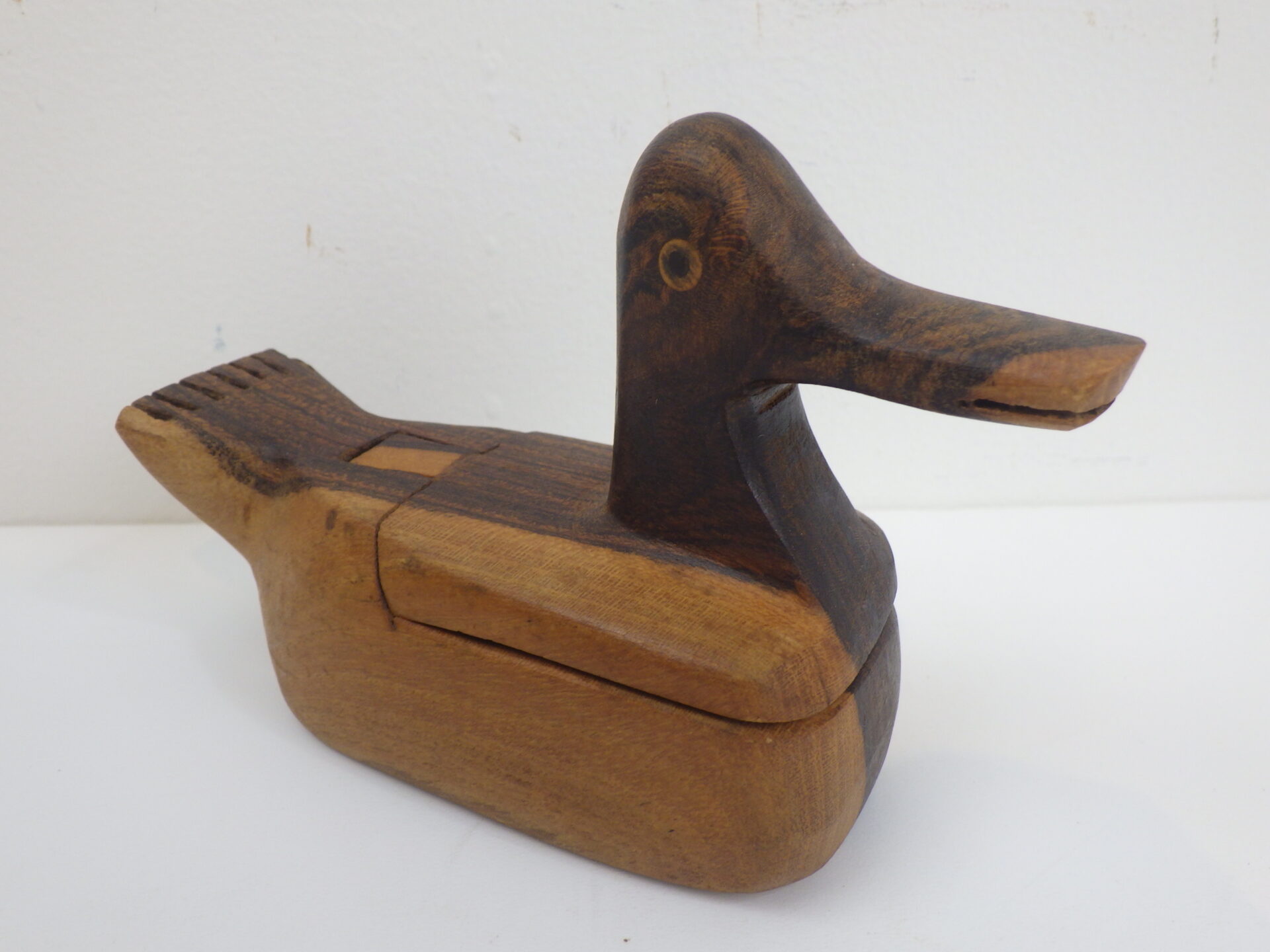 | アメリカで買い付けました。 ボディ部分を大きく開くと内側が受け皿になっている木製オブジェです。 アヒルでしょうか? 素朴な顔立ちが何とも言えない可愛らしさです。 元は灰皿、もしくは小物入れとして作られたのでしょうか? 木目を生かしたデザインが、あたたかみのある印象を与えてくれますね。 |