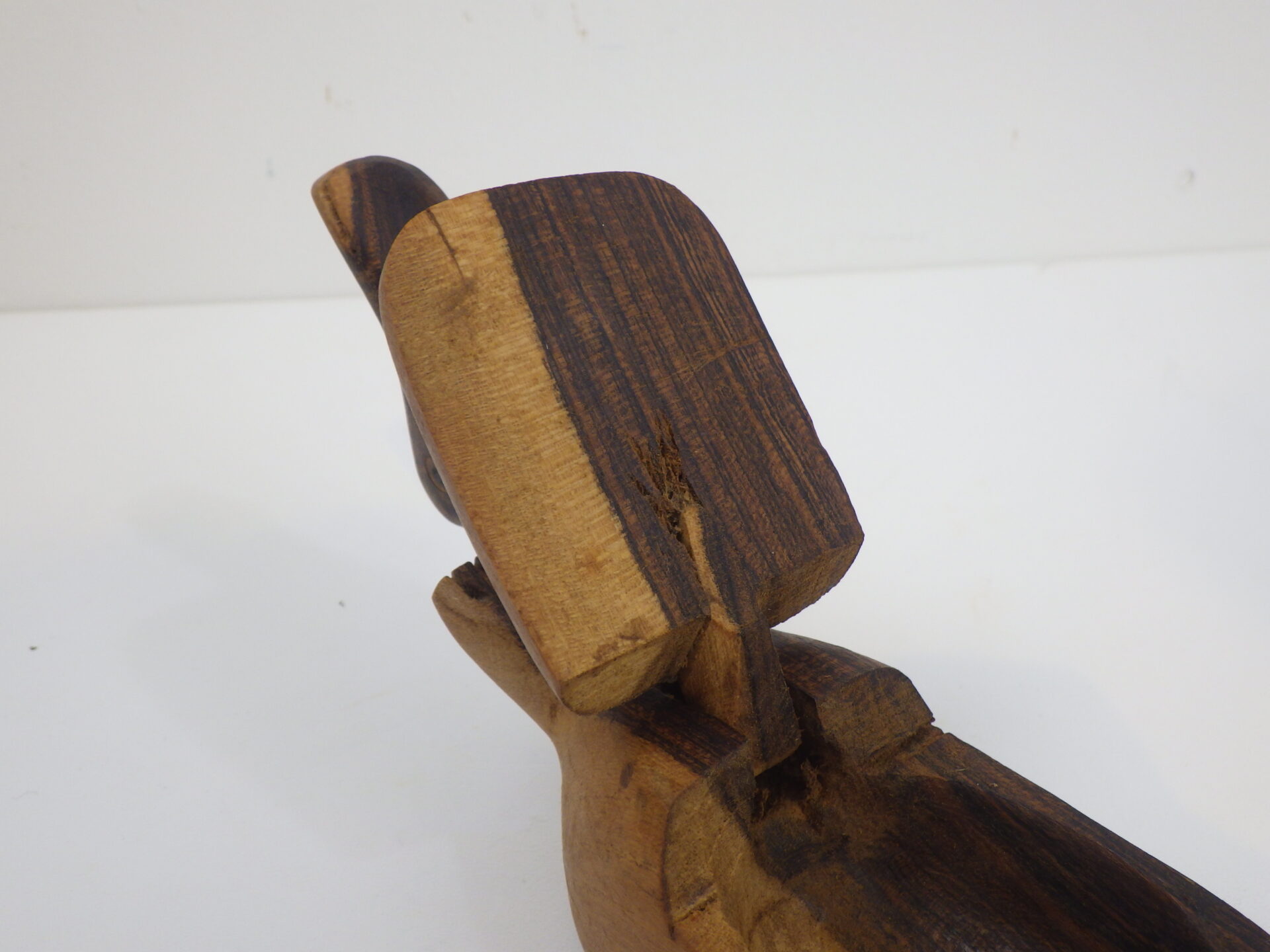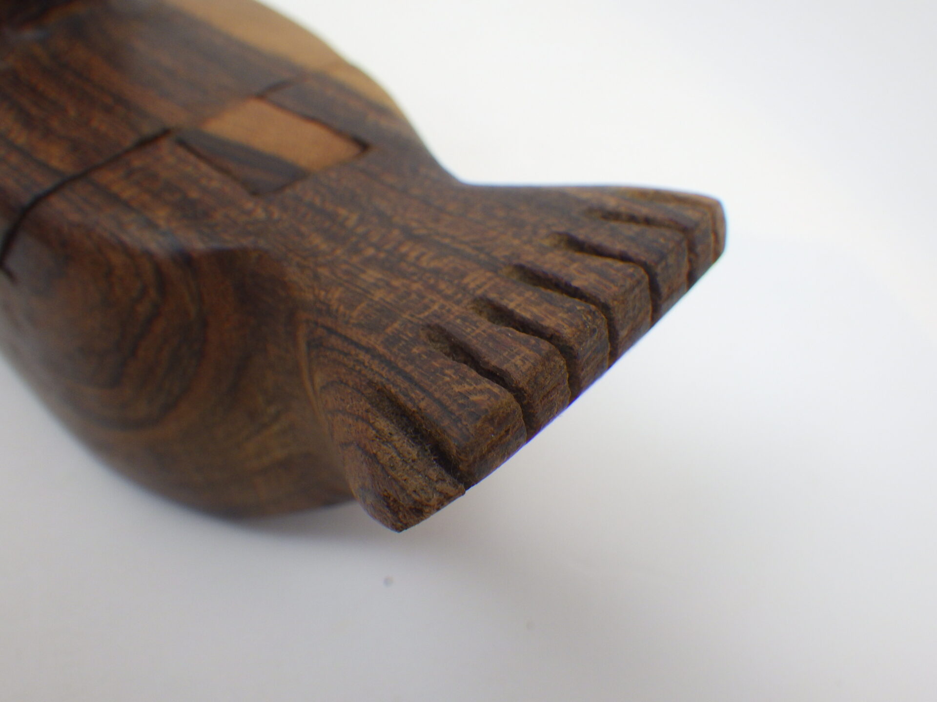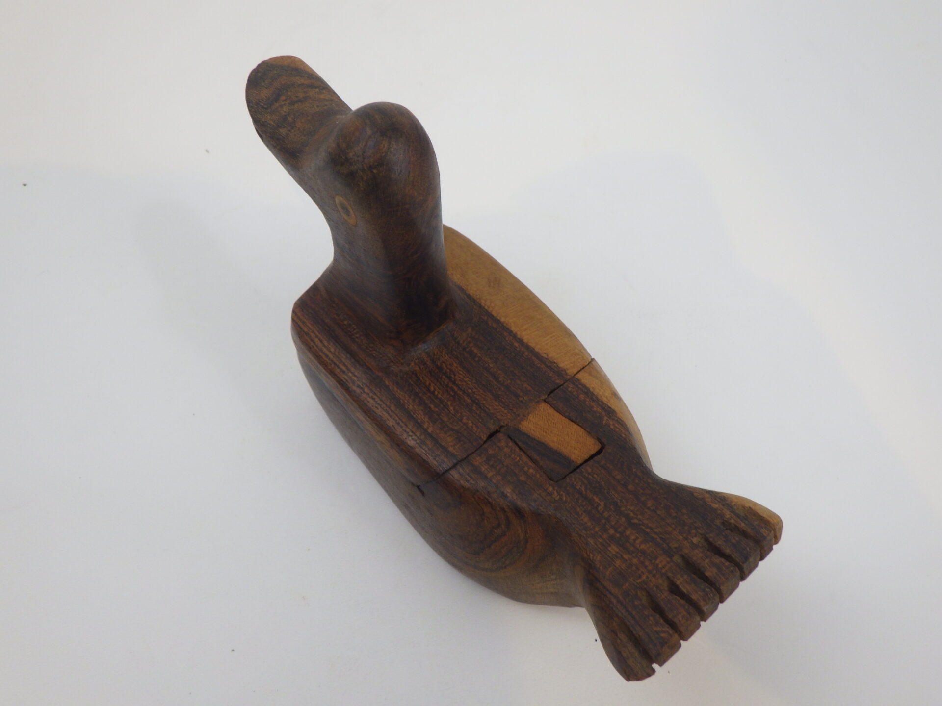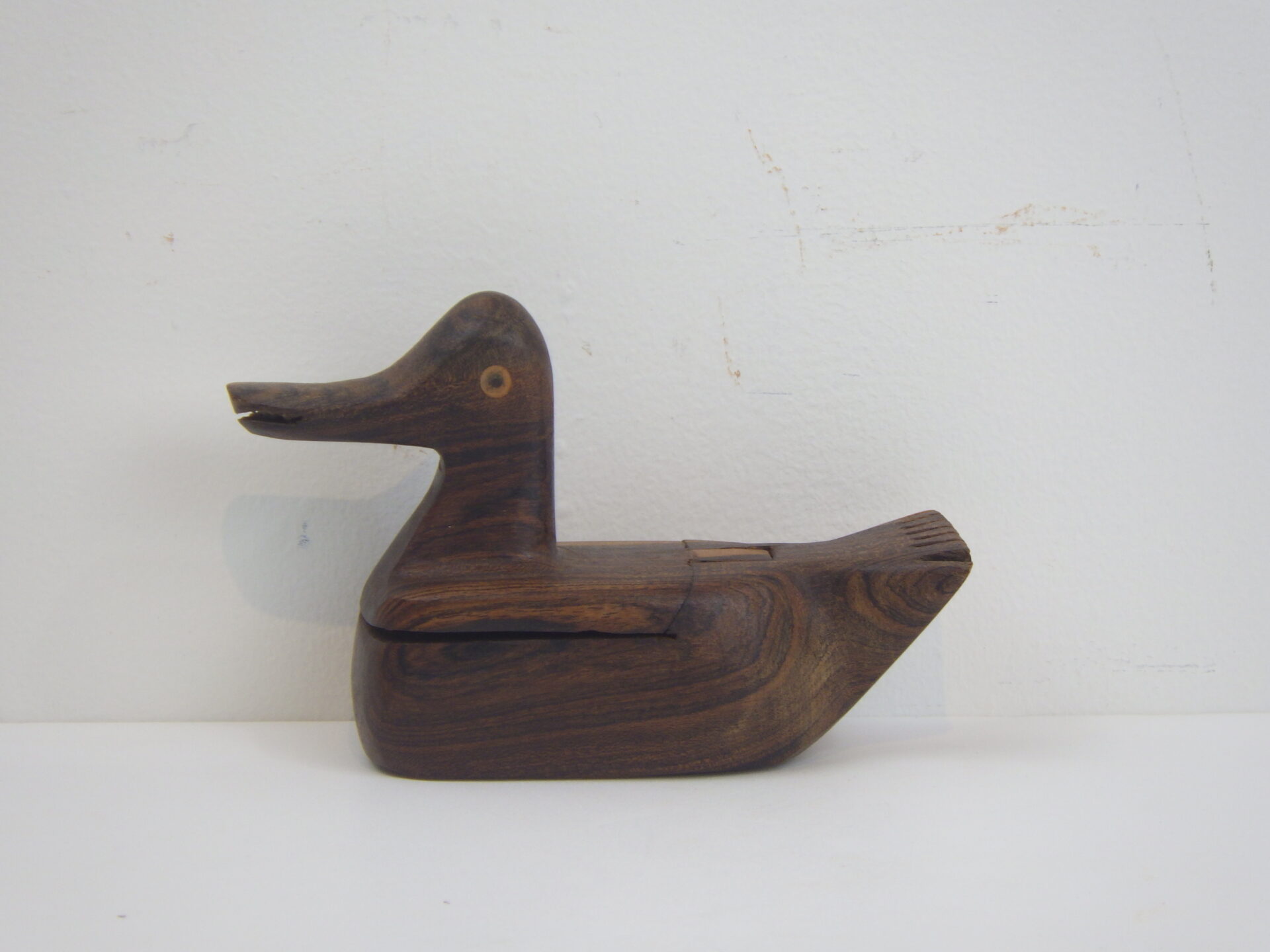 | アメリカで買い付けました。 ボディ部分を大きく開くと内側が受け皿になっている木製オブジェです。 アヒルでしょうか? 素朴な顔立ちが何とも言えない可愛らしさです。 元は灰皿、もしくは小物入れとして作られたのでしょうか? 木目を生かしたデザインが、あたたかみのある印象を与えてくれますね。 |