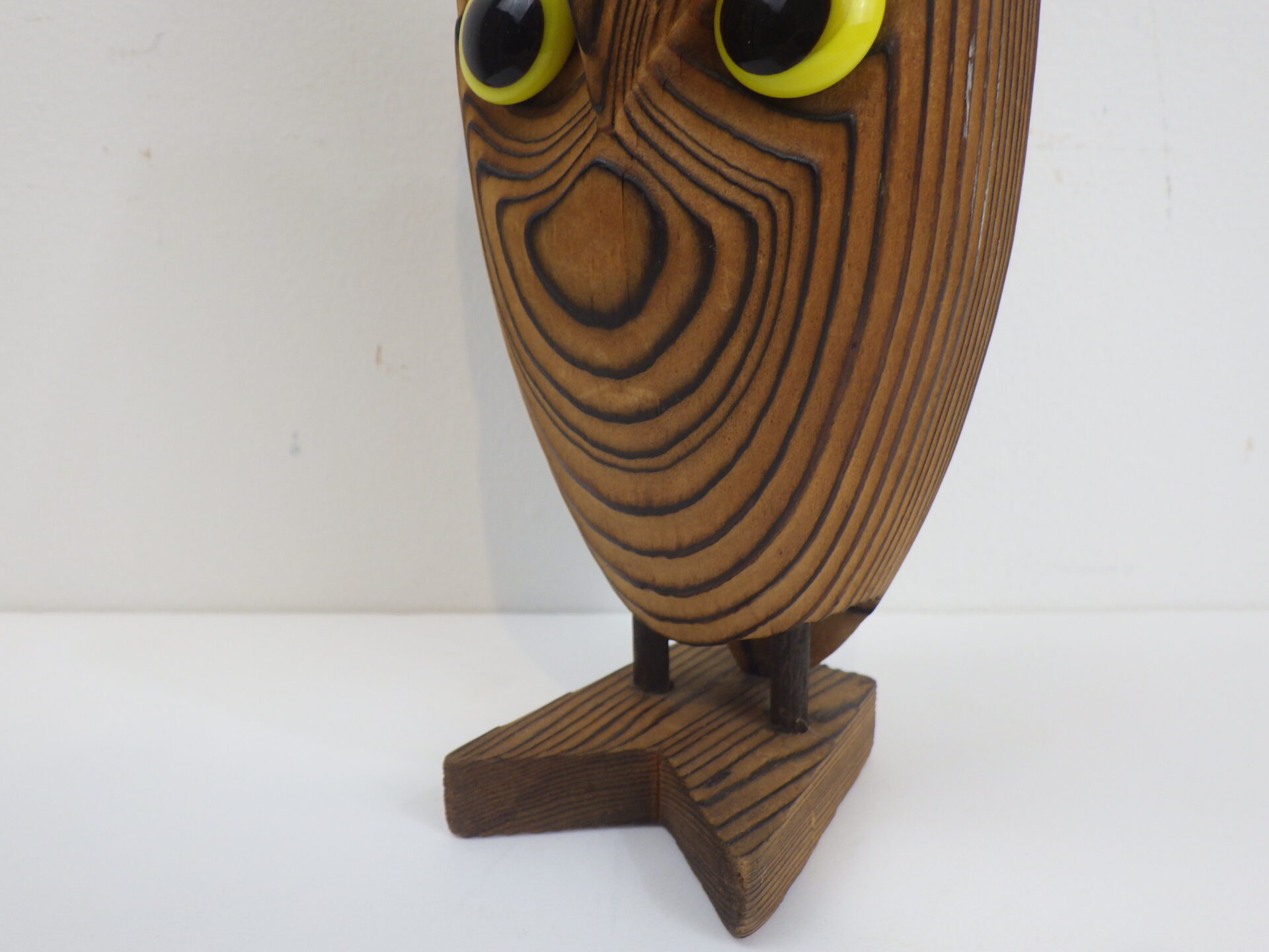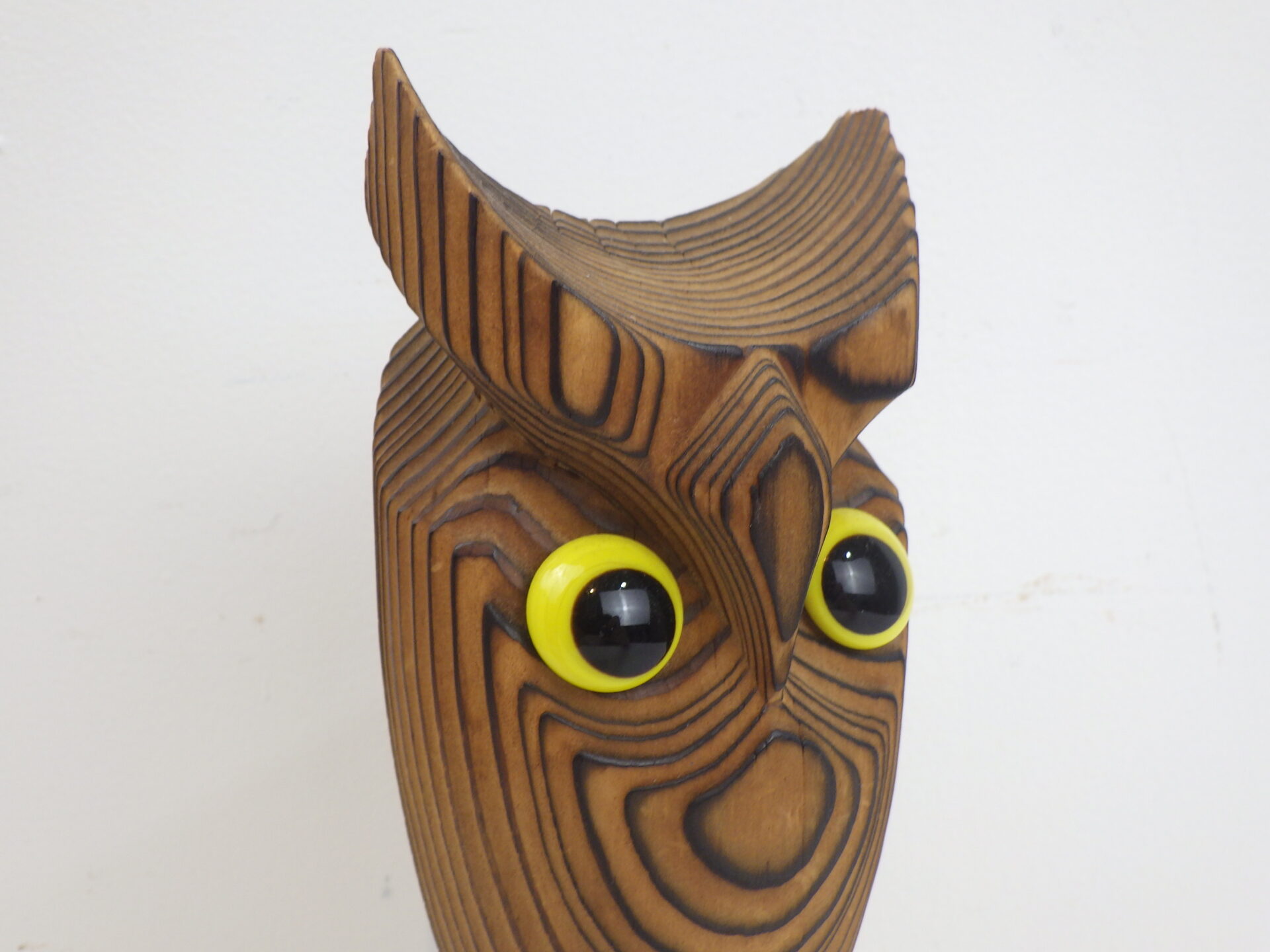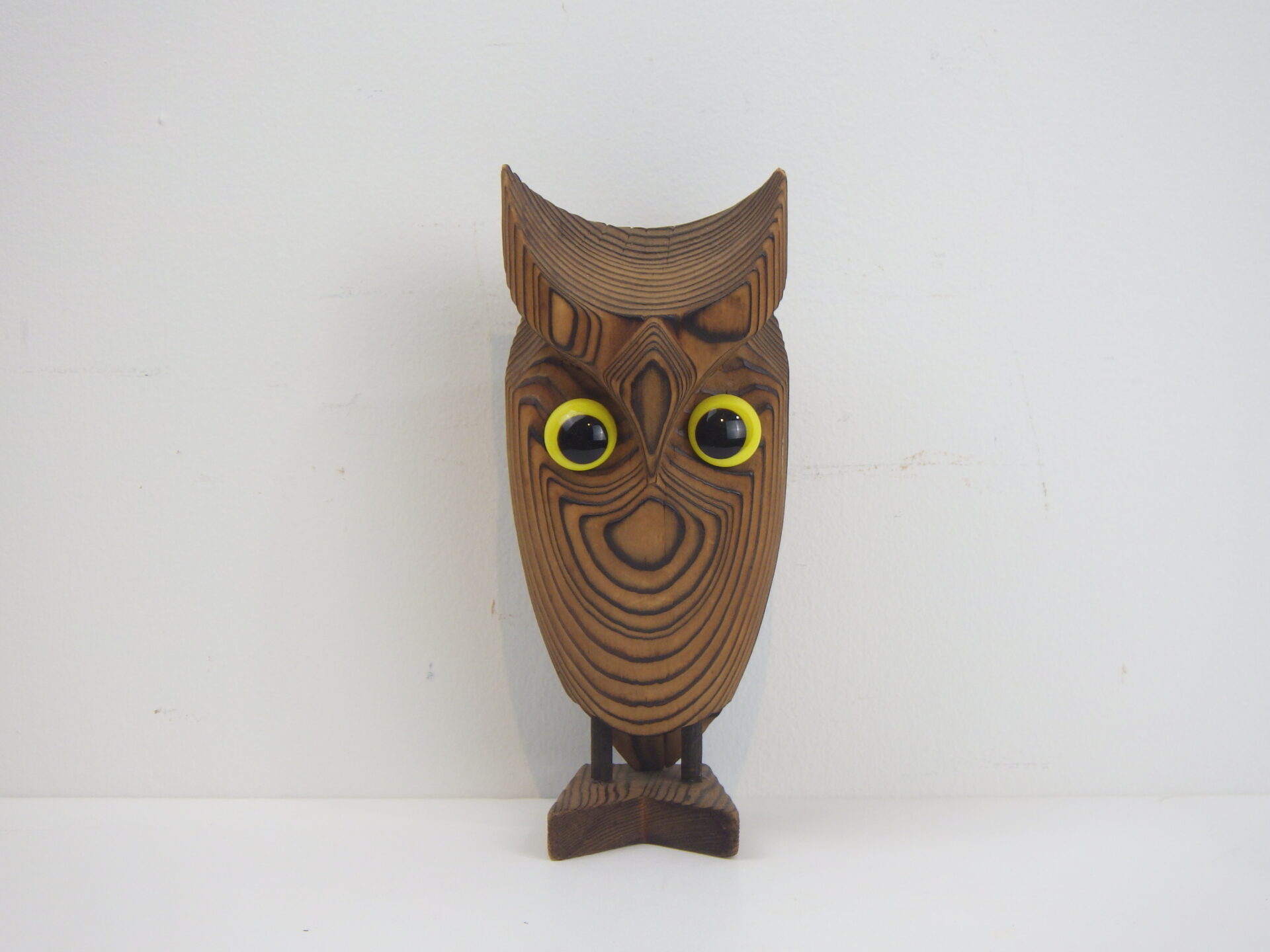 | アメリカで買い付けました。 木製のフクロウのオブジェです。 瞳の部分はガラスで出来ています。 年輪のようなエンボスが、焼き入れによって良い雰囲気を醸し出しています。 MADE IN JAPANのアイテムです。 |