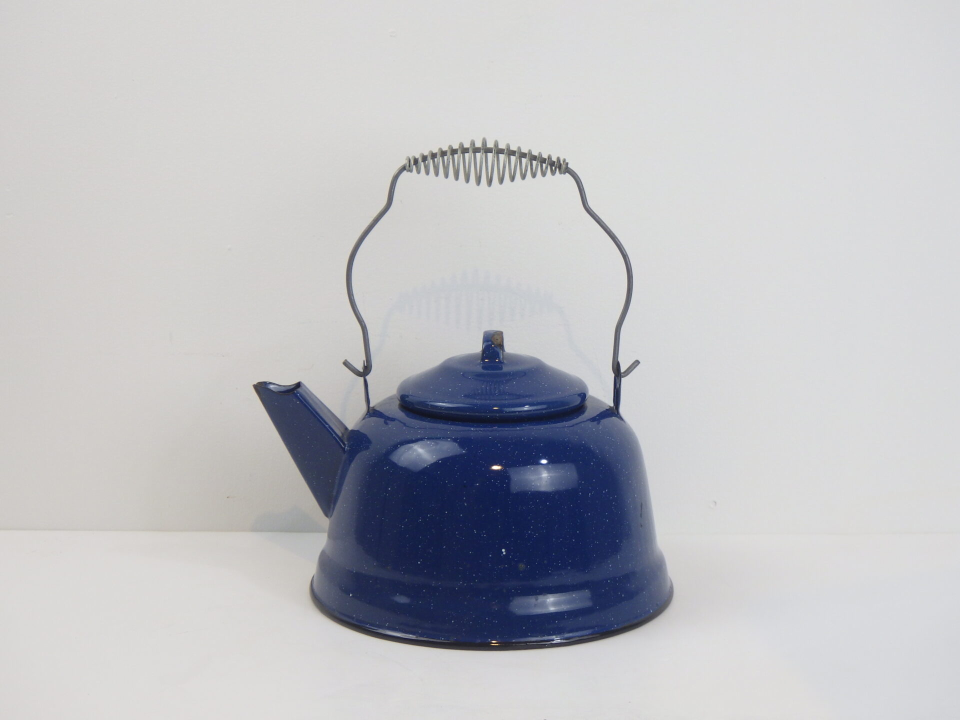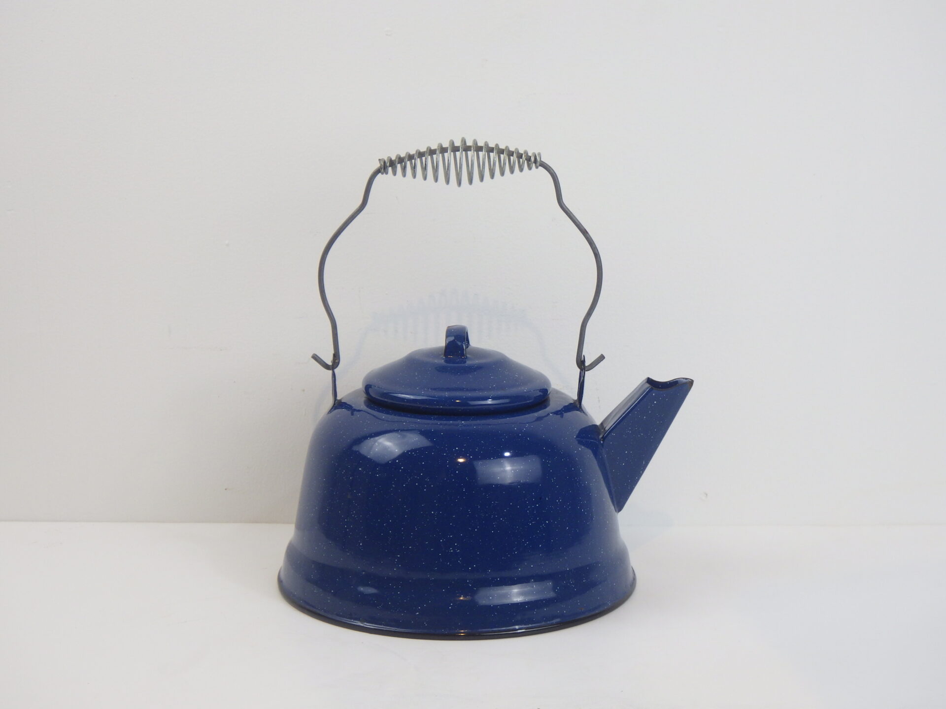 | アメリカで買い付けました。 ブルーのグラニット模様が印象的なエナメルケトルです。 持ち手はスチール製のスプリングになっています。 日常使いはもちろんのこと、キャンプなどのアウトドアシーンでもワンポイントになる可愛さです。 |