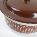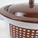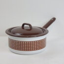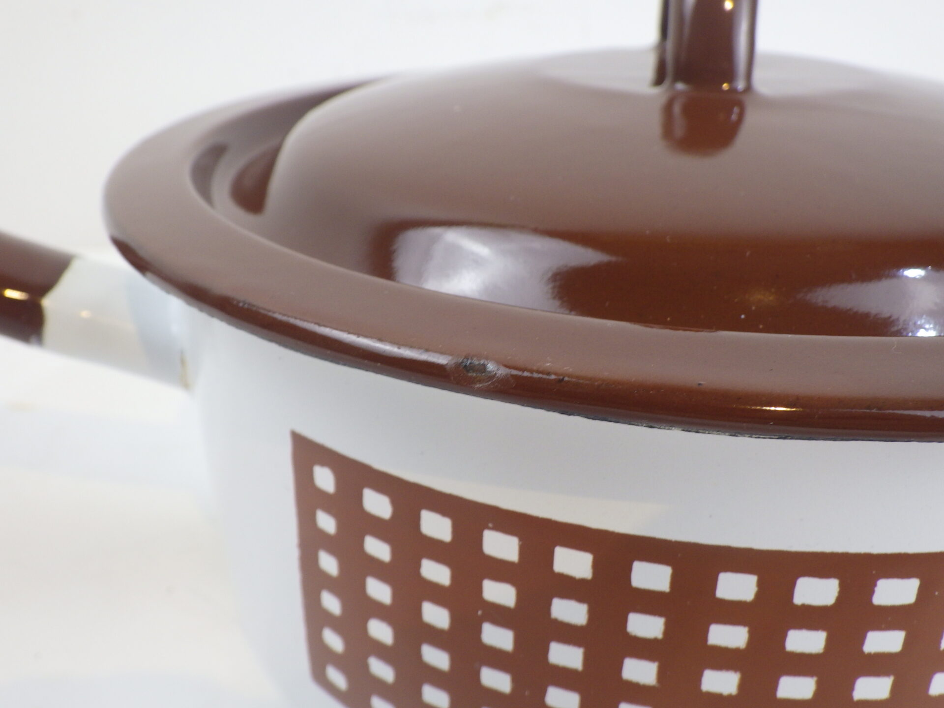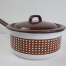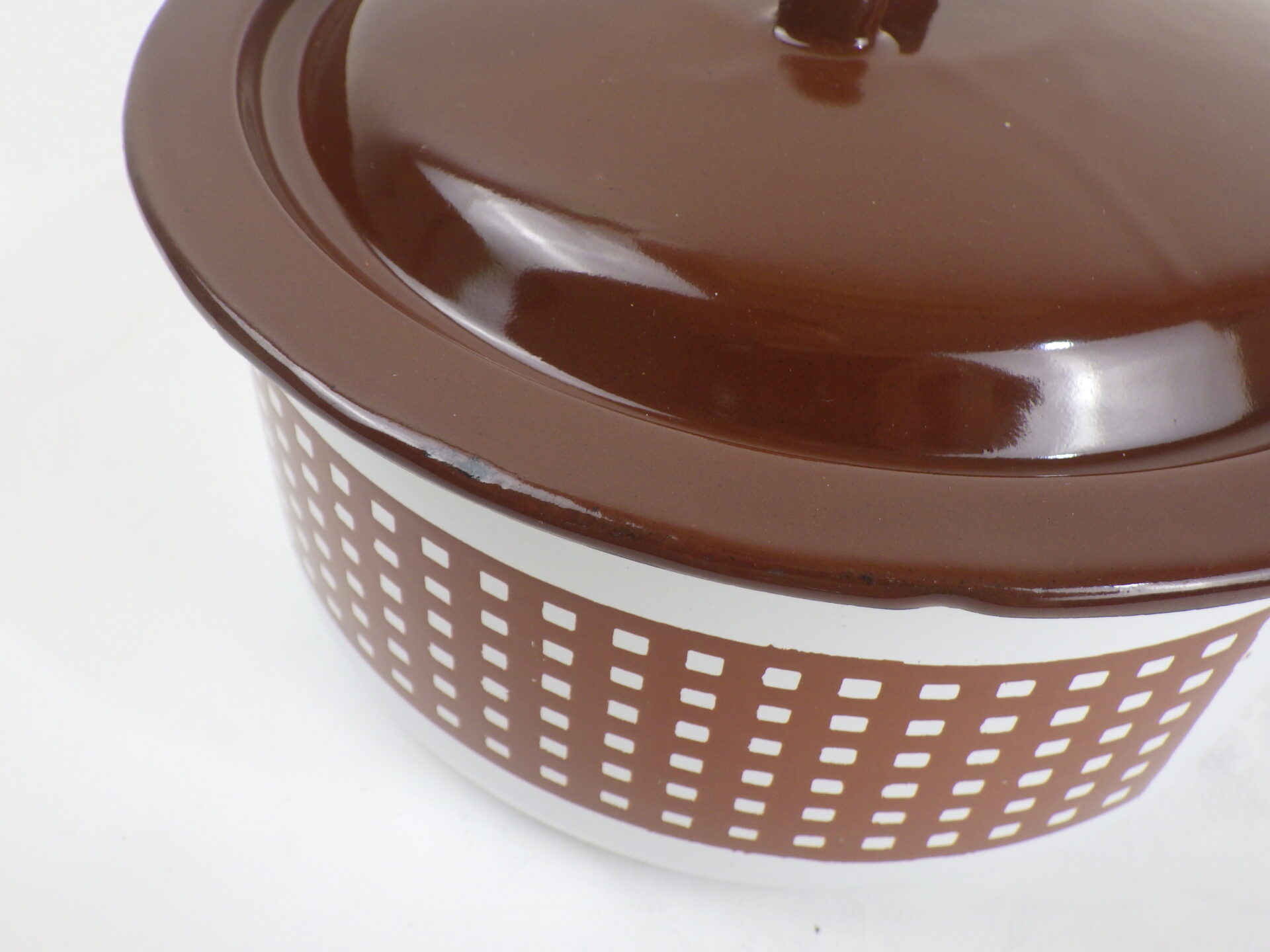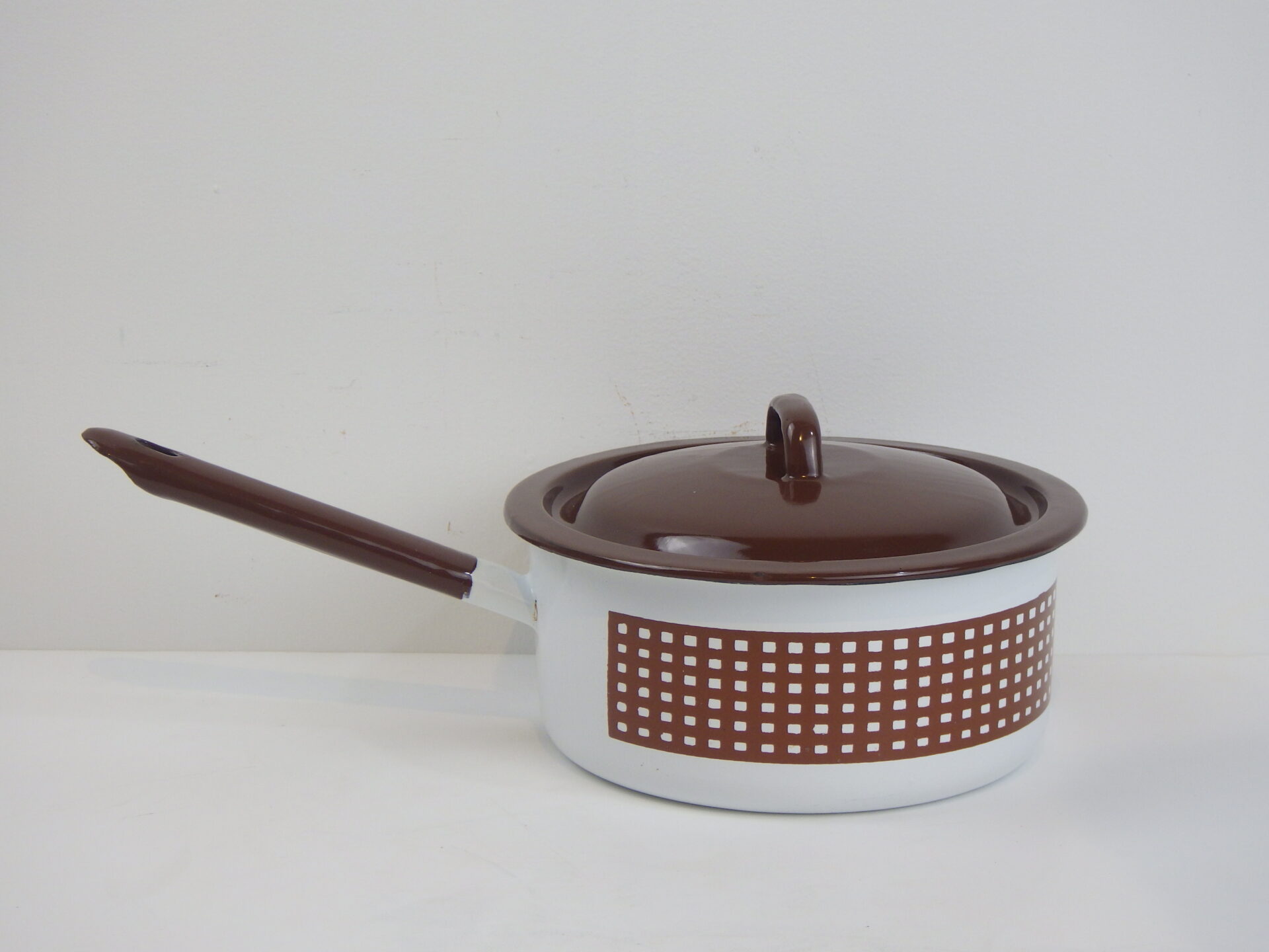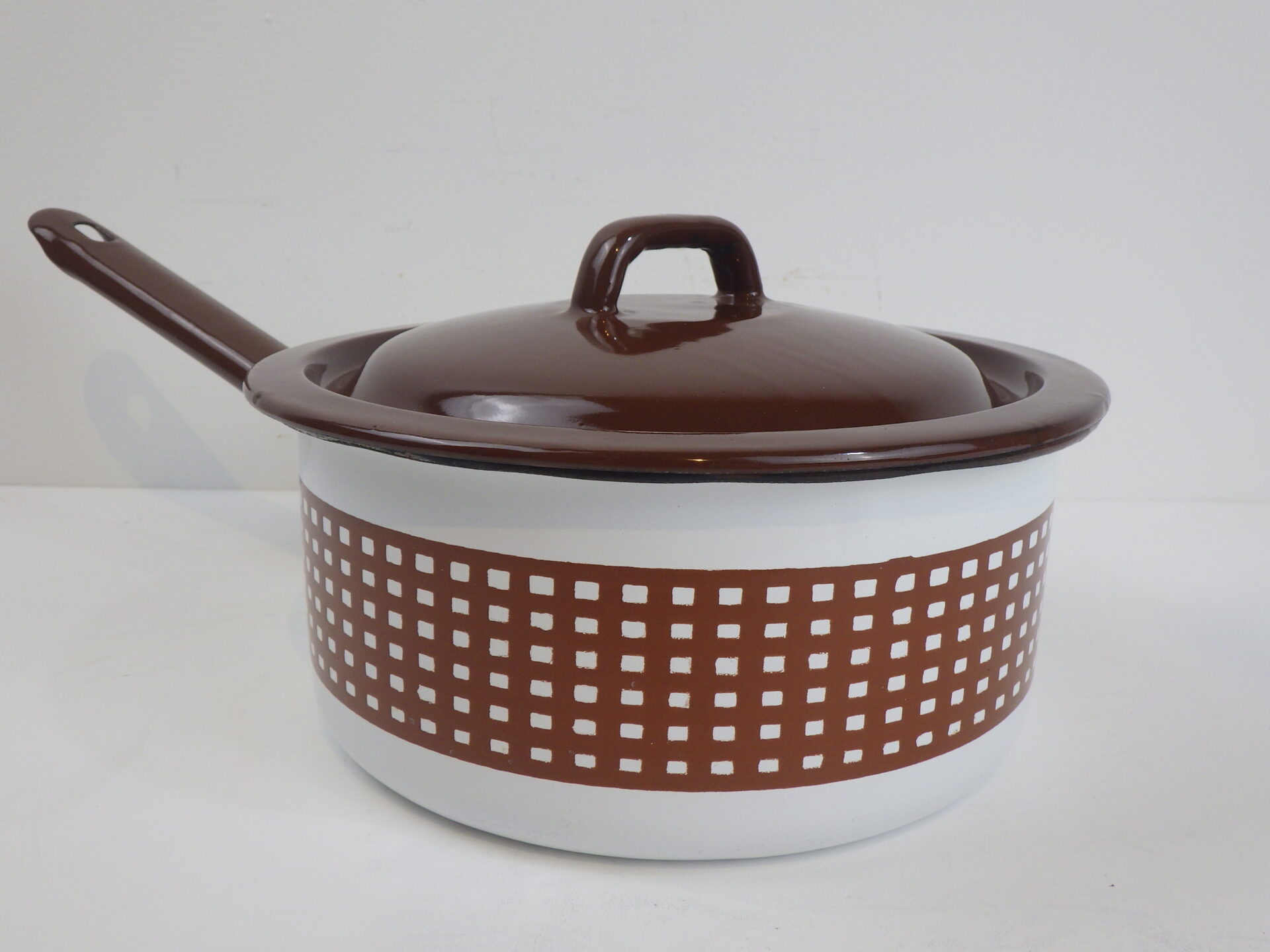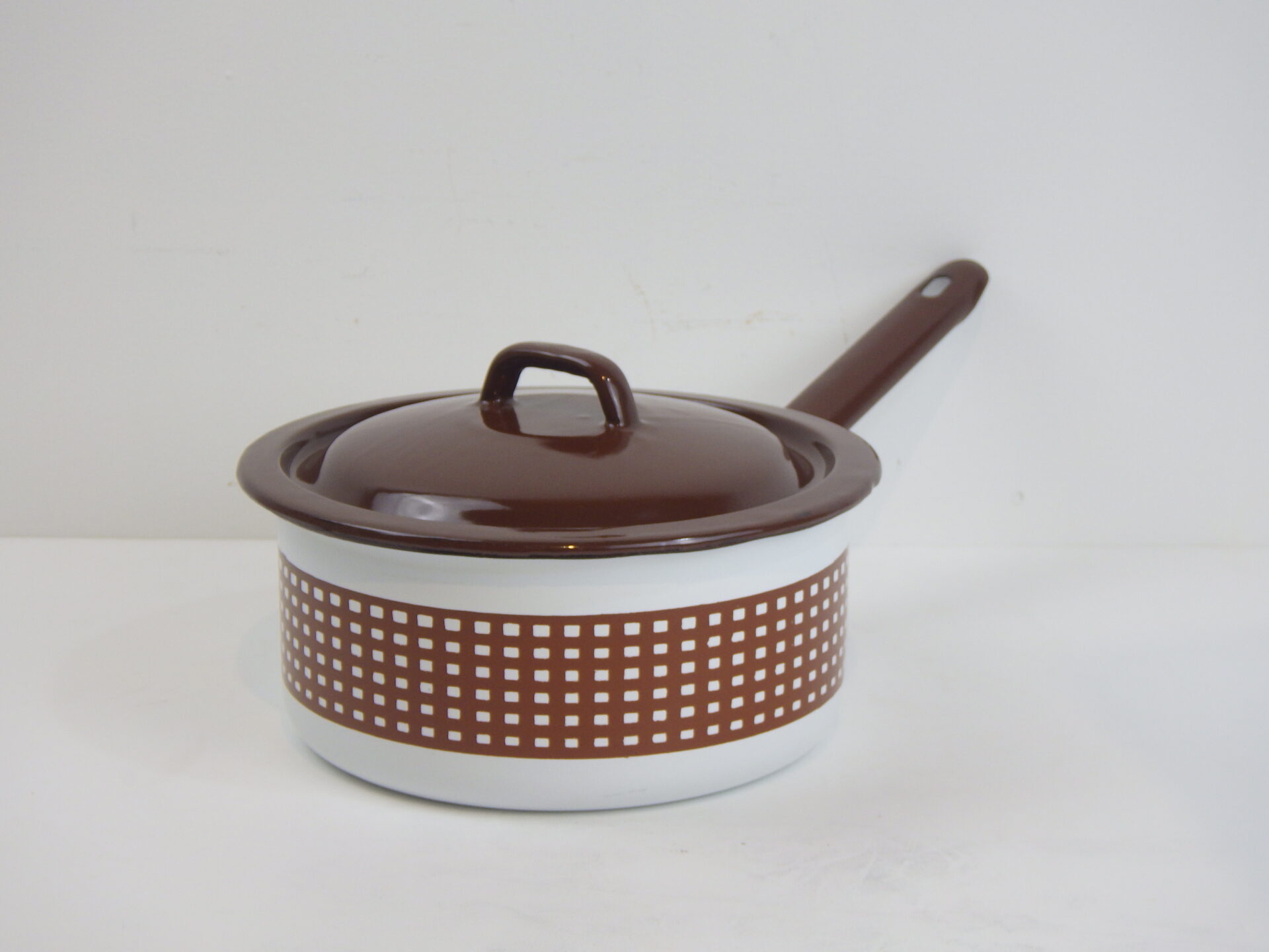 | アメリカで買い付けました。 ビンテージのエナメル鍋です。 「MADE IN POLAND」の刻印があります。 ブラウンのチェックが可愛いシリーズで、コンロの上に置いてあるだけで楽しい気分にさせてくれるアイテムです。 キャンプなどのアウトドアに持ち出しても、サイトのアクセントになってくれそうですね。 |