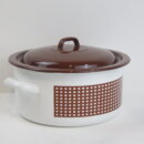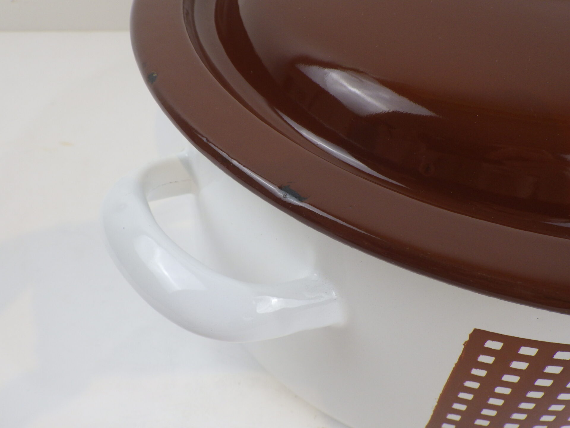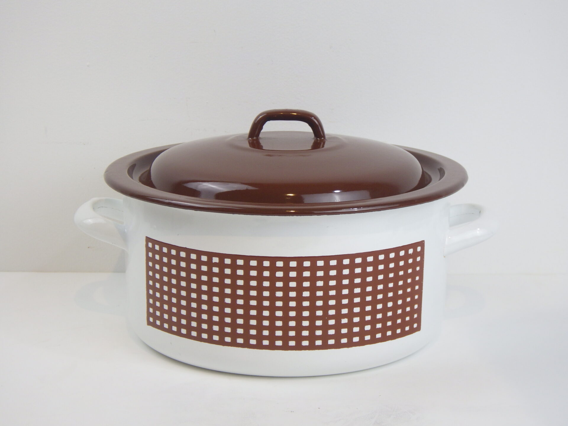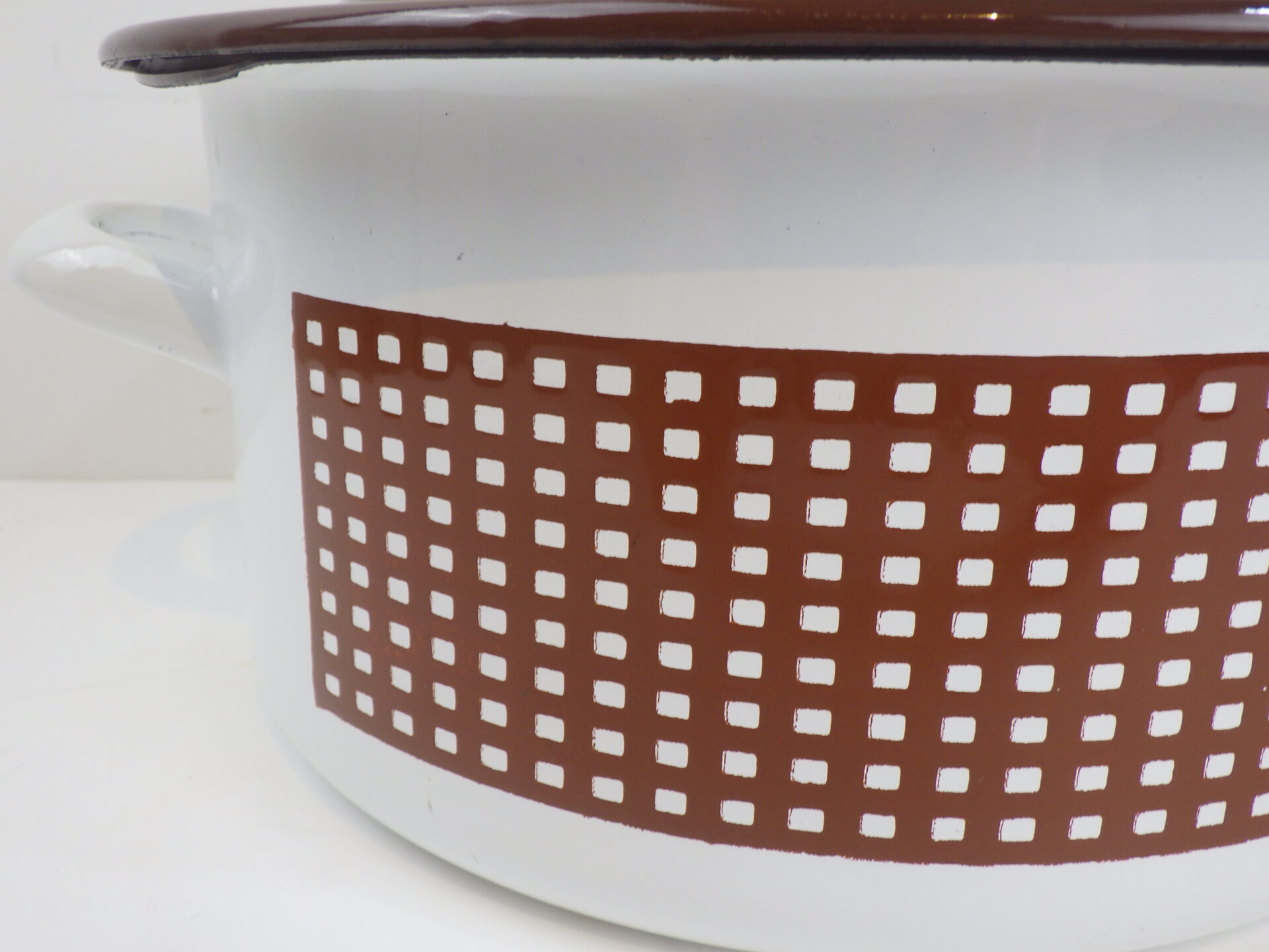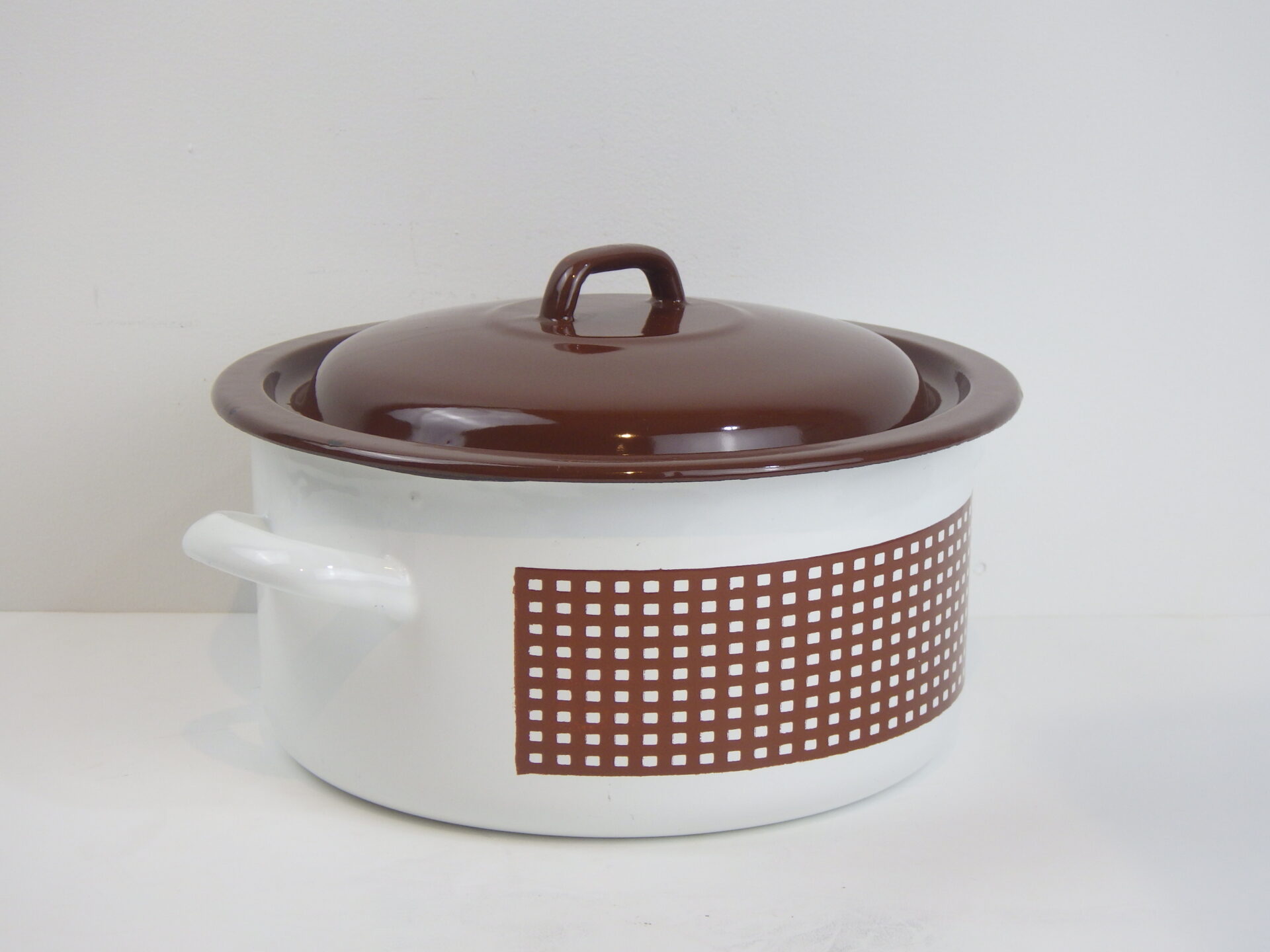 | アメリカで買い付けました、ビンテージのエナメル鍋です。 「MADE IN POLAND」の刻印があります。 ブラウンのチェックが可愛らしく、またおおぶりサイズなのでシチューやカレーなどの煮込み料理に最適です。 ご家族やグループでのキャンプに持ち出しても良いですね。 収納せずにコンロの上に置いておきたい可愛さです。 |