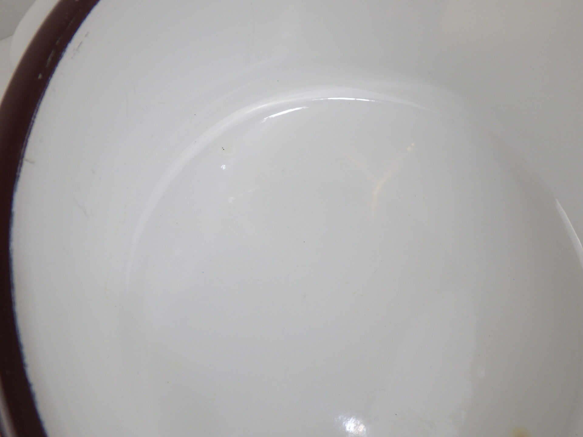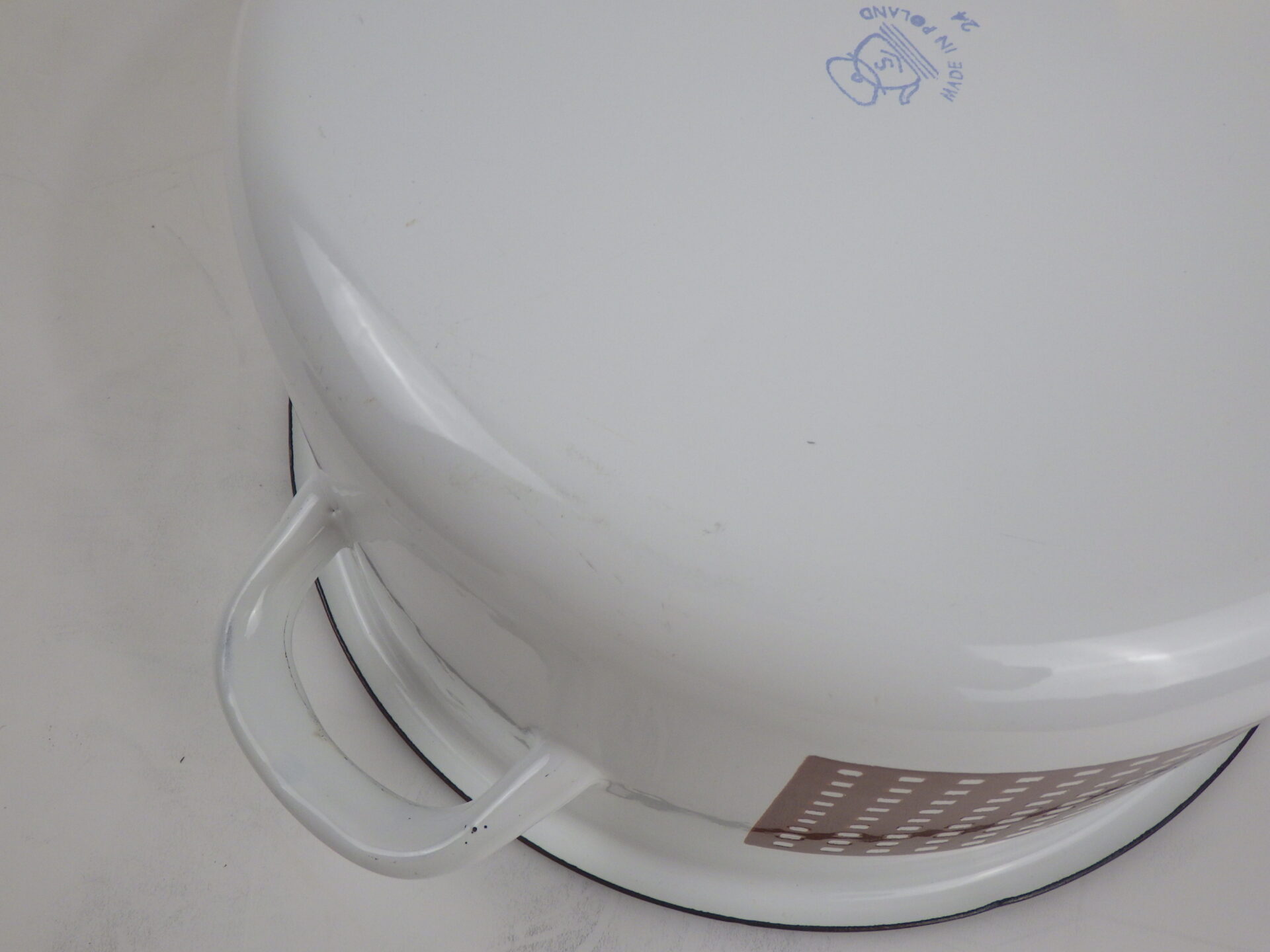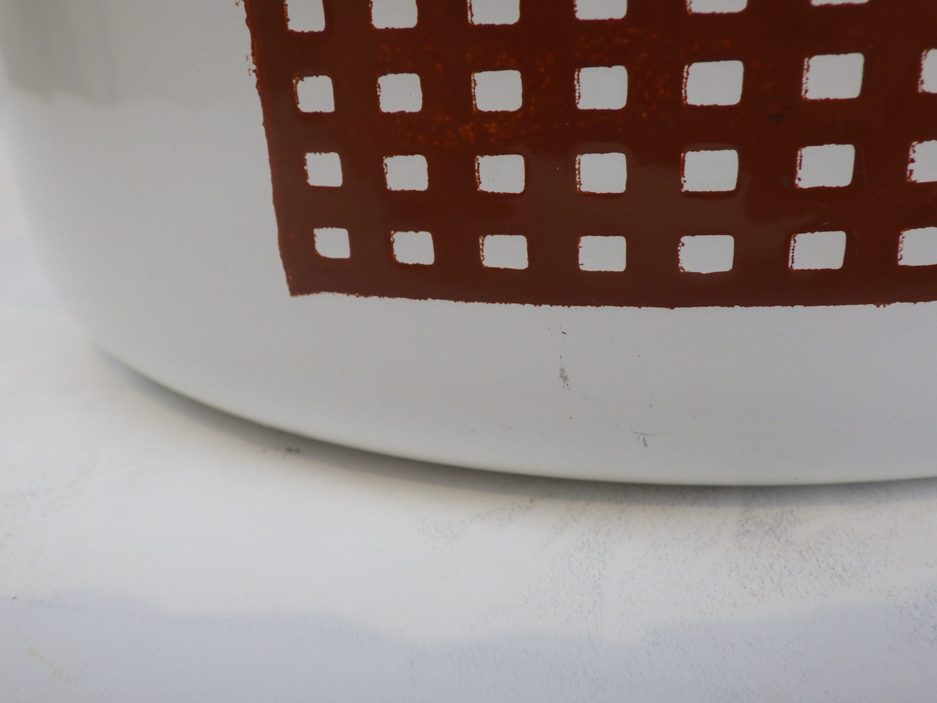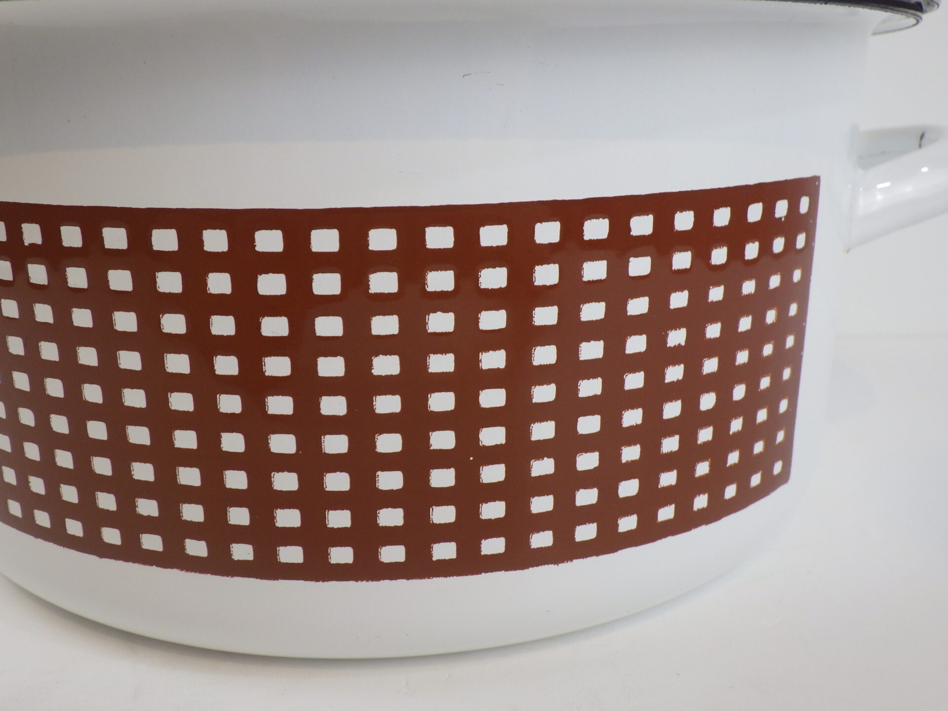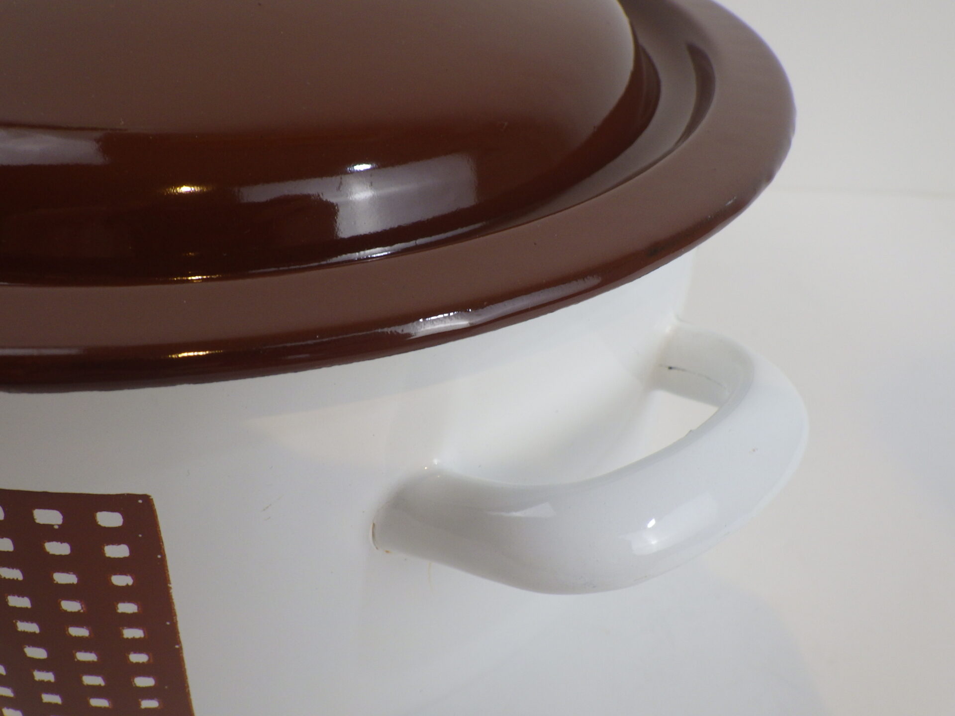 | アメリカで買い付けました、ビンテージのエナメル鍋です。 「MADE IN POLAND」の刻印があります。 ブラウンのチェックが可愛らしく、またおおぶりサイズなのでシチューやカレーなどの煮込み料理に最適です。 ご家族やグループでのキャンプに持ち出しても良いですね。 収納せずにコンロの上に置いておきたい可愛さです。 |