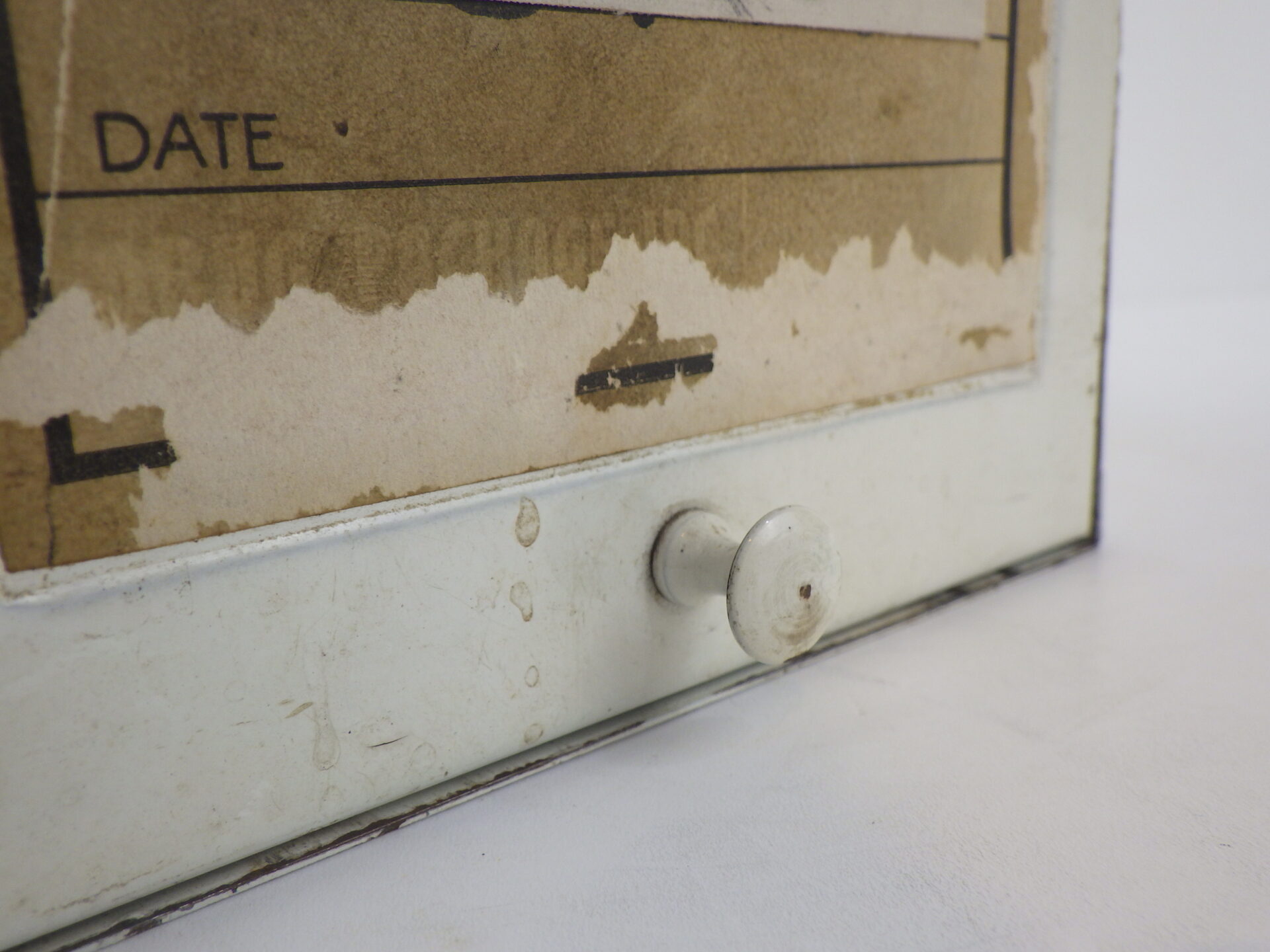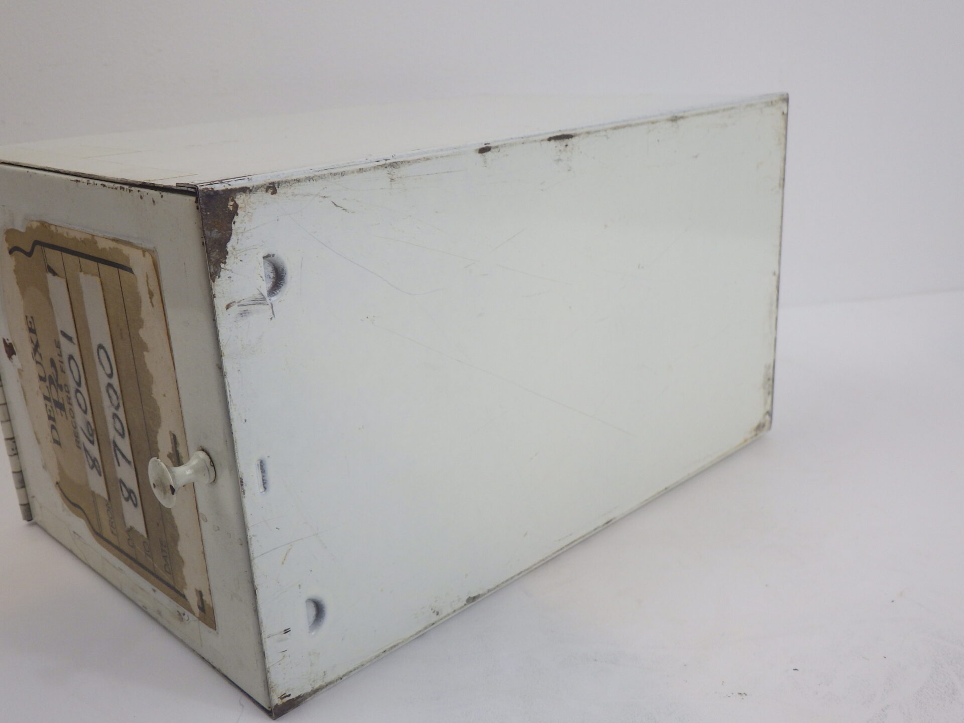 | アメリカで買い付けました。 ファーマーシーなどで患者の処方箋カルテなどの保管に使用されていたボックスです。 ポストのように手前に扉を開けて使います。 メタルのシャビーシックな雰囲気が良いですね。 収納ボックスとしてご家庭で使ったり、店舗什器にして飾ってもオールド感たっぷりで格好良いと思います。 縦に積んだり横に並べたりしてキャビネットのように使っても面白そうです。 |