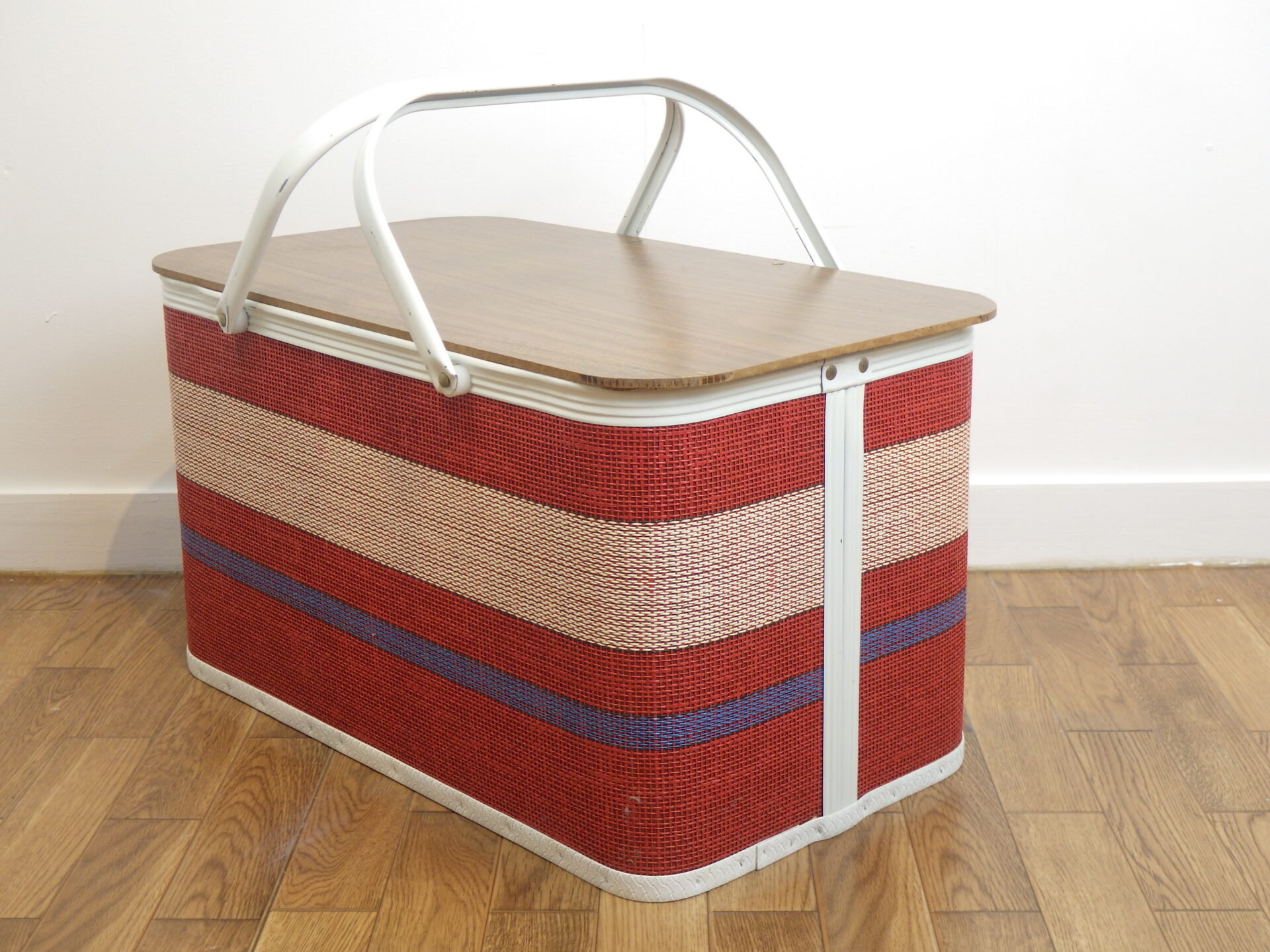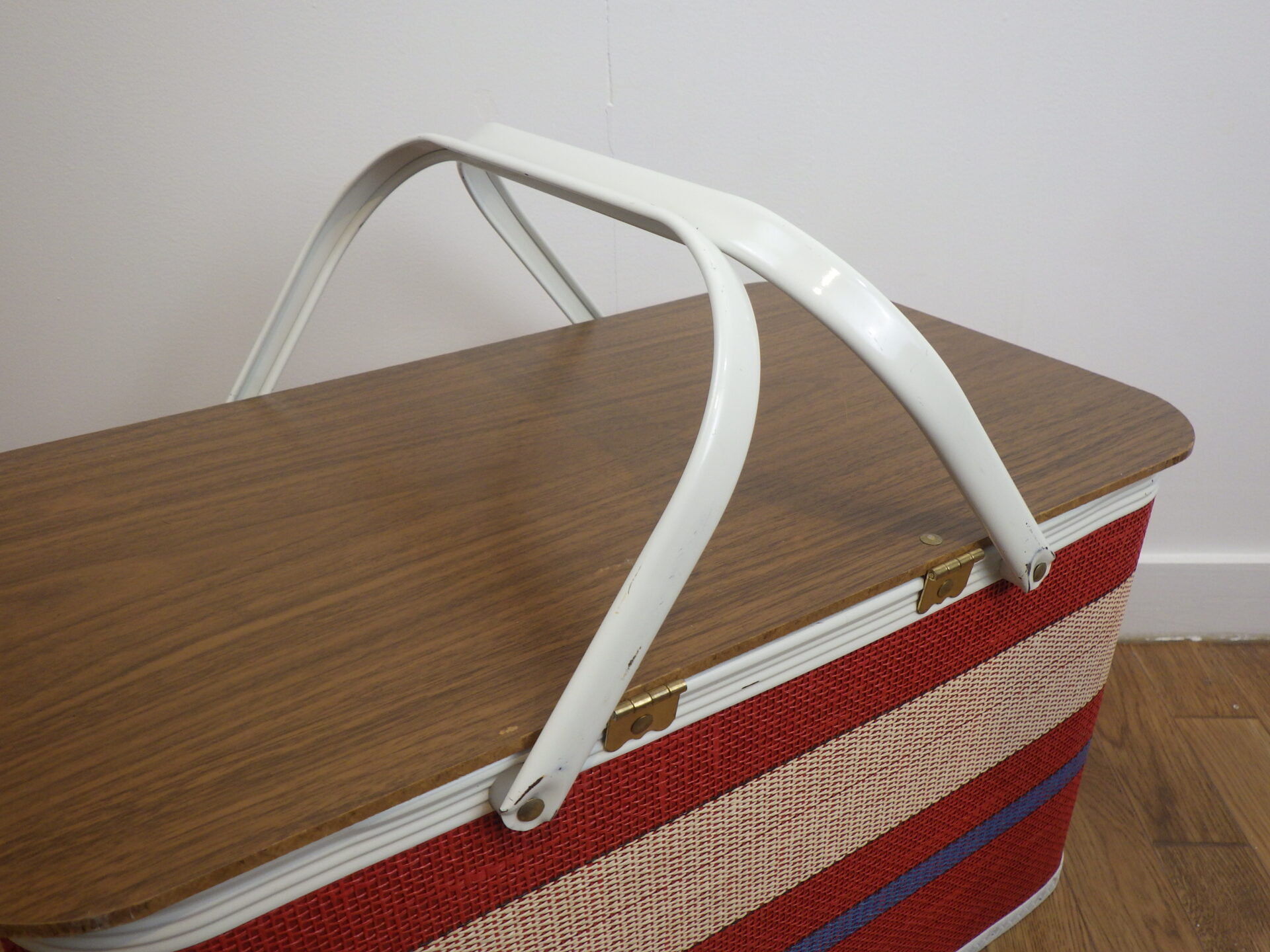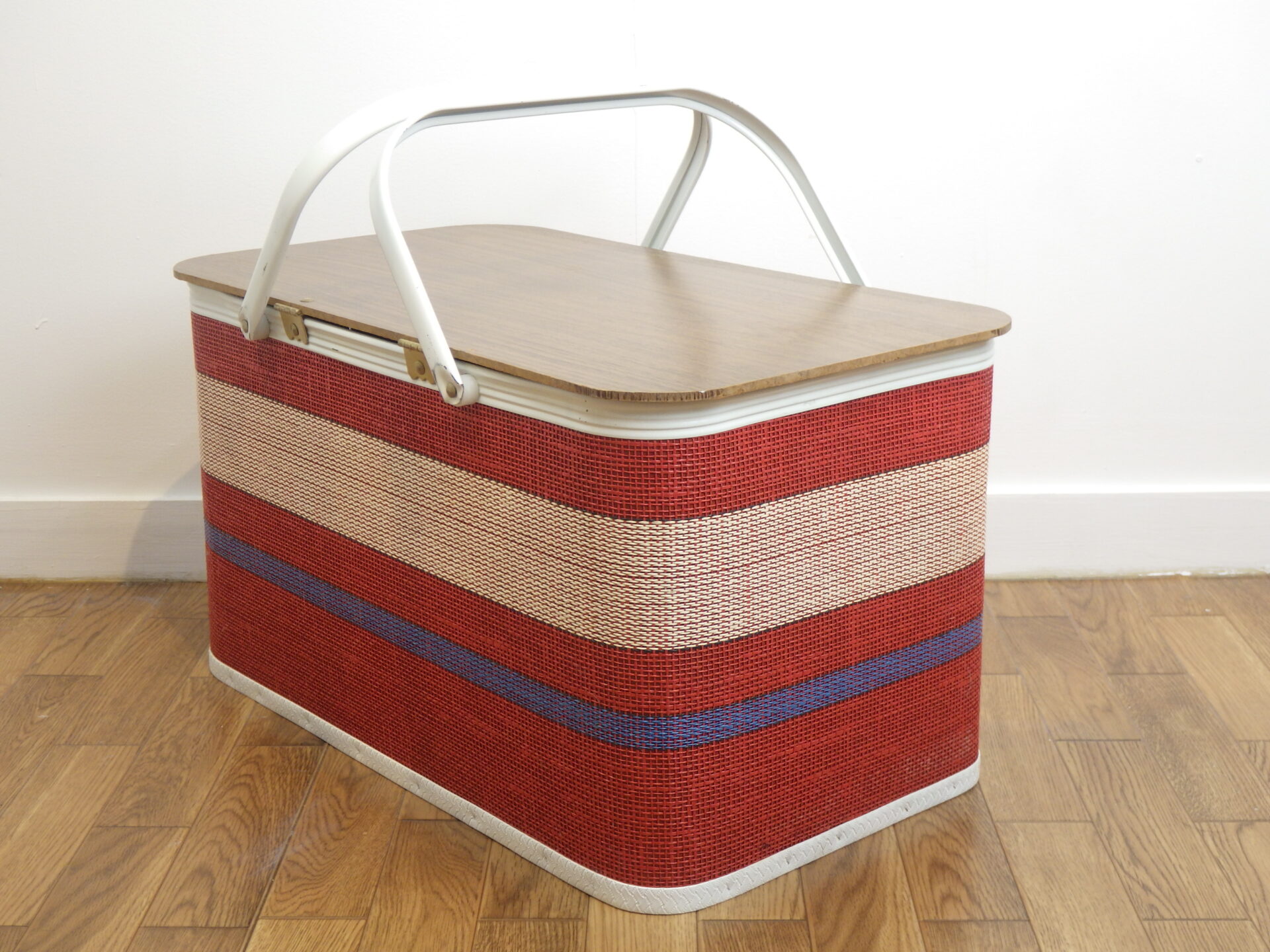 | アメリカで買い付けました。 ビンテージのピクニックバスケットです。 天板がテーブル代わりにもなる優れモノで、キャンプなどのアウトドアに持ち出す方も増えています。 しっかりした作りなので、たくさん荷物を詰め込んでも大丈夫です。 また、ソーイングセットなどを入れてご自宅で収納BOXとしてご使用いただいても良さそうです。 こちらは人気のレッドカラー。赤と言っても落ち着いたテイストなので、インテリアやキャンプサイトにもよく馴染むと思います。 |