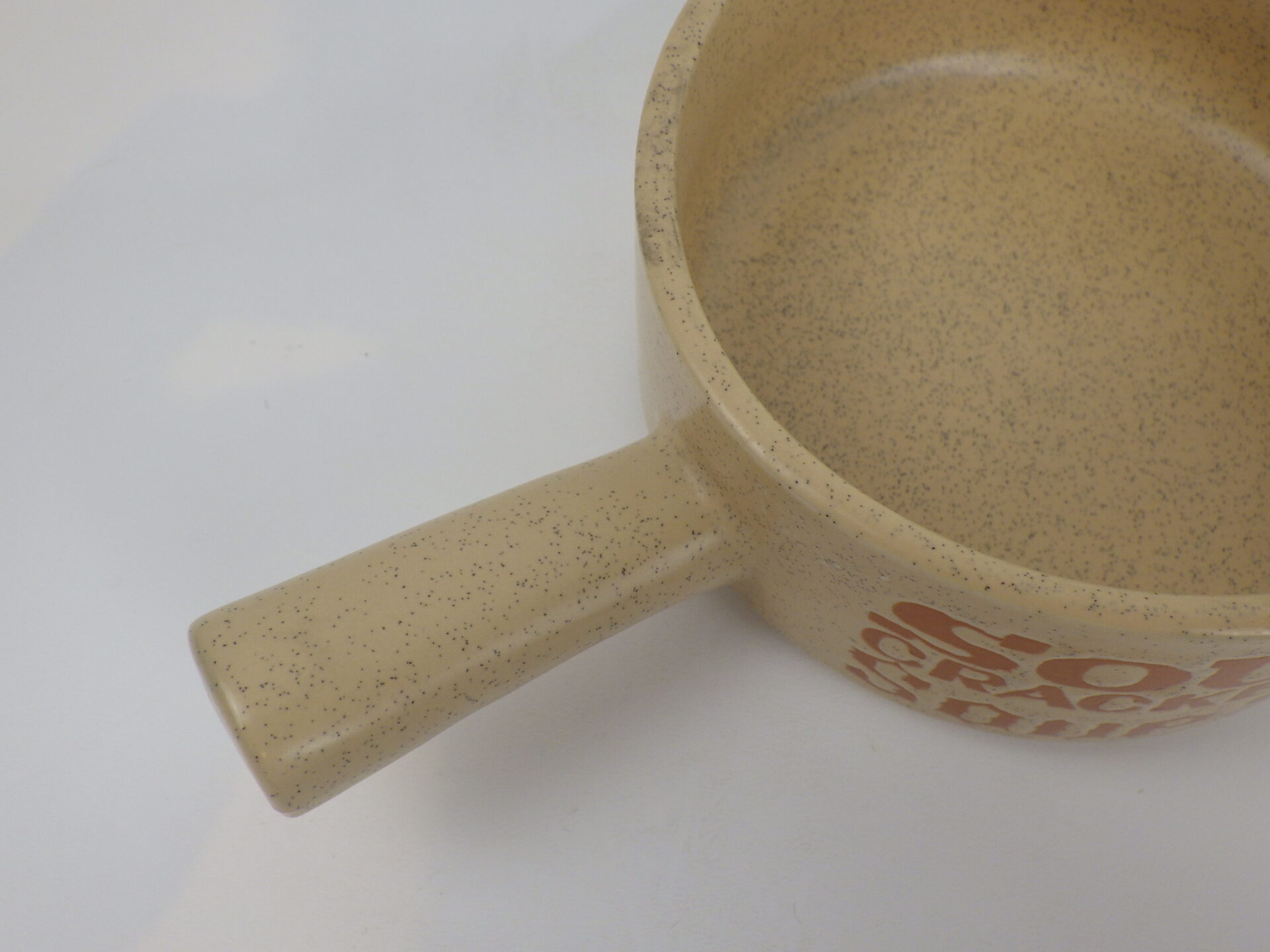 | アメリカで買い付けました。 「スープ&クラッカー」の文字が全面にデザインされた可愛いスープマグ。 こちらは珍しいワンハンドルバージョンです。 大きめサイズなので、ポトフなどゴロゴロ具材が入ったスープやシチューなどにもお使いいただけます。 JAPANの刻印がありますが、当時アメリカ向けに輸入品として製造されていたようです。 |