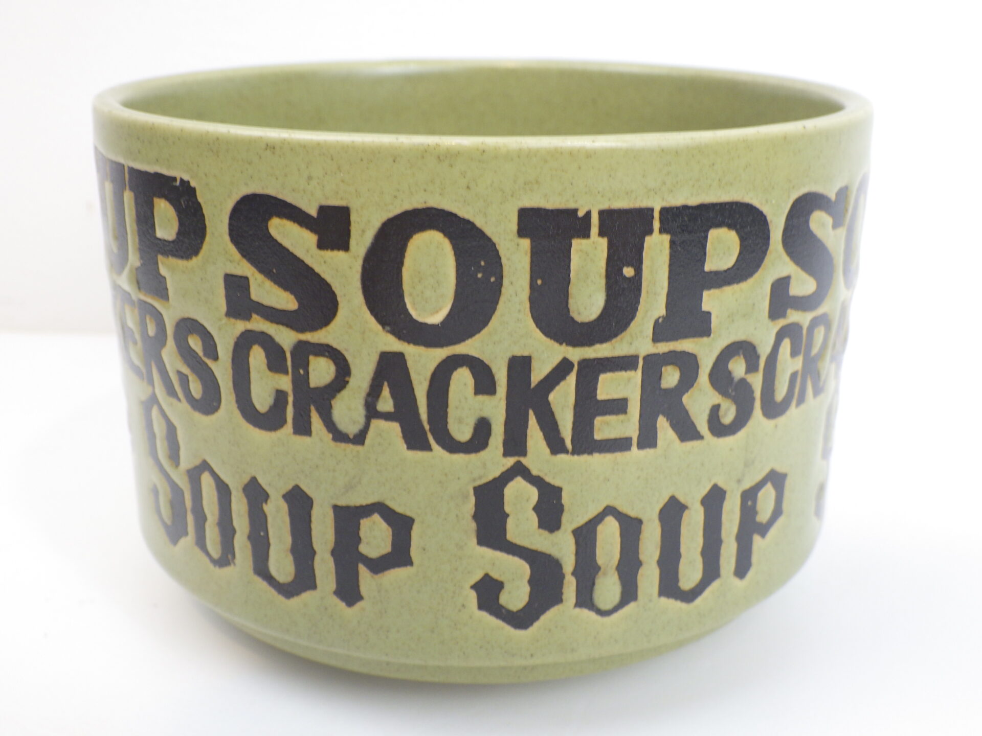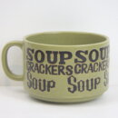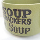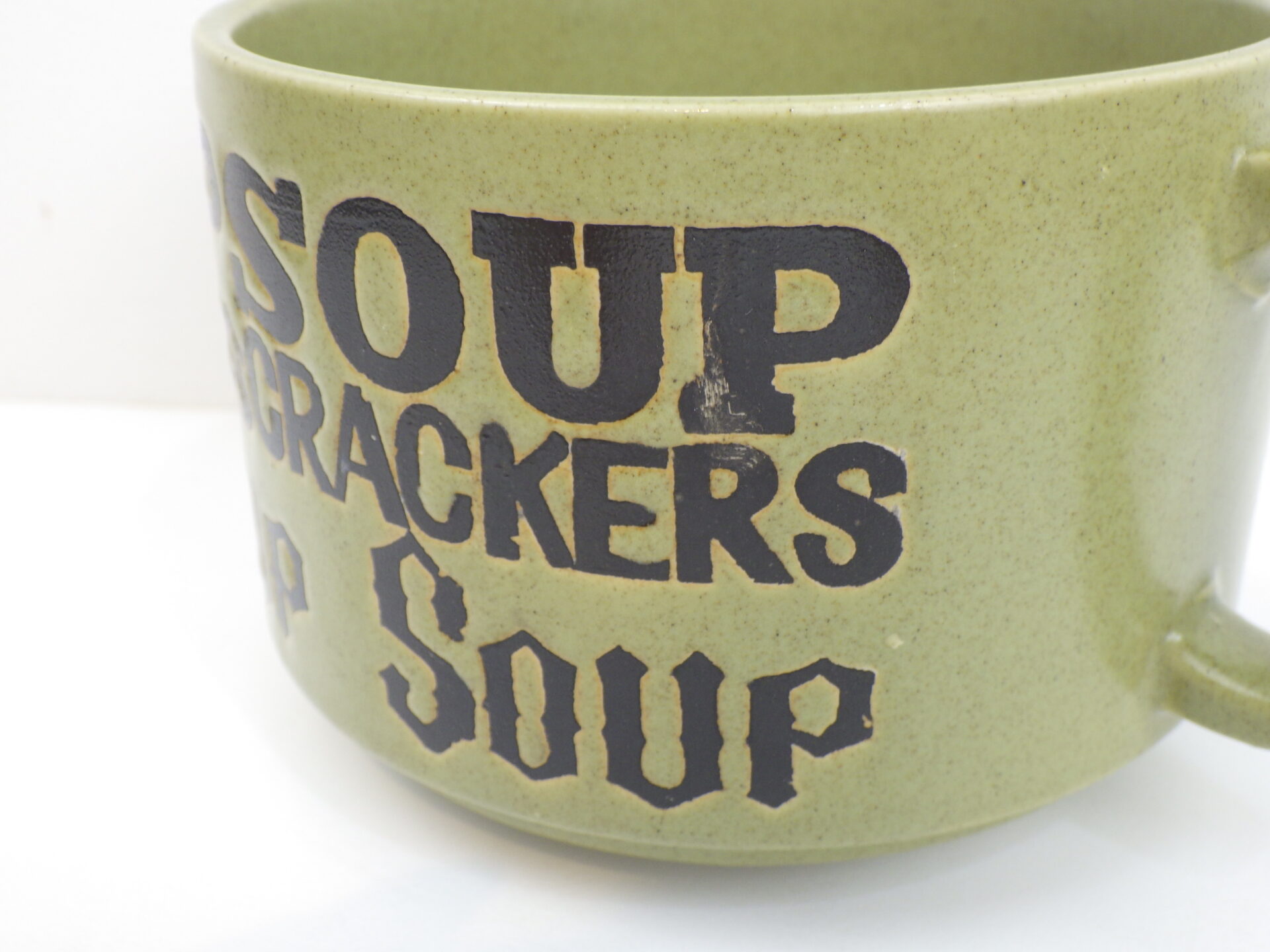 | アメリカで買い付けました。 「スープ&クラッカー」の文字が全面にデザインされた可愛いスープマグです。 大きめサイズなので、ポトフなどゴロゴロ具材が入ったスープやシチューなどにもお使いいただけます。 裏面にJAPANの刻印がありますが、当時アメリカ向けに輸入品として製造されていたようです。 |