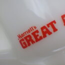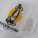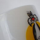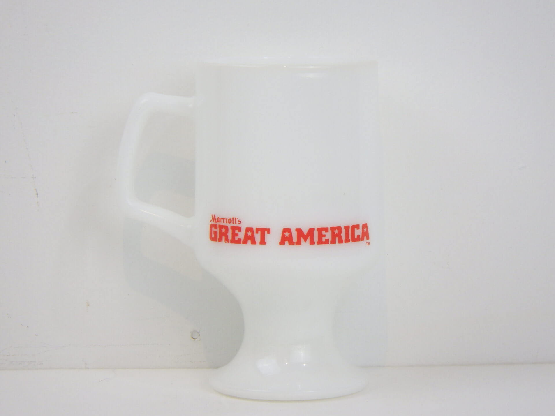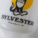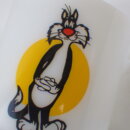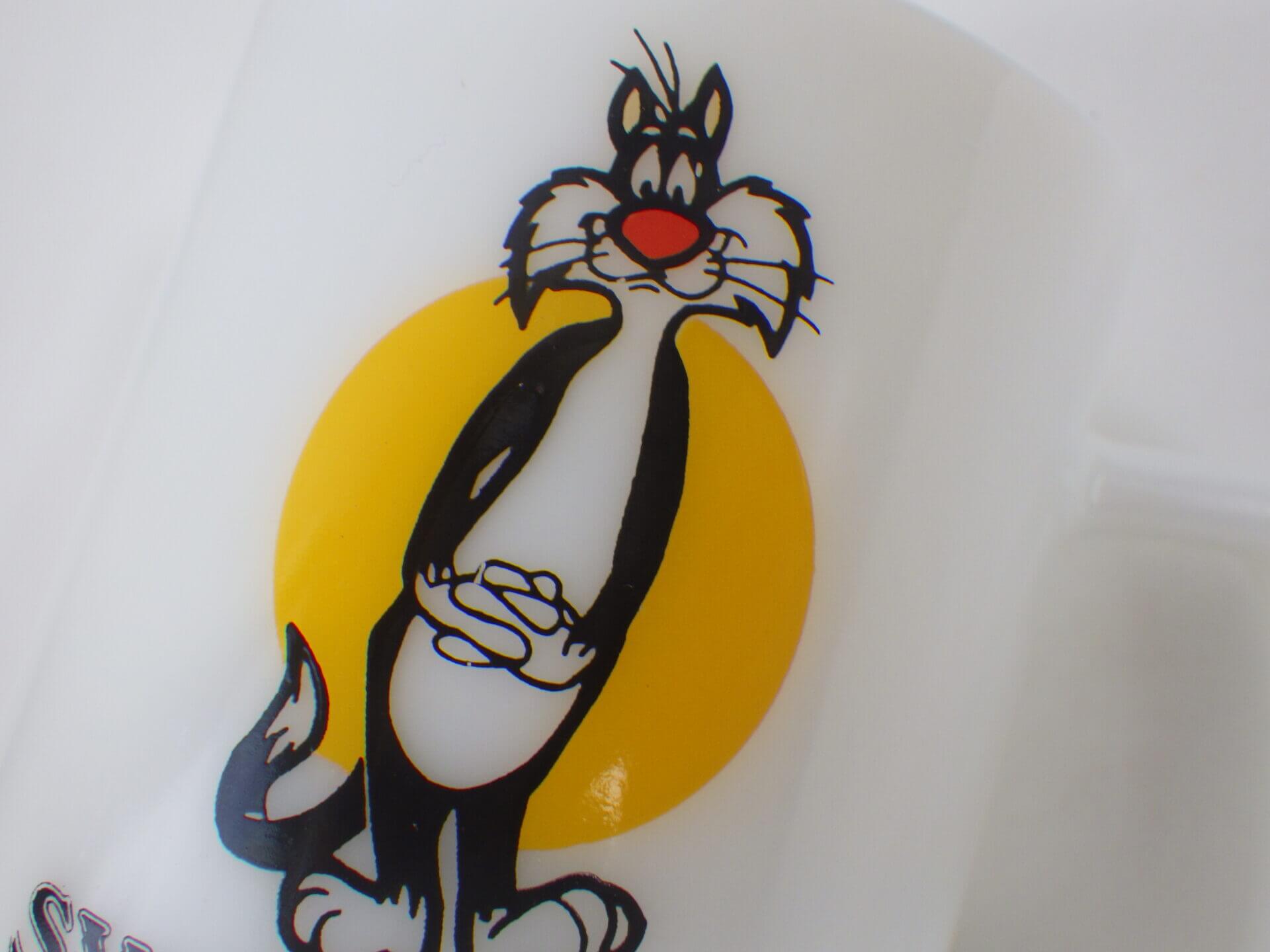 | 1900年創業、フェデラル社のミルクガラスタンブラーです。 ワーナーブラザーズ、ルーニー・テューンズの中でも人気のキャラクター、トゥイーティーをいつも追い掛け回している「シルベスター・キャット」がプリントされています。 こちらはマリオット社の遊園地「マリオット・グレートアメリカ」の開園記念で製造されました。 容量も大き目なので、ビールなどのアルコールにも最適です。 |