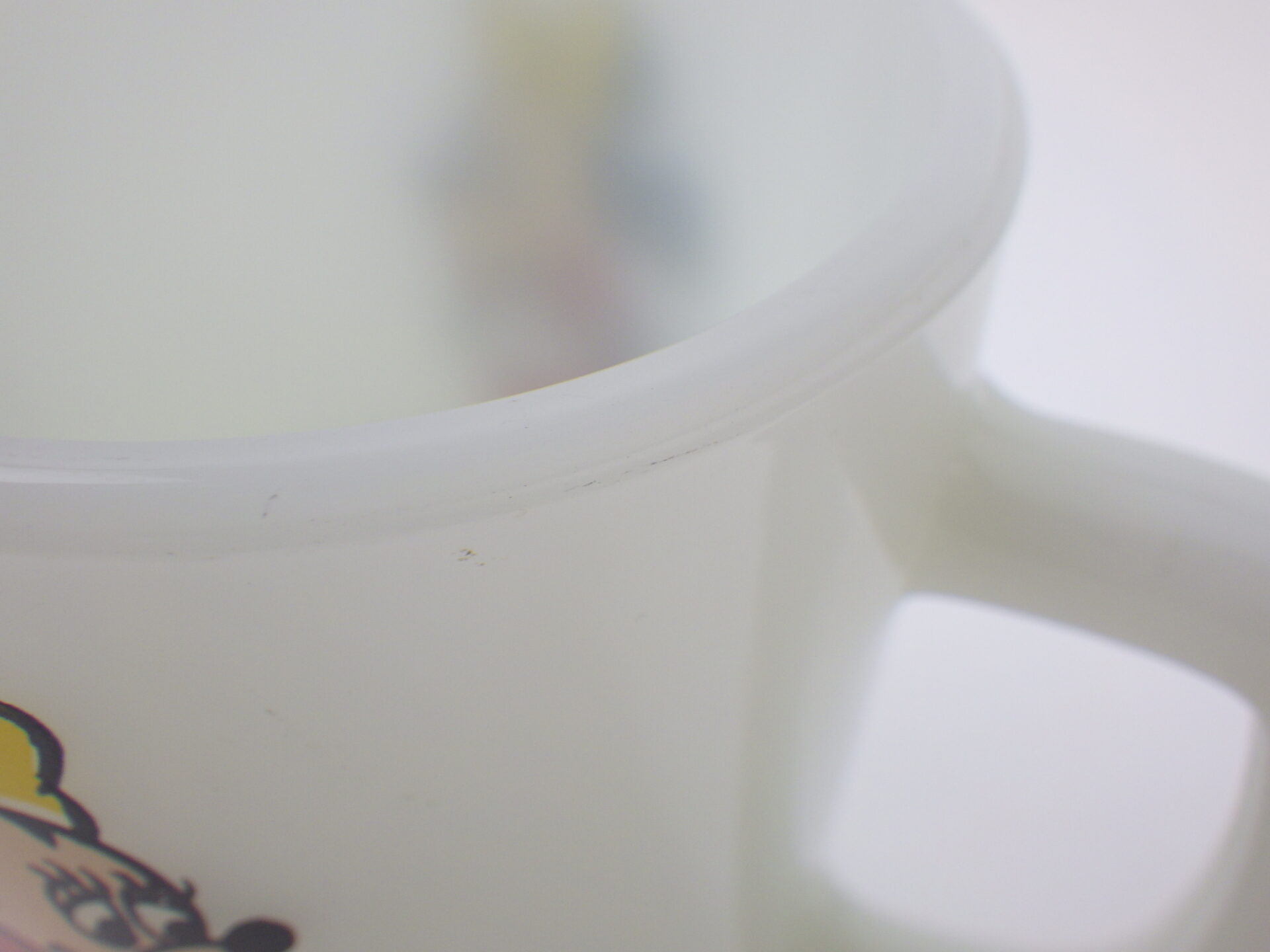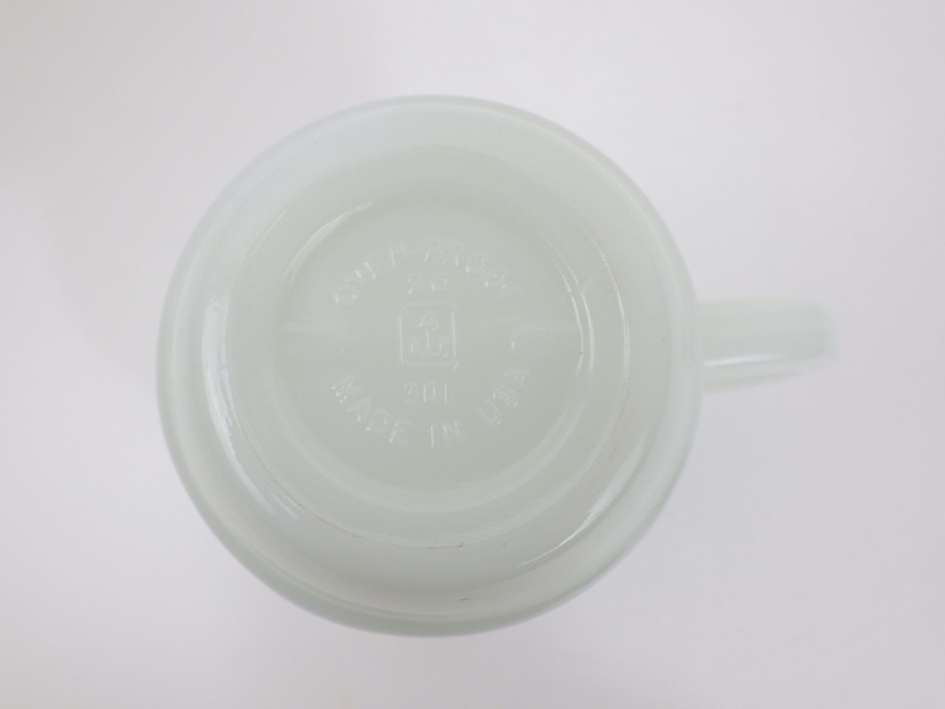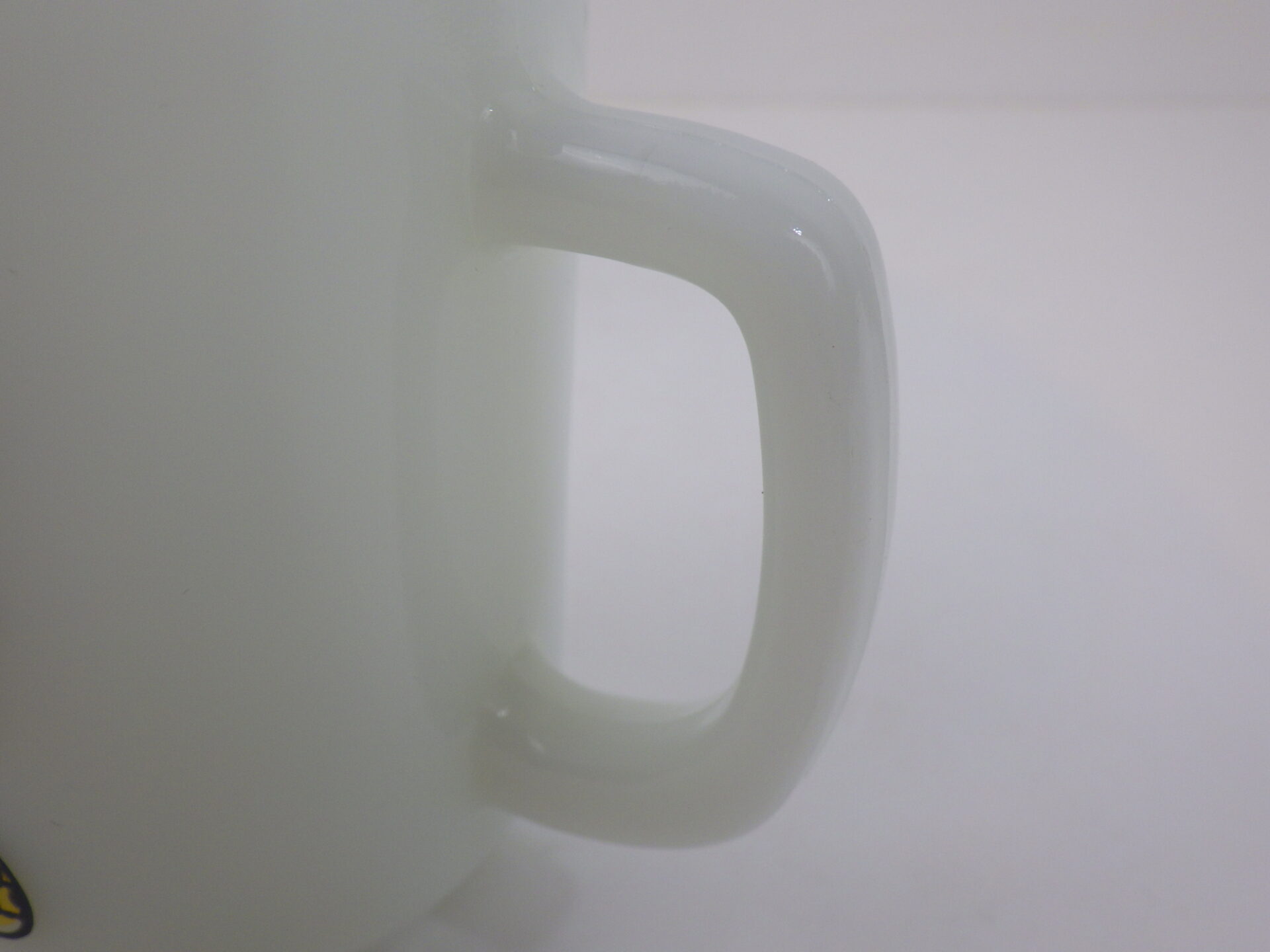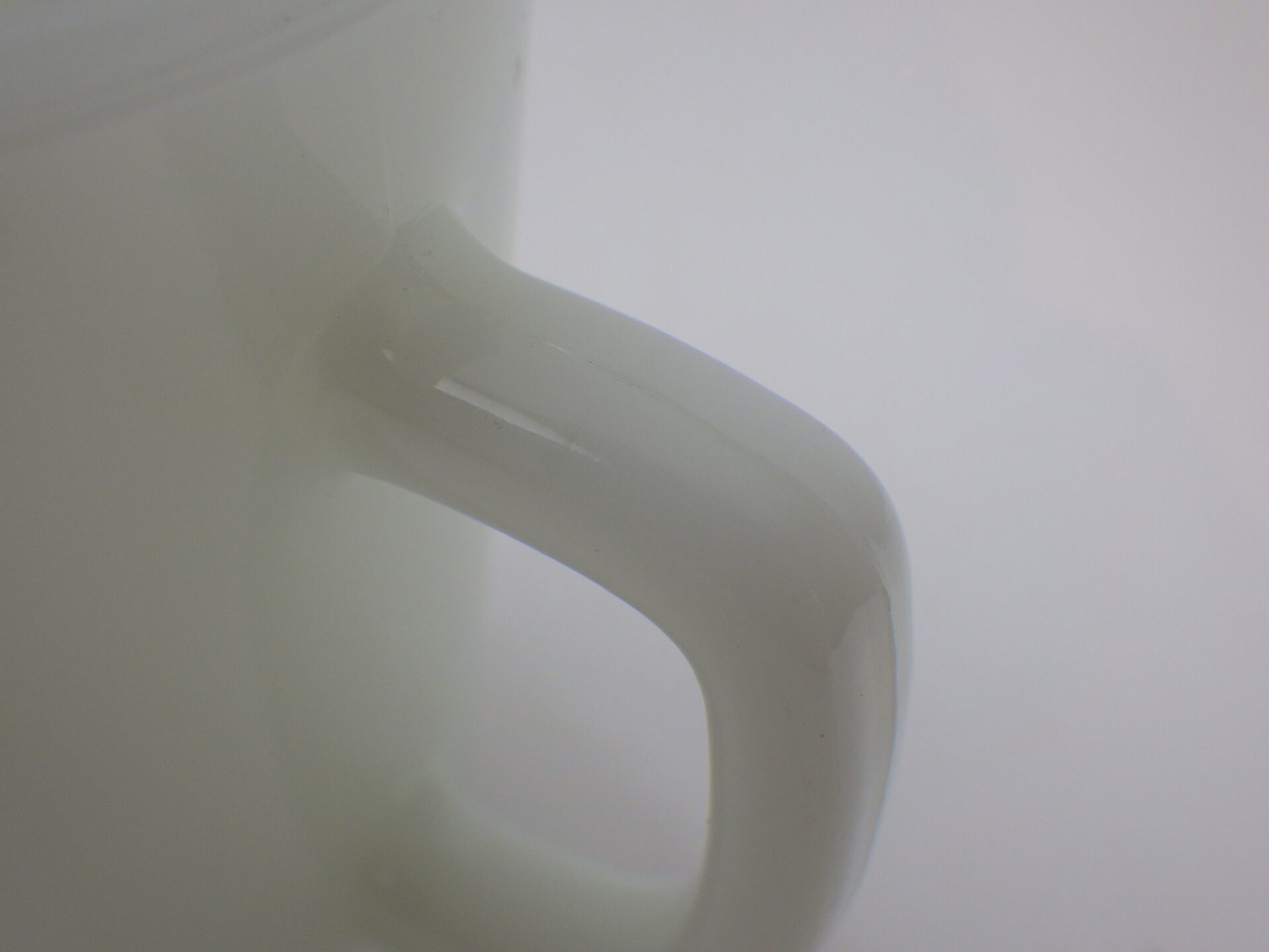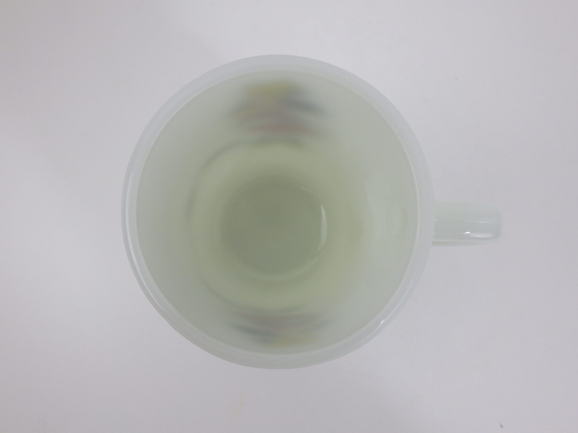 | condition | リム、ボトムにわずかなスレ、薄い着色があります。 リムに製造時よりのわずかながたつきがあります。 ハンドルに薄い着色があります。 ミルクガラス特有の製造時よりのヘアライン、ガラスのヨレなどありますが、ご使用に影響はありません。 その他ワレ、カケなく、ツヤもあり良い雰囲気です。 |