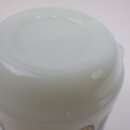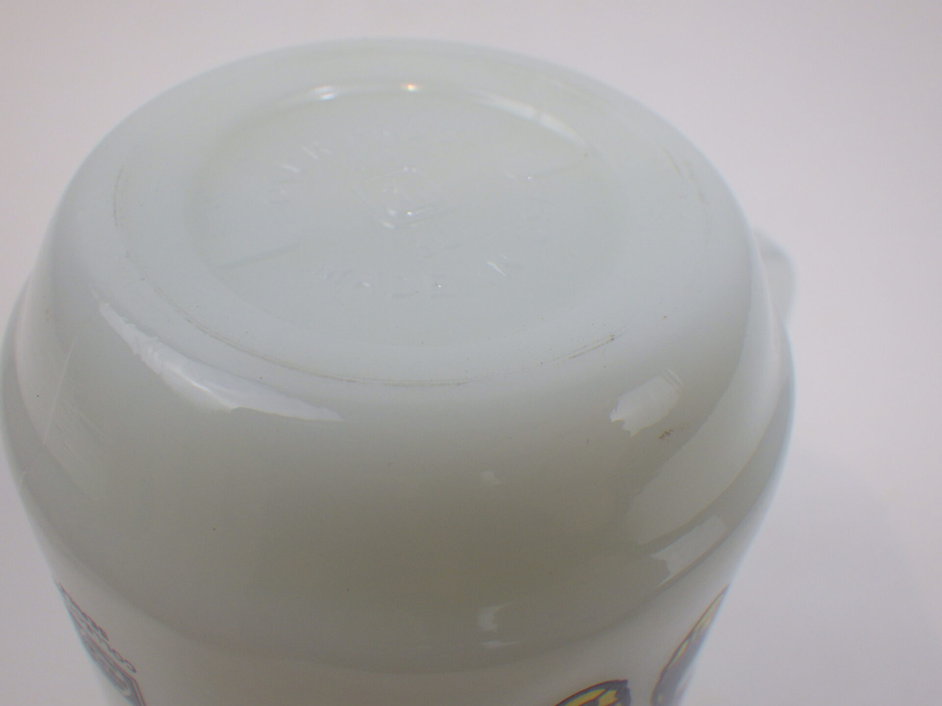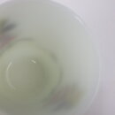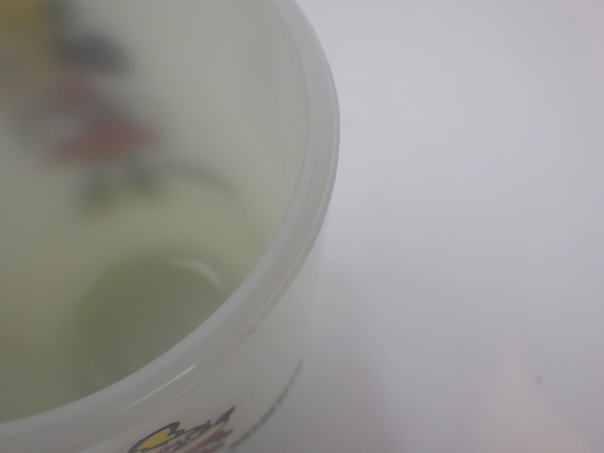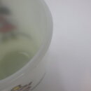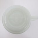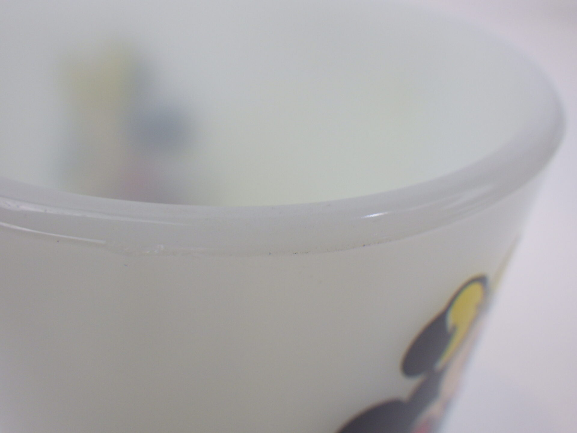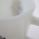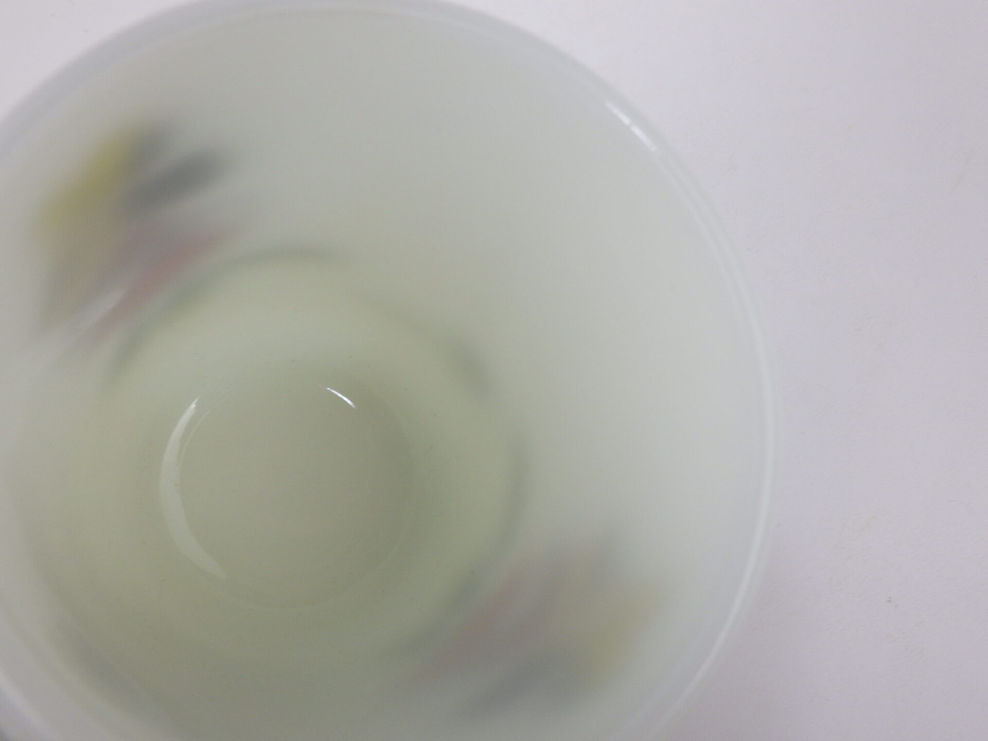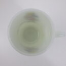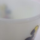 | condition | リム、ボトムにわずかなスレ、薄い着色があります。 リムに製造時よりのわずかながたつきがあります。 ハンドルに薄い着色があります。 ミルクガラス特有の製造時よりのヘアライン、ガラスのヨレなどありますが、ご使用に影響はありません。 その他ワレ、カケなく、ツヤもあり良い雰囲気です。 |