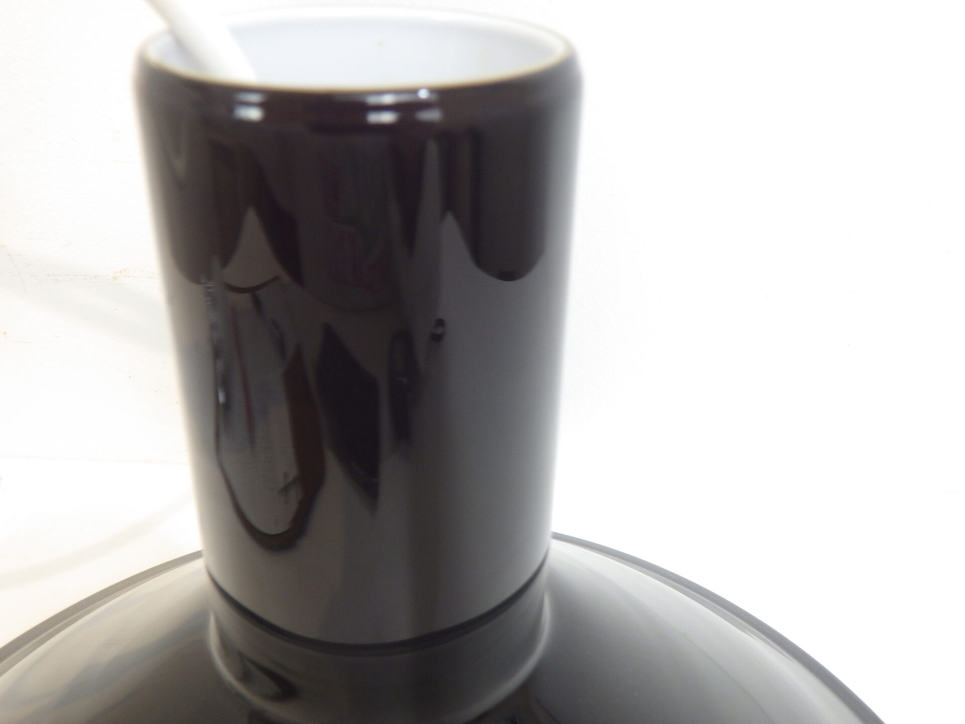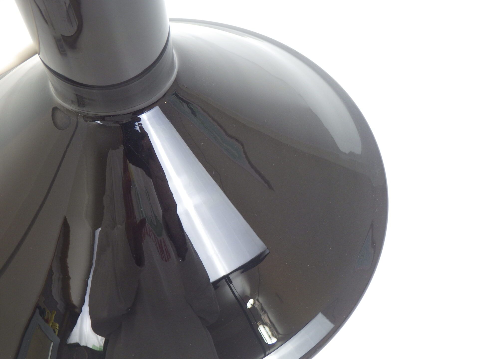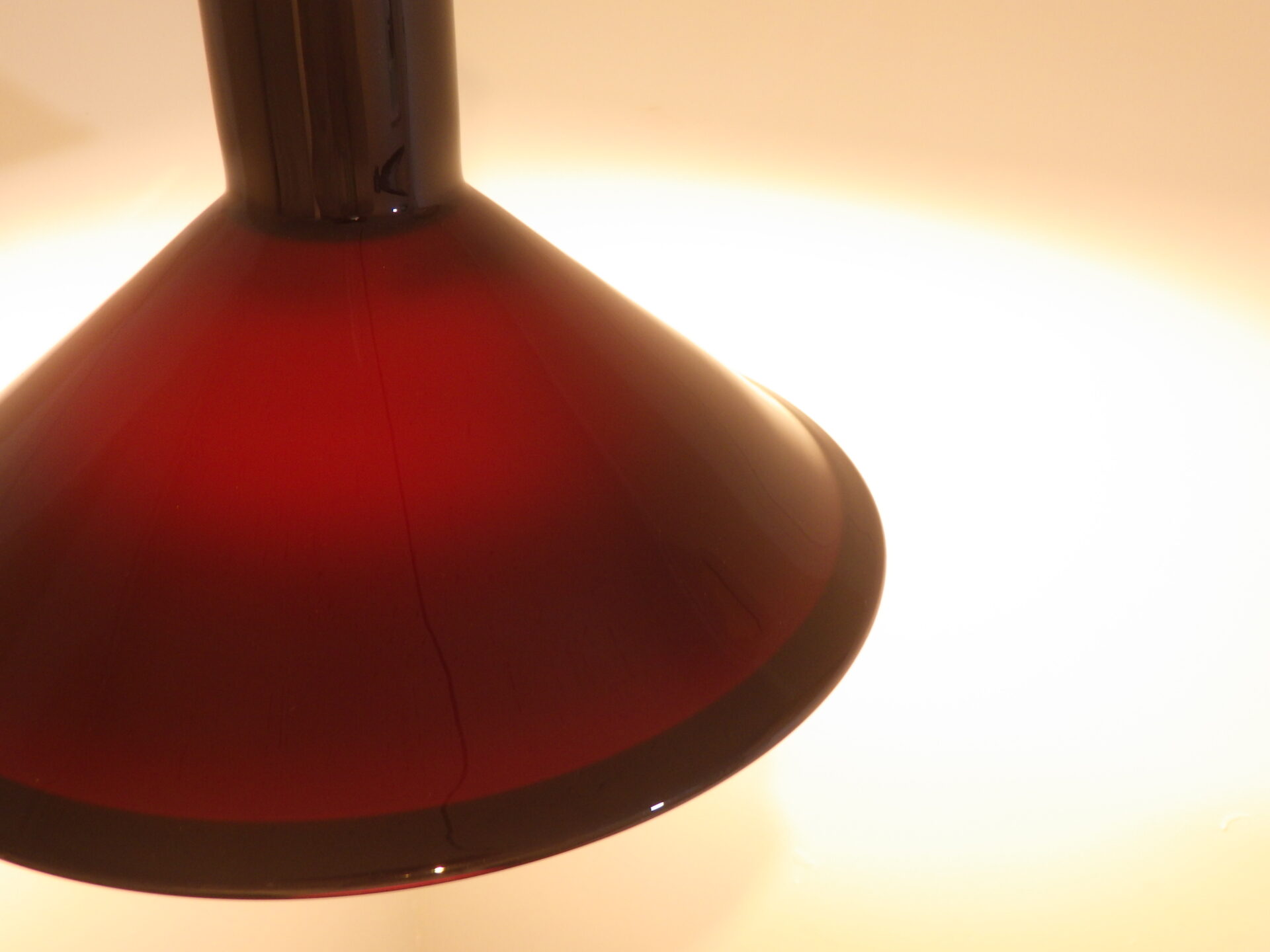 | ヨーロッパで買い付けました。 デンマークのHolmegaard社製のペンダントランプです。 1972年にMichael Bangによってデザインされました。 シェードがガラスの二層構造になっていて、表面は赤(かなりダークトーンなので、黒に近い茶に見えます)、内側は乳白色になっています。 そのため点灯時は、表側はほんのりボルドーカラーに光りますが、シェードの下は白く反射して綺麗に電球の色が広がります。 ホルムガードはロイヤルコペンハーゲンによって買収され、現在はその傘下におさまっていますが、ガラス照明の生産を中止していますので、ビンテージでしか入手出来ないアイテムとなっています。 |