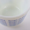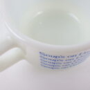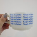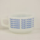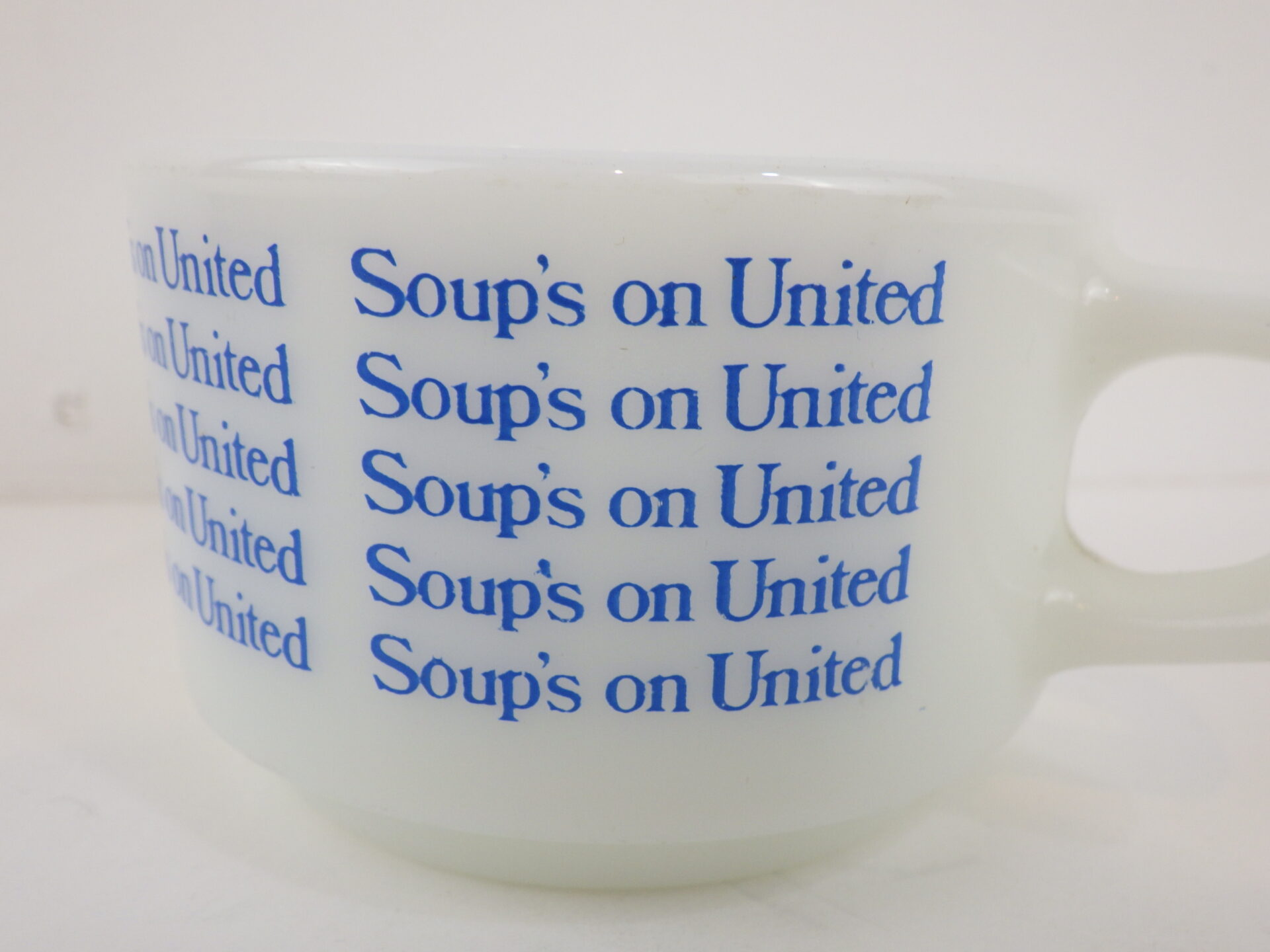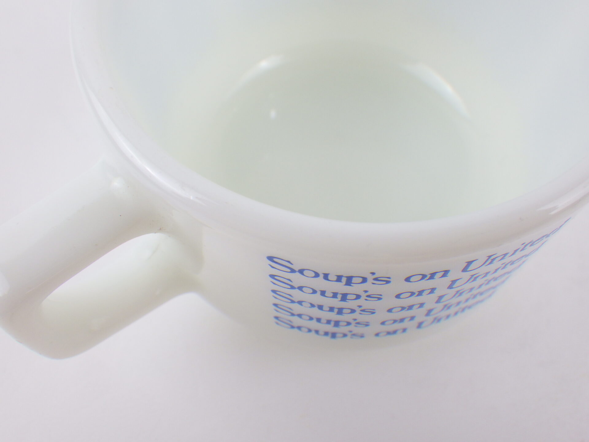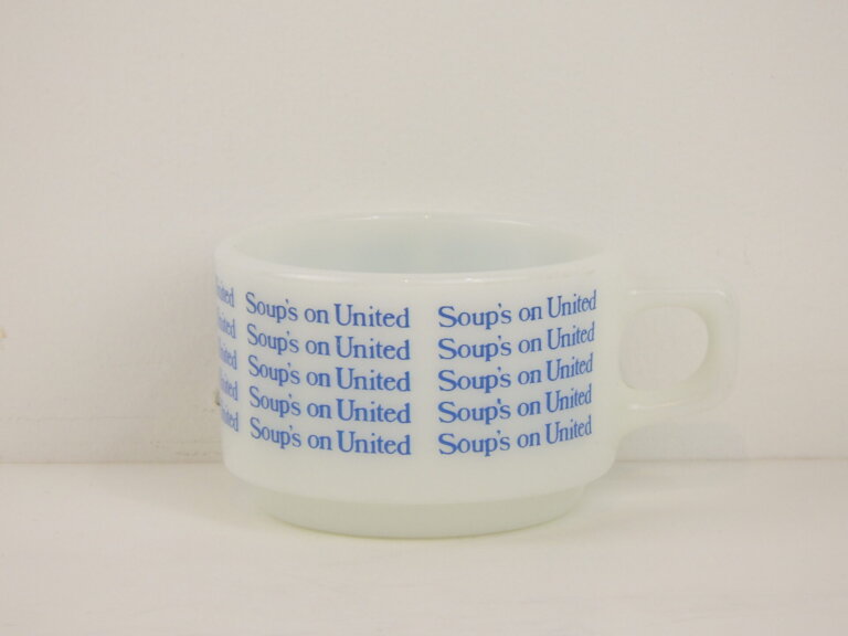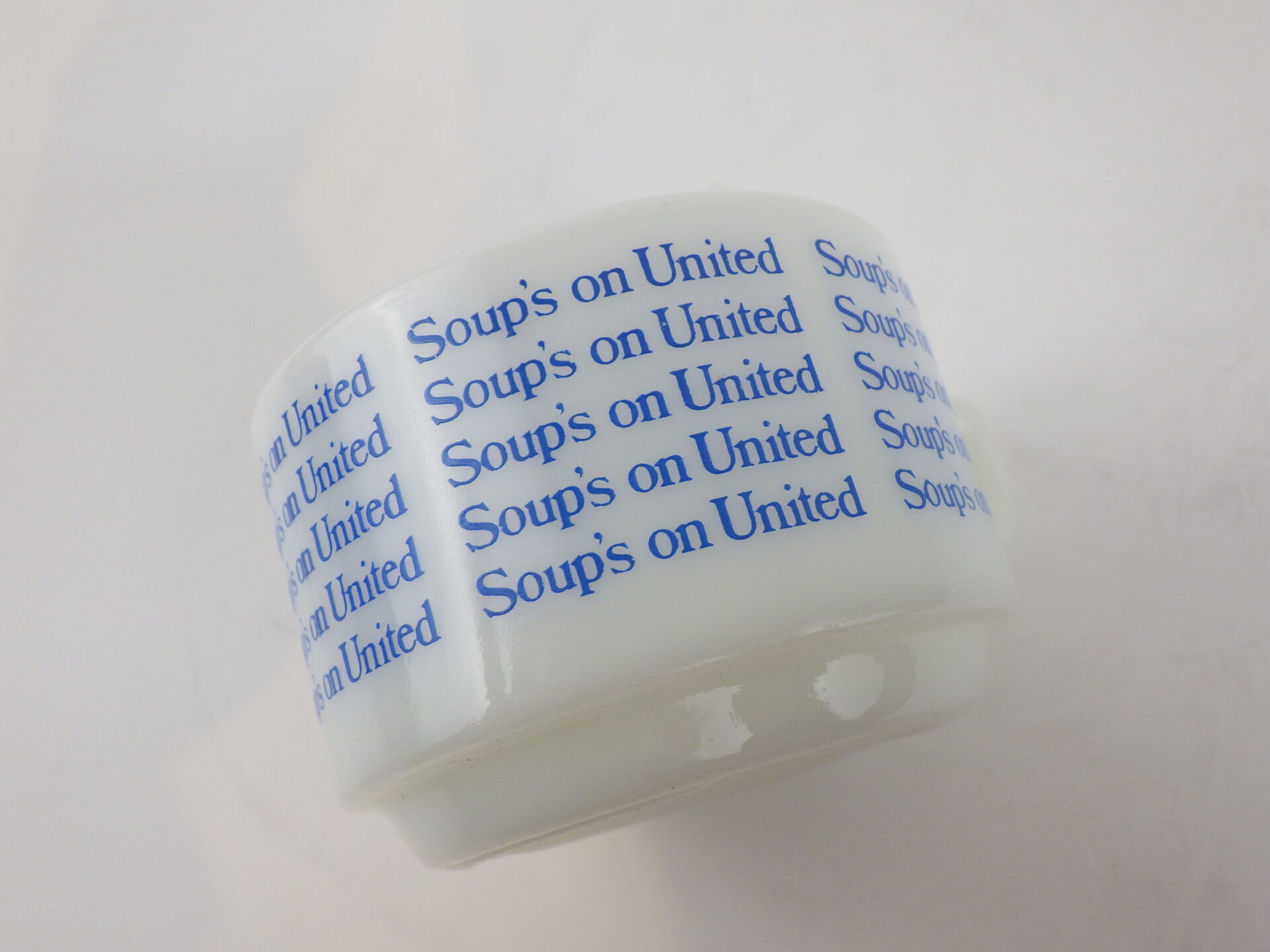 | アメリカで買い付けました。 ユナイテッド航空の機内食用に作られたスープマグです。 陶器製の物も存在しますが、こちらのミルクガラスのスープマグは入手困難なアイテムです。 文字がぐるりと一周プリントされており、可愛いデザインですね。 ボトム部分のくぼみは、機内テーブルに固定するための仕様。 また、狭い機内でもコンパクトに収納できるように、スタッキングの機能も兼ね揃えています。 |