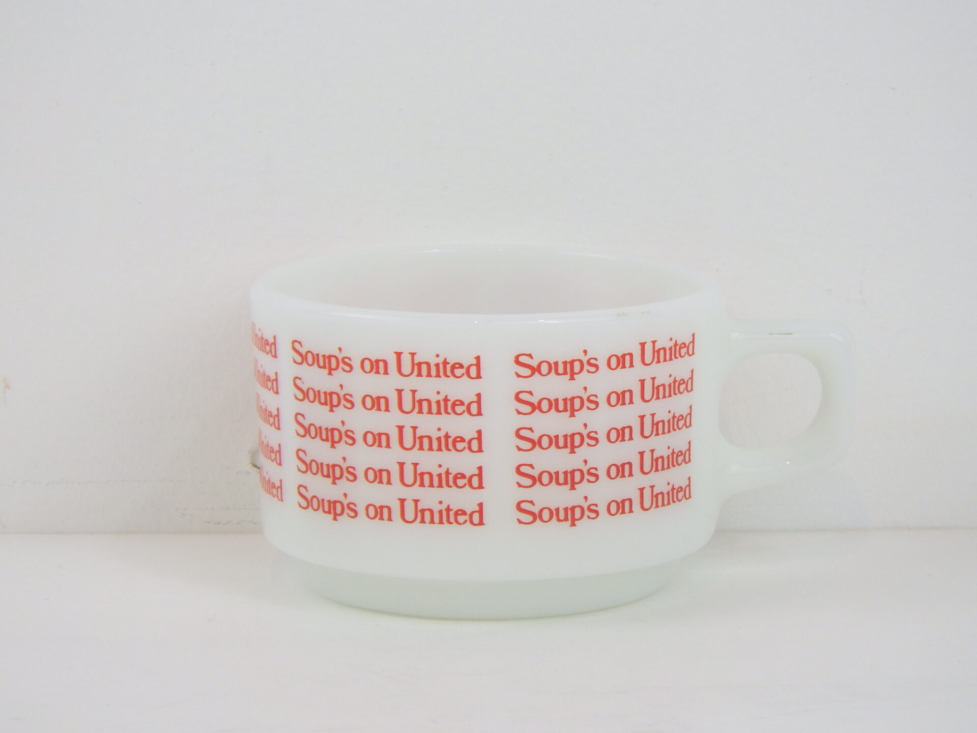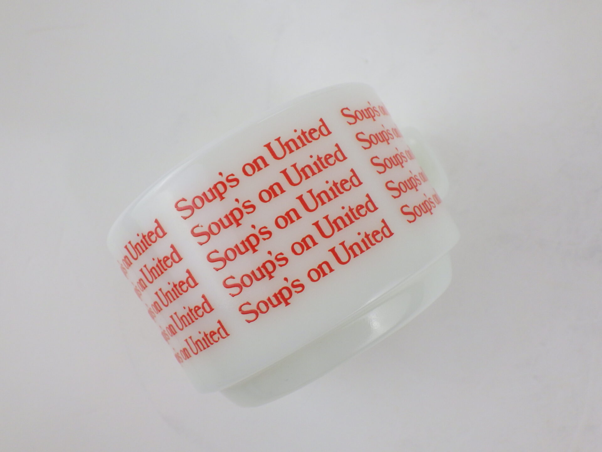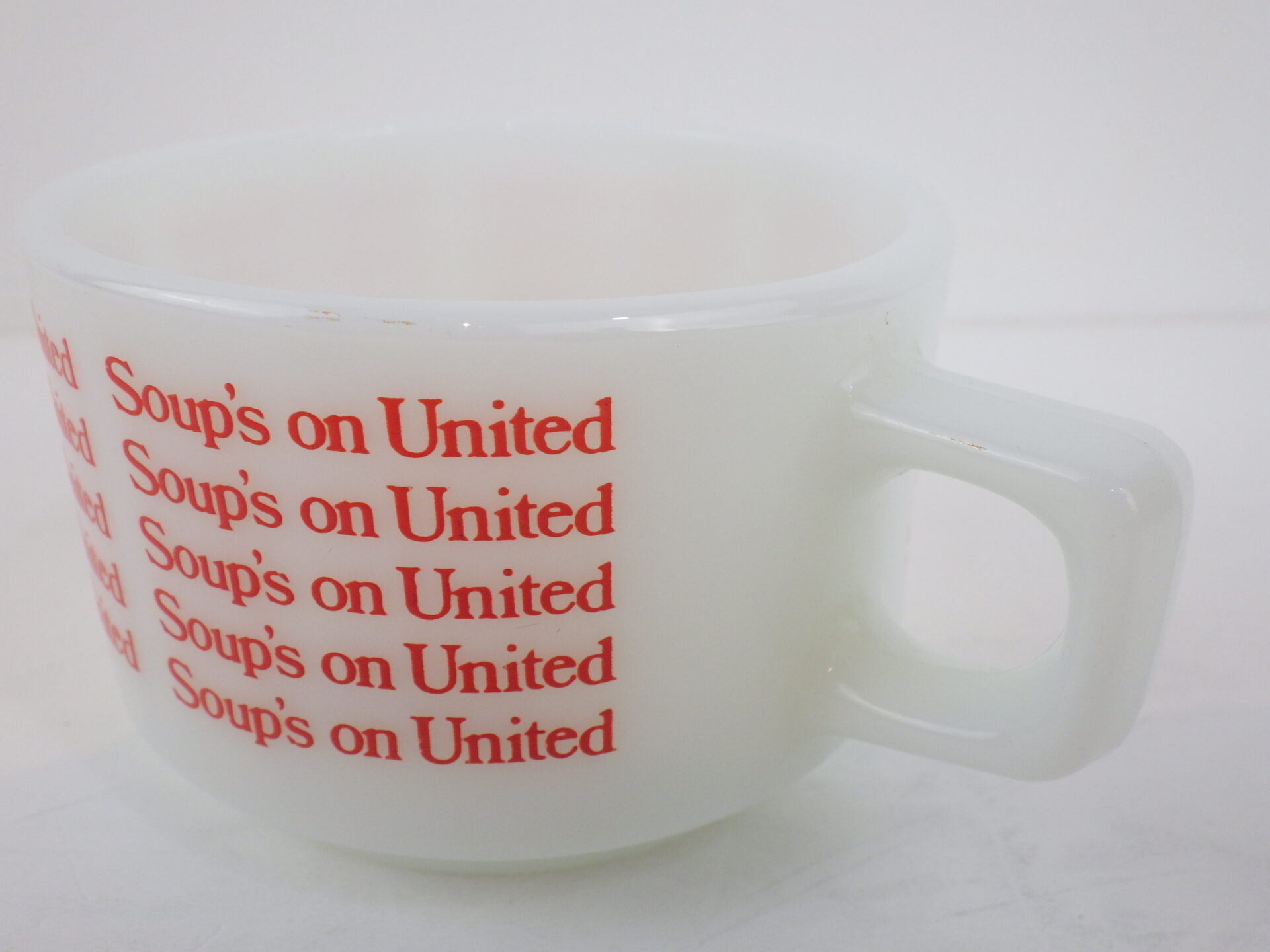 | アメリカで買い付けました。 ユナイテッド航空の機内食用に作られたスープマグです。 陶器製の物も存在しますが、こちらのミルクガラスのスープマグは入手困難なアイテムです。 文字がぐるりと一周プリントされており、可愛いデザインですね。 ボトム部分のくぼみは、機内テーブルに固定するためのものだったようです。 また、狭い機内でもコンパクトに収納できるように、スタッキングの機能も兼ね揃えています。 |