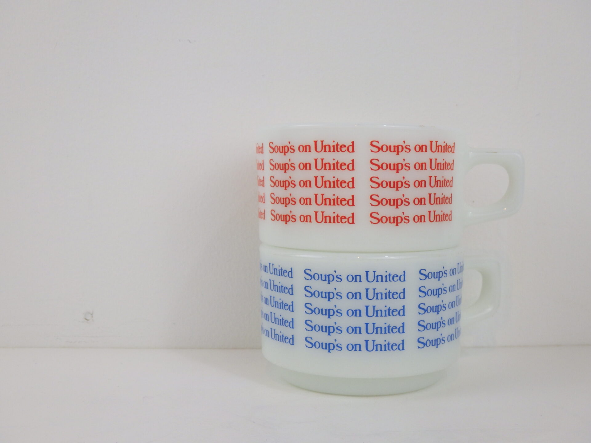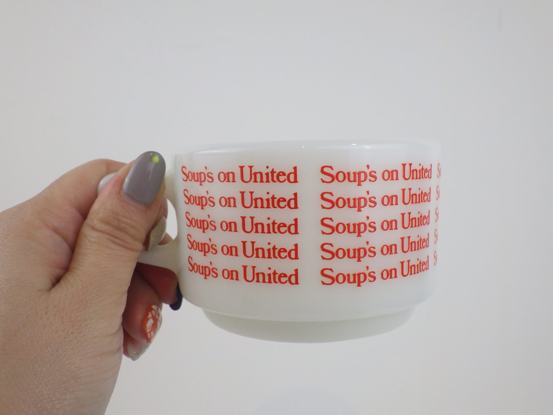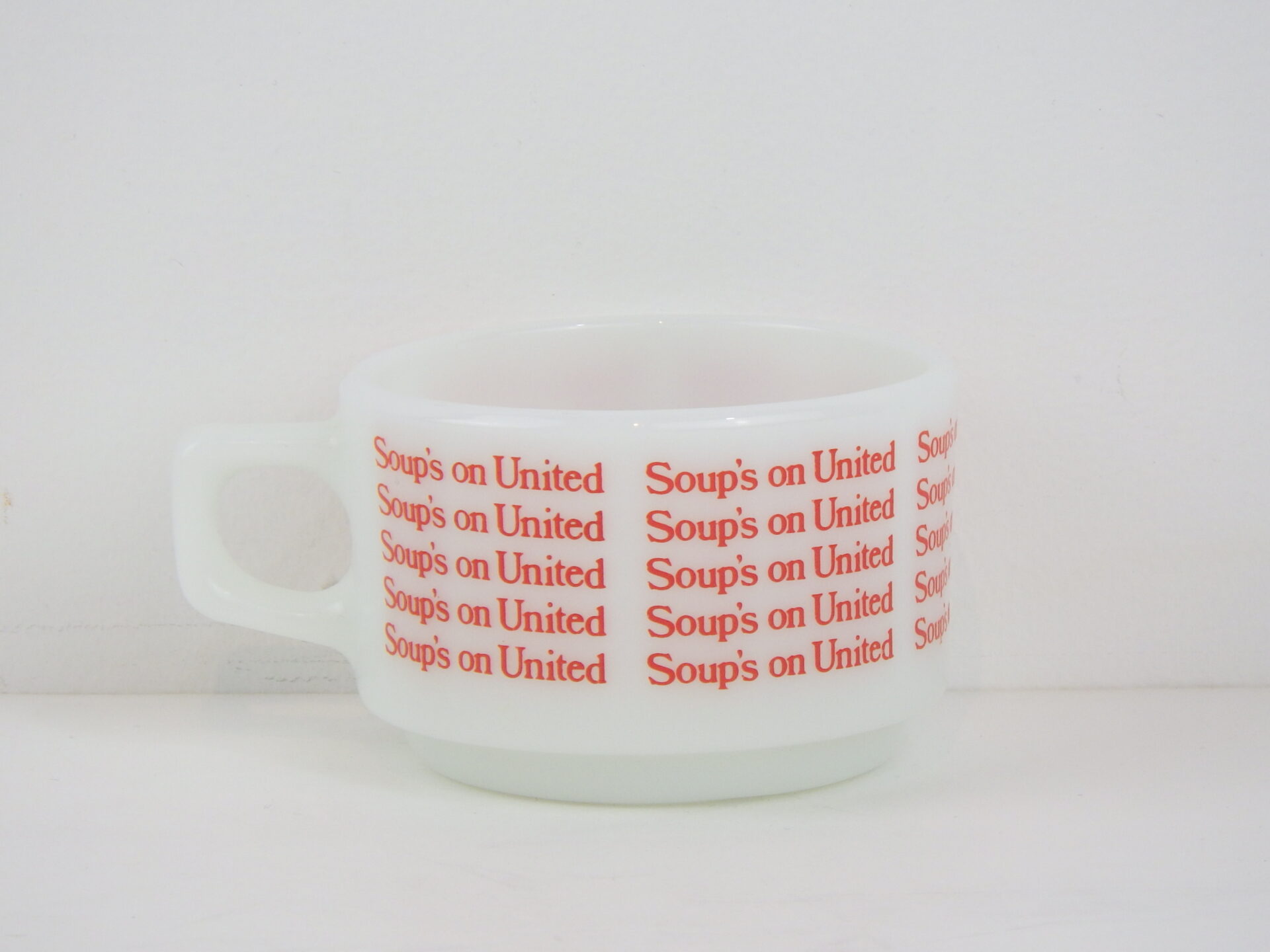 | アメリカで買い付けました。 ユナイテッド航空の機内食用に作られたスープマグです。 陶器製の物も存在しますが、こちらのミルクガラスのスープマグは入手困難なアイテムです。 文字がぐるりと一周プリントされており、可愛いデザインですね。 ボトム部分のくぼみは、機内テーブルに固定するためのものだったようです。 また、狭い機内でもコンパクトに収納できるように、スタッキングの機能も兼ね揃えています。 |