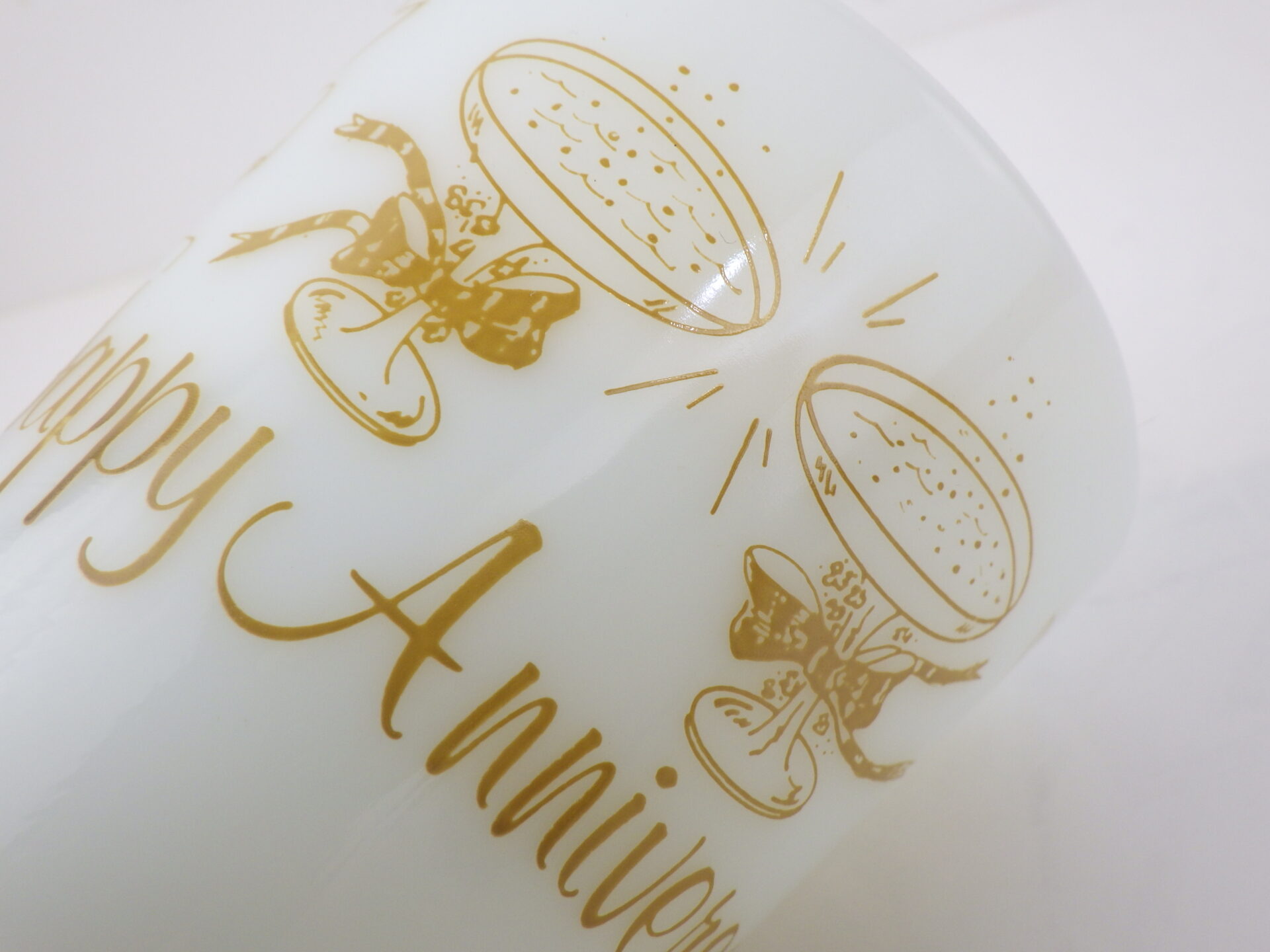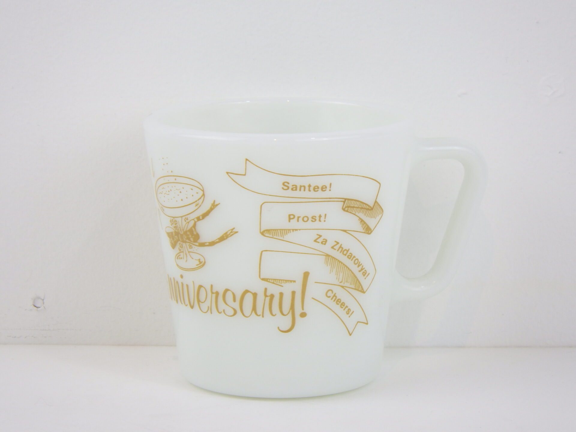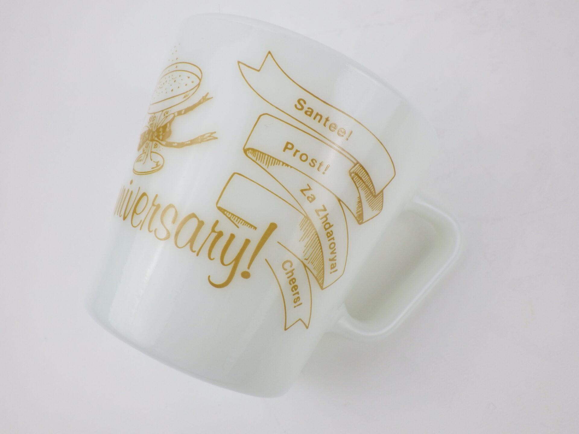 | アメリカで買い付けました。 オールドパイレックスのアニバーサリーマグです。 「Happy Anniversary!」の文字と、英語、イタリア語、チェコ語、スペイン語など様々な国の言葉で「乾杯!」と書かれています。 記念日やお祝い事のプレゼントにも喜ばれるアイテムです。 パイレックスの食器はとても丈夫なので、普段使いにおススメしています。 |