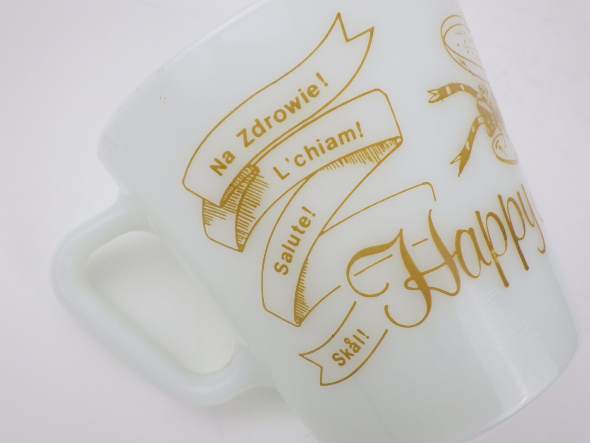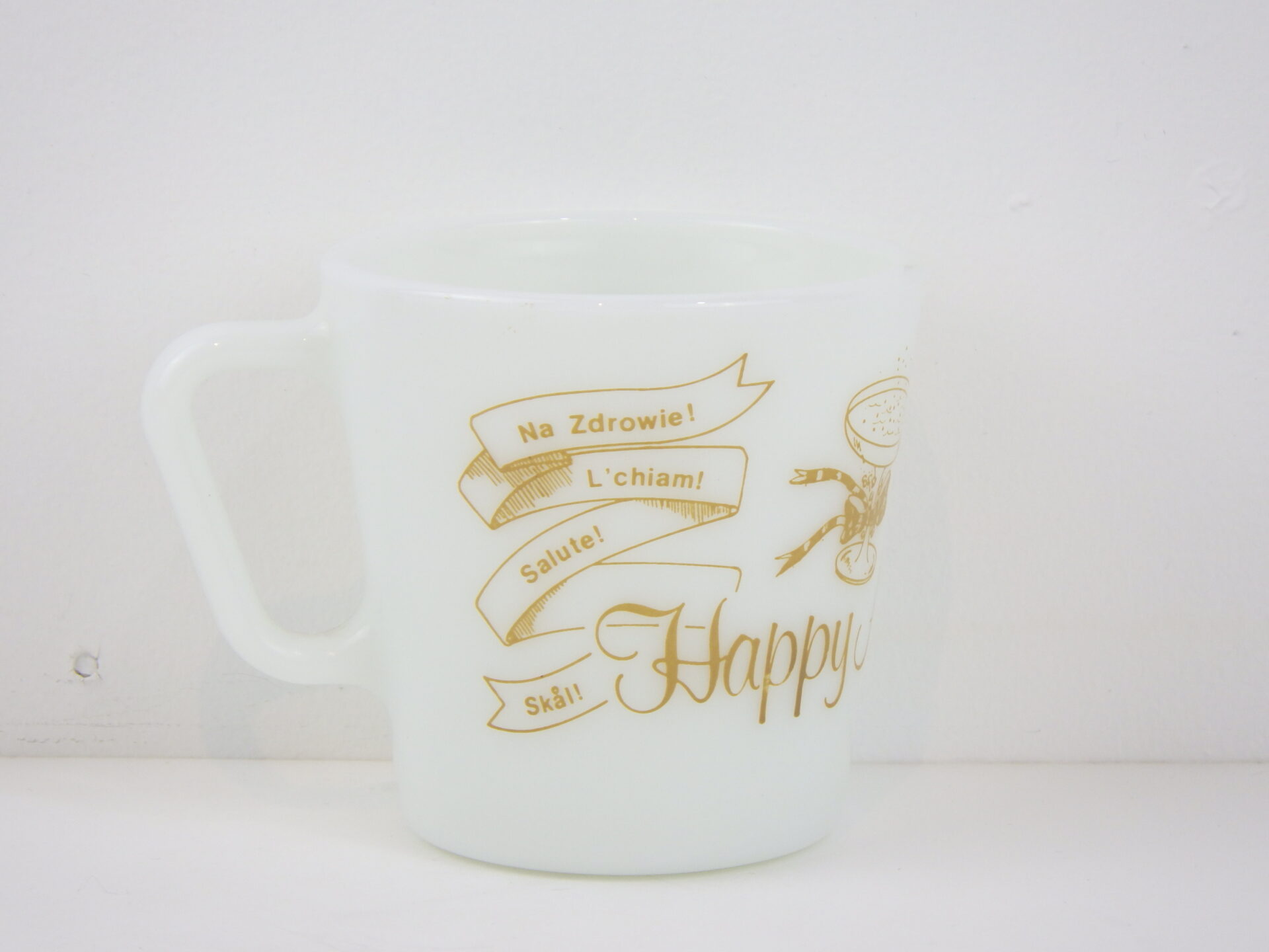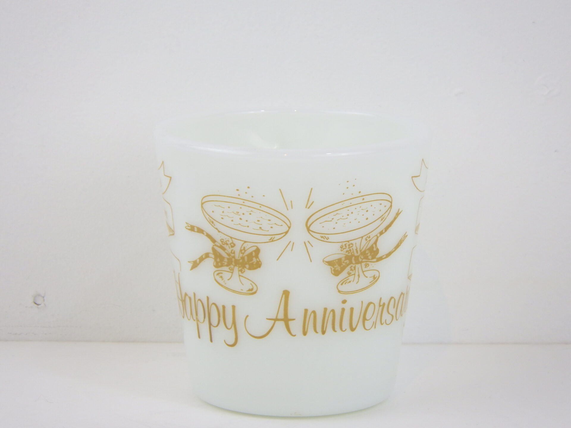 | アメリカで買い付けました。 オールドパイレックスのアニバーサリーマグです。 「Happy Anniversary!」の文字と、英語、イタリア語、チェコ語、スペイン語など様々な国の言葉で「乾杯!」と書かれています。 記念日やお祝い事のプレゼントにも喜ばれるアイテムです。 パイレックスの食器はとても丈夫なので、普段使いにおススメしています。 |