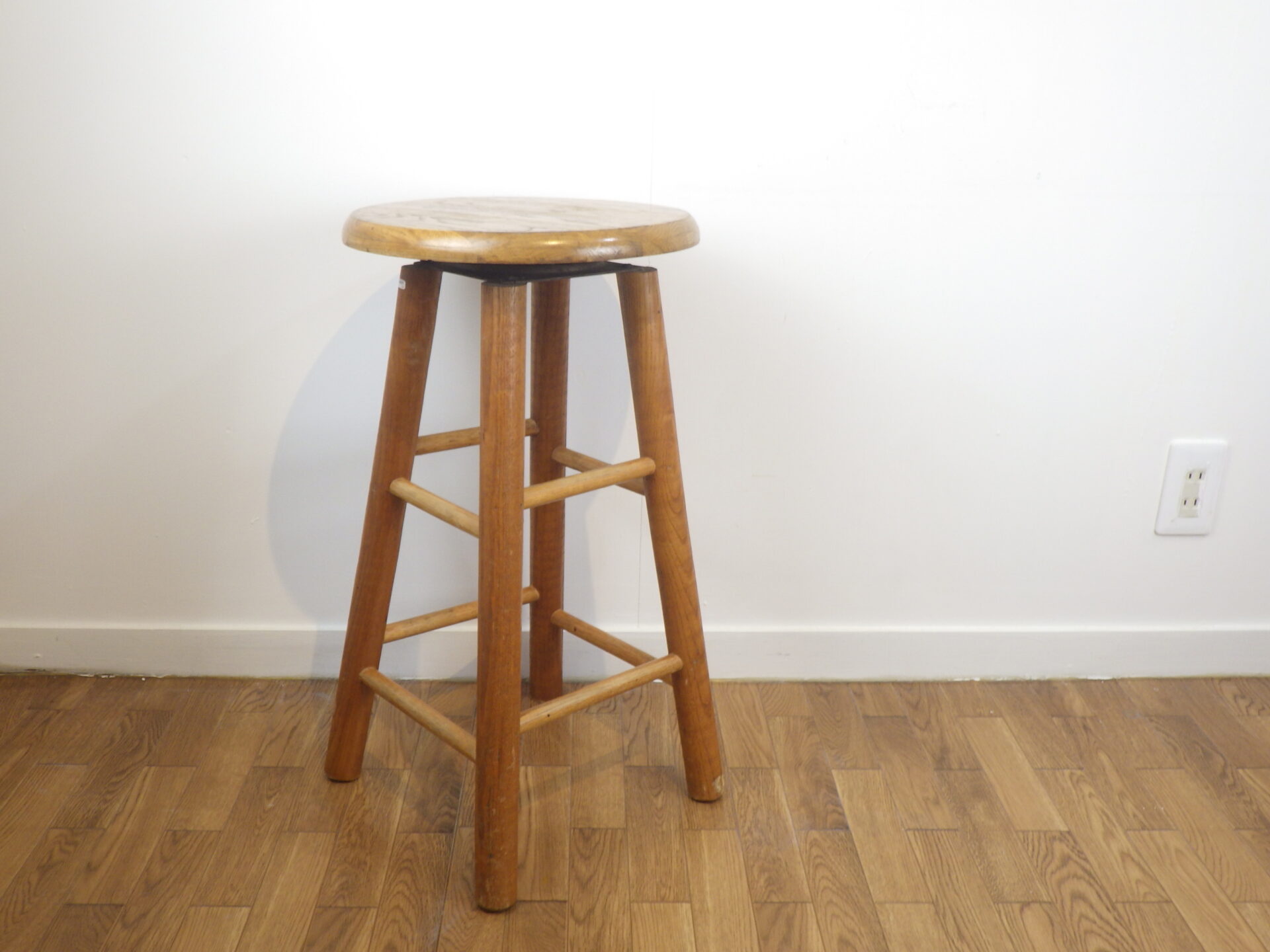 | アメリカで買い付けました。 木製のバースツールです。 座面が360度回転するので、立ち座りがしやすいです。 使用されてきた形跡が趣深い雰囲気となっている木肌が、ビンテージならではですね。 |