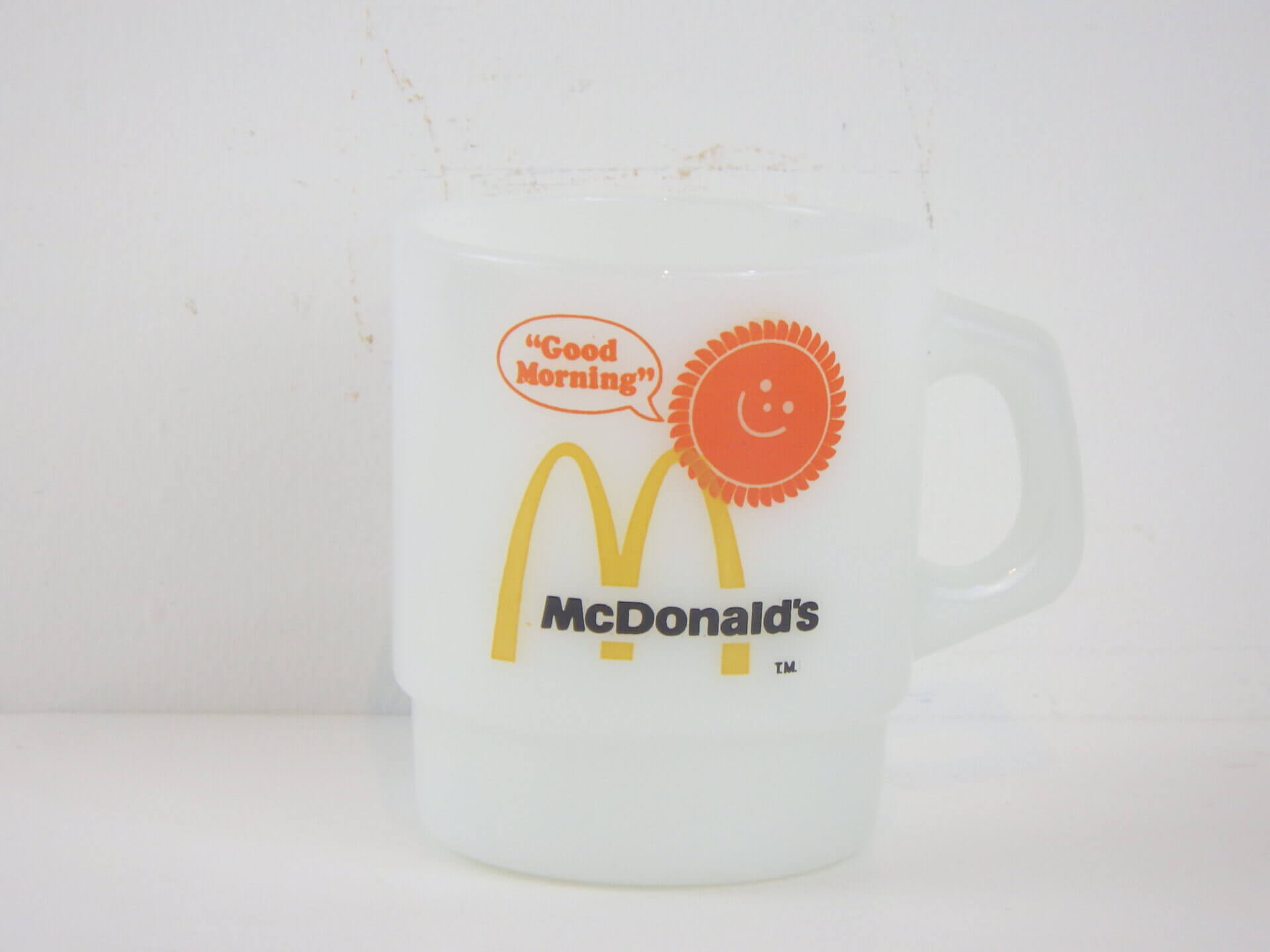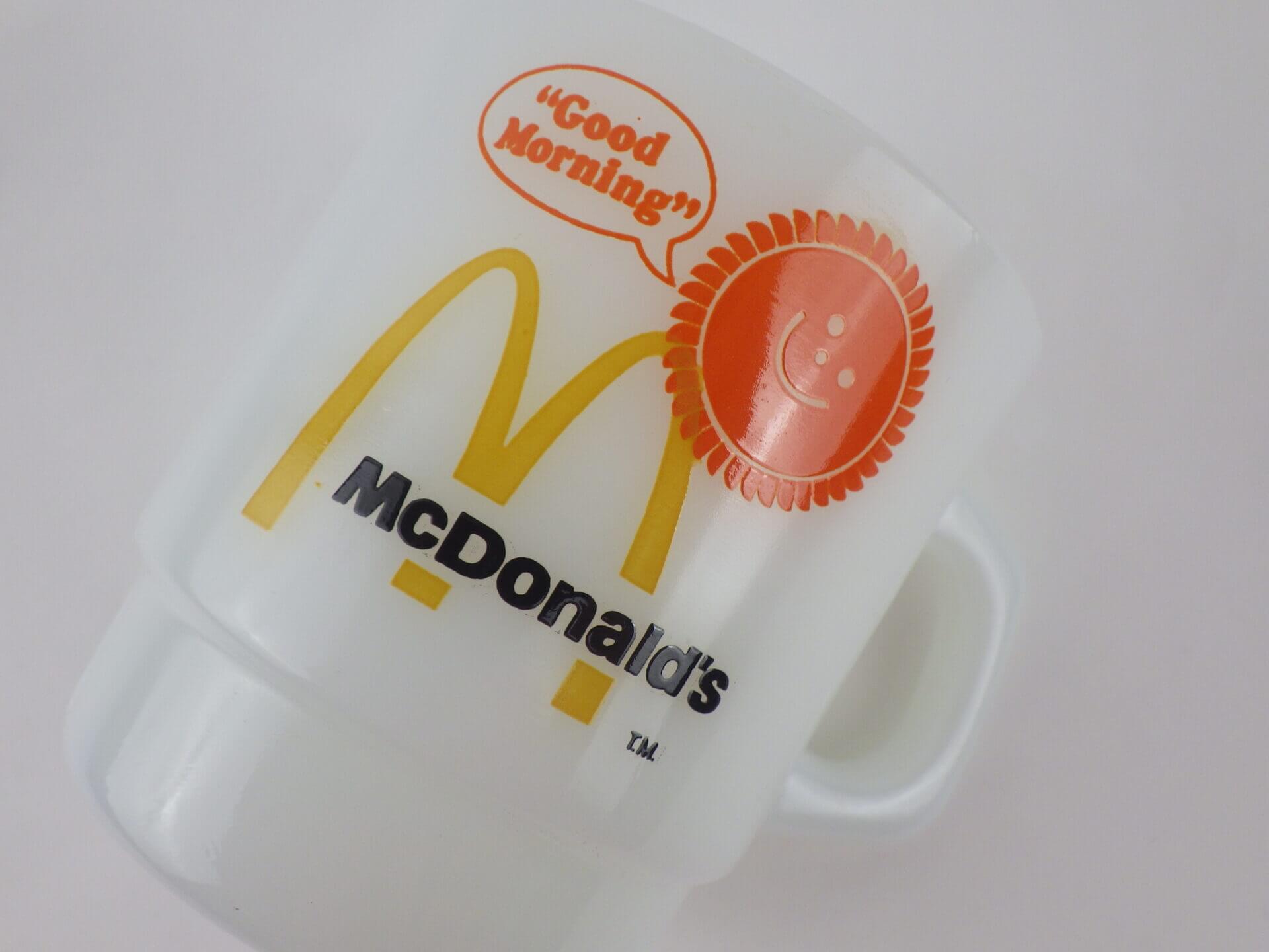 | アメリカで買い付けました。 お馴染み、ファイヤーキングのマクドナルドのアドマグです。 当時ブレックファーストセット等を注文した時にノベルティとしてもらえたマグです。 にっこり笑顔の太陽のモチーフと、お馴染みのロゴのデザインがとても可愛いアイテムですね。 |