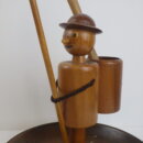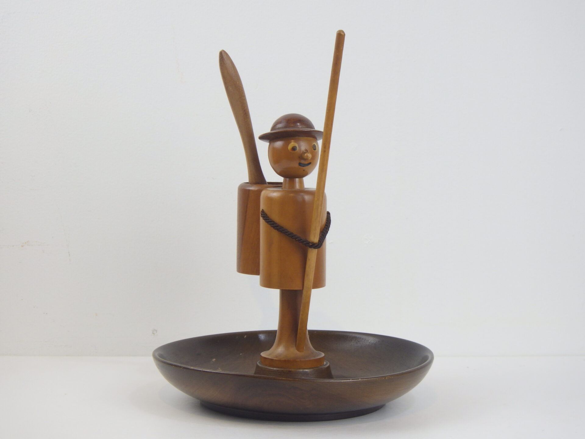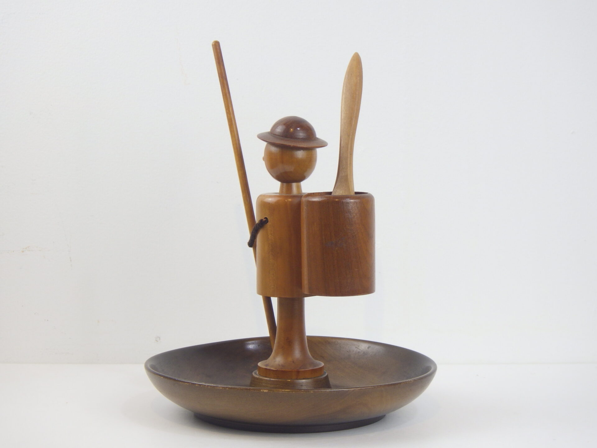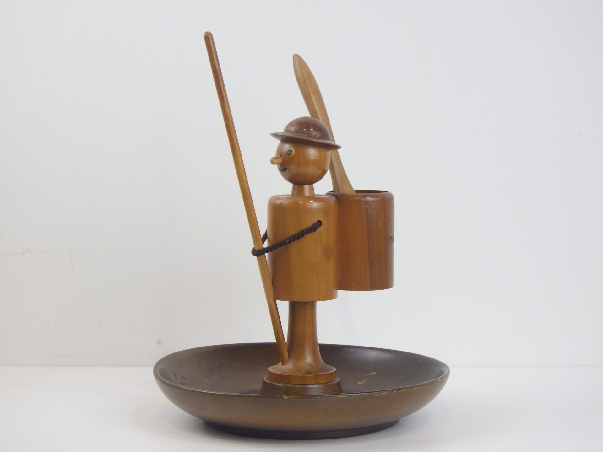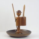 | ヨーロッパで買い付けました。 西ドイツ製のスナックトレーです。 お皿にナッツ、手に持った棒にプレッツェルなどを挿して使用します。 人形の部分は360度回転します。 まるで一寸法師?な姿に思わず愛着が湧きますね。 アクセサリーなどを置いたり、オブジェとしてお楽しみいただくのも良さそうです。 |