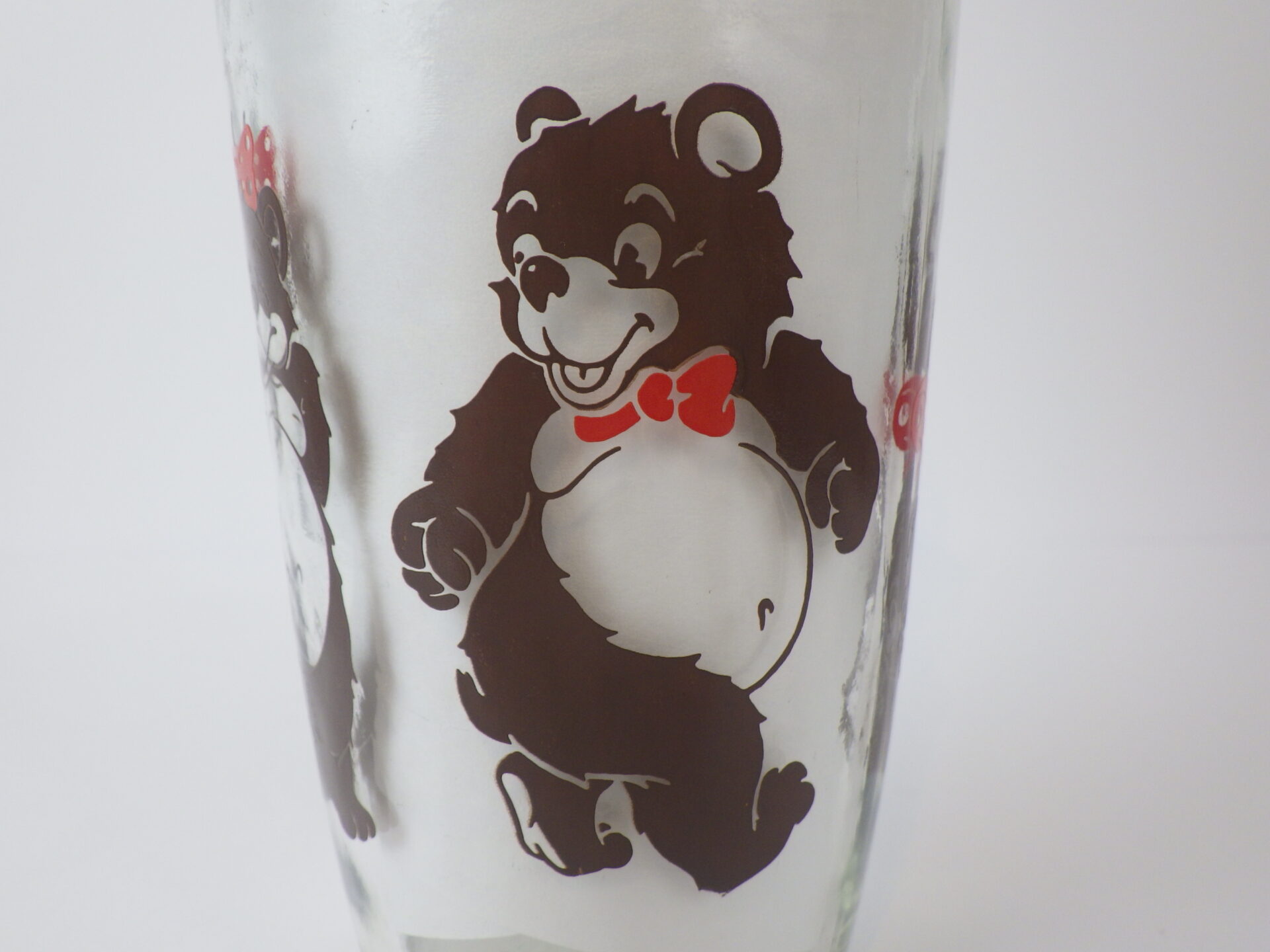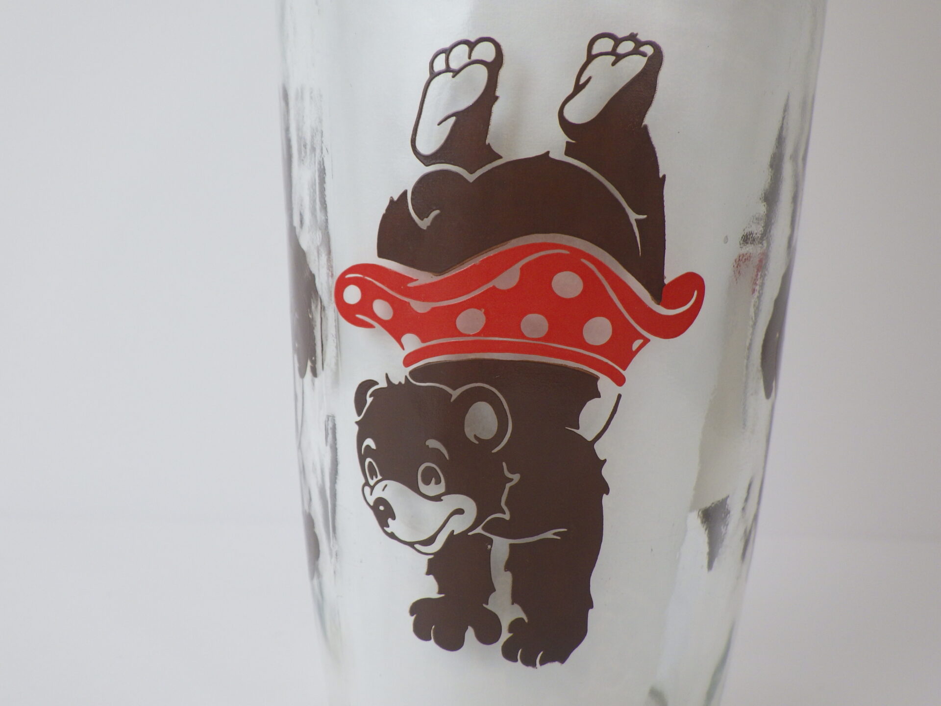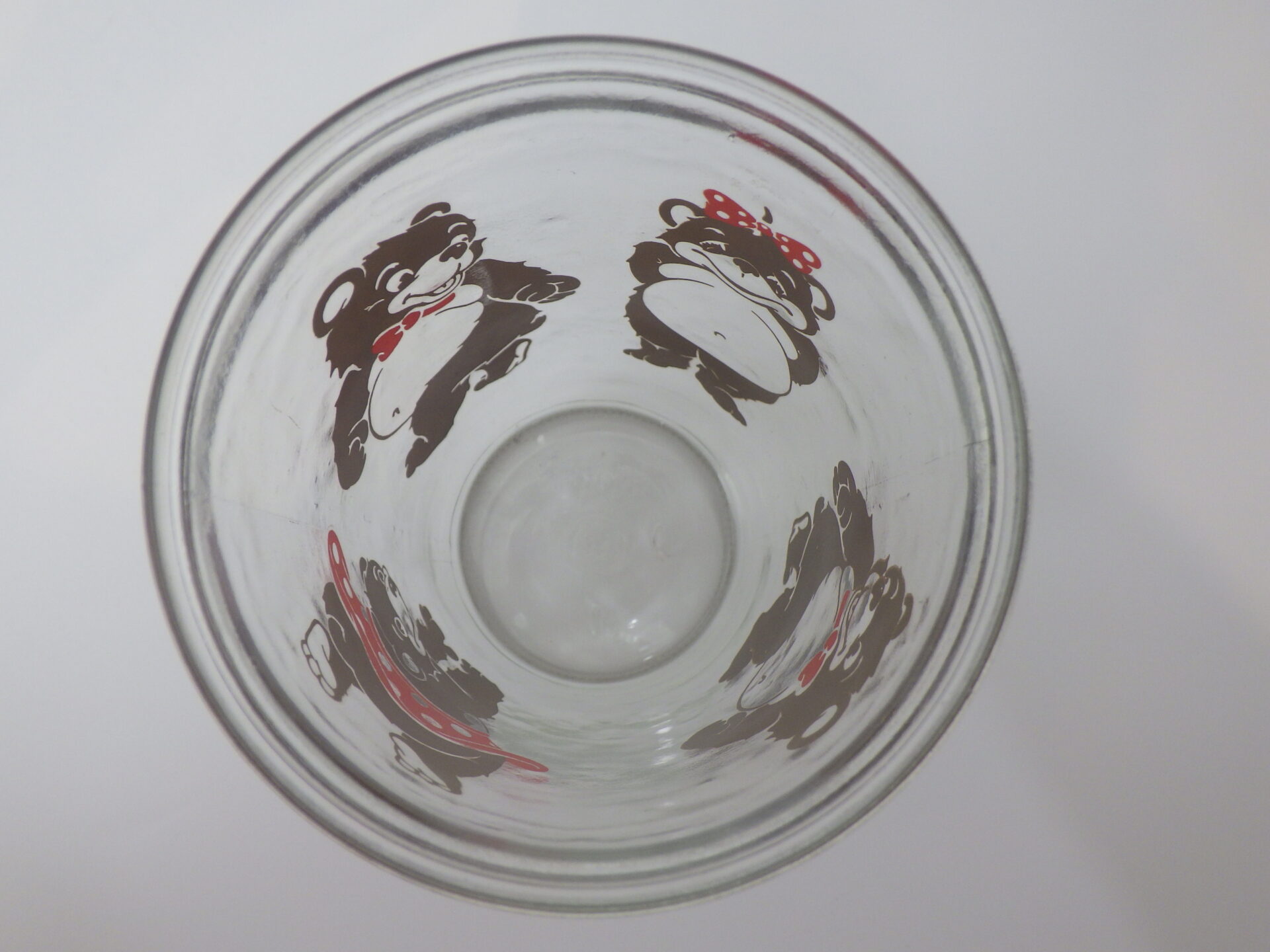 | アメリカで買い付けました。 Ball社製、サワークリームグラスです。 当時、サワークリームの販売容器として製造されていました。 使い終わったらグラスとして使用出来るようになっています。 ぐるりと一周様々なポーズをとったクマたちがプリントされていて、可愛らしいですね。 |