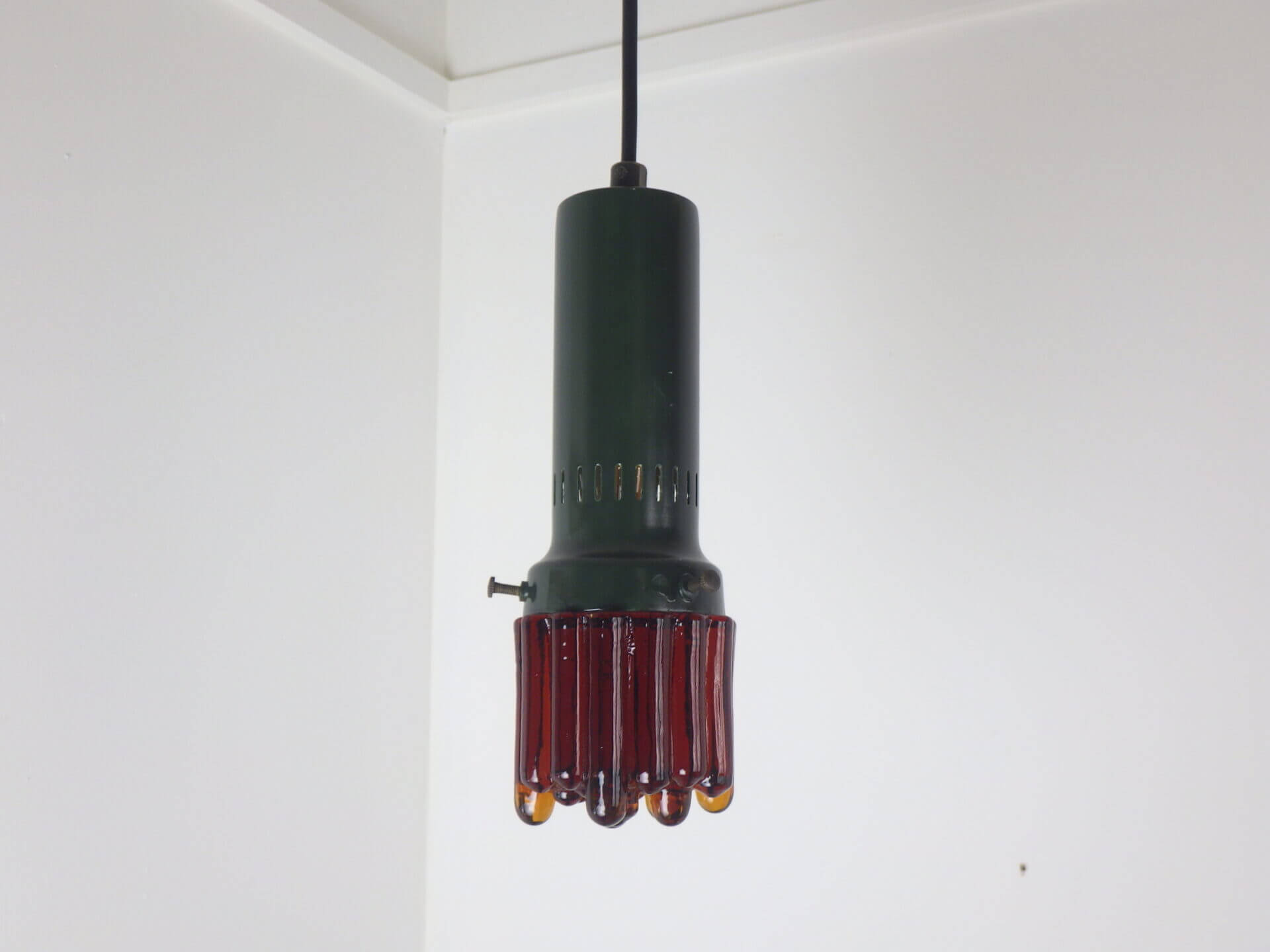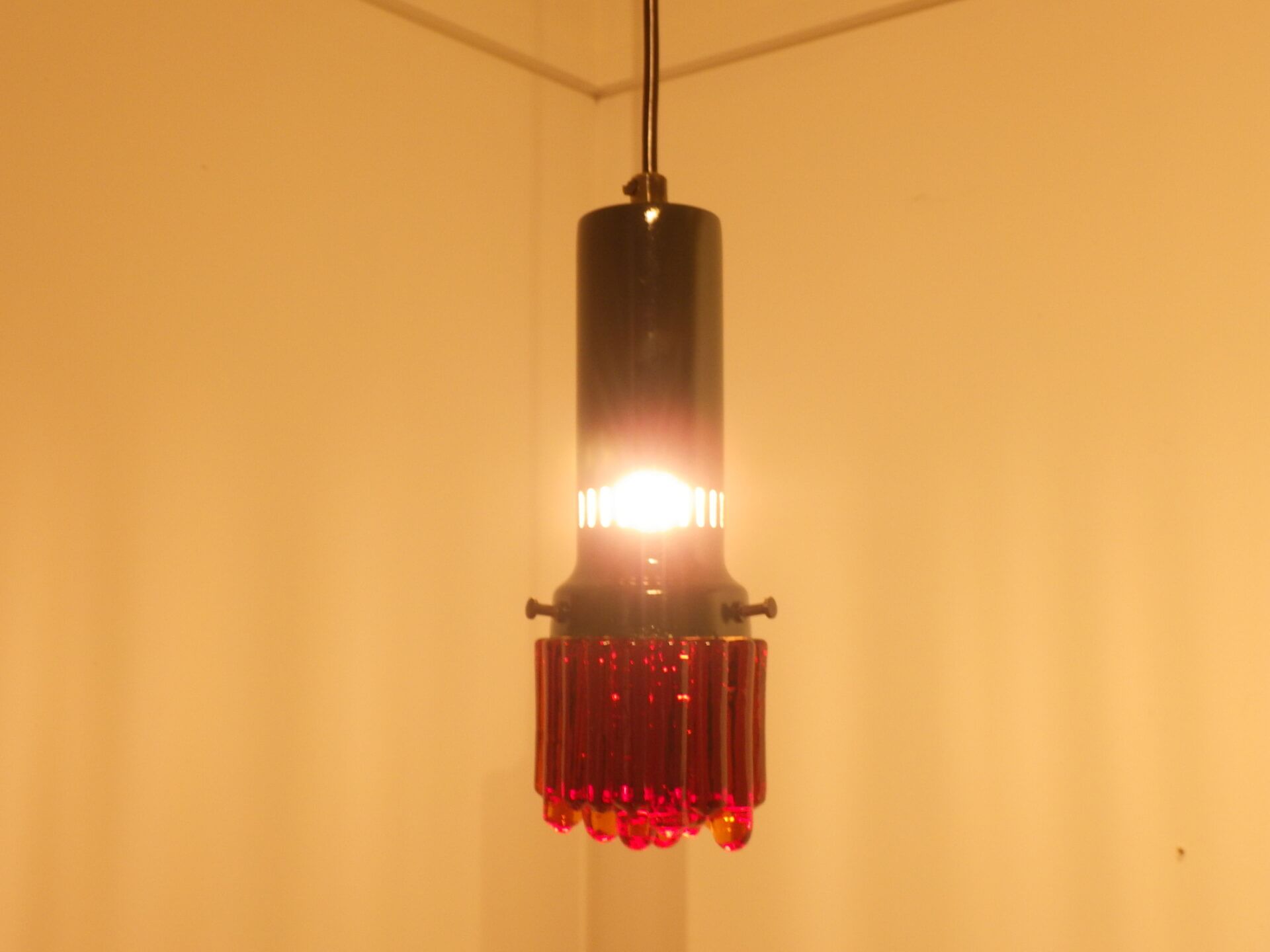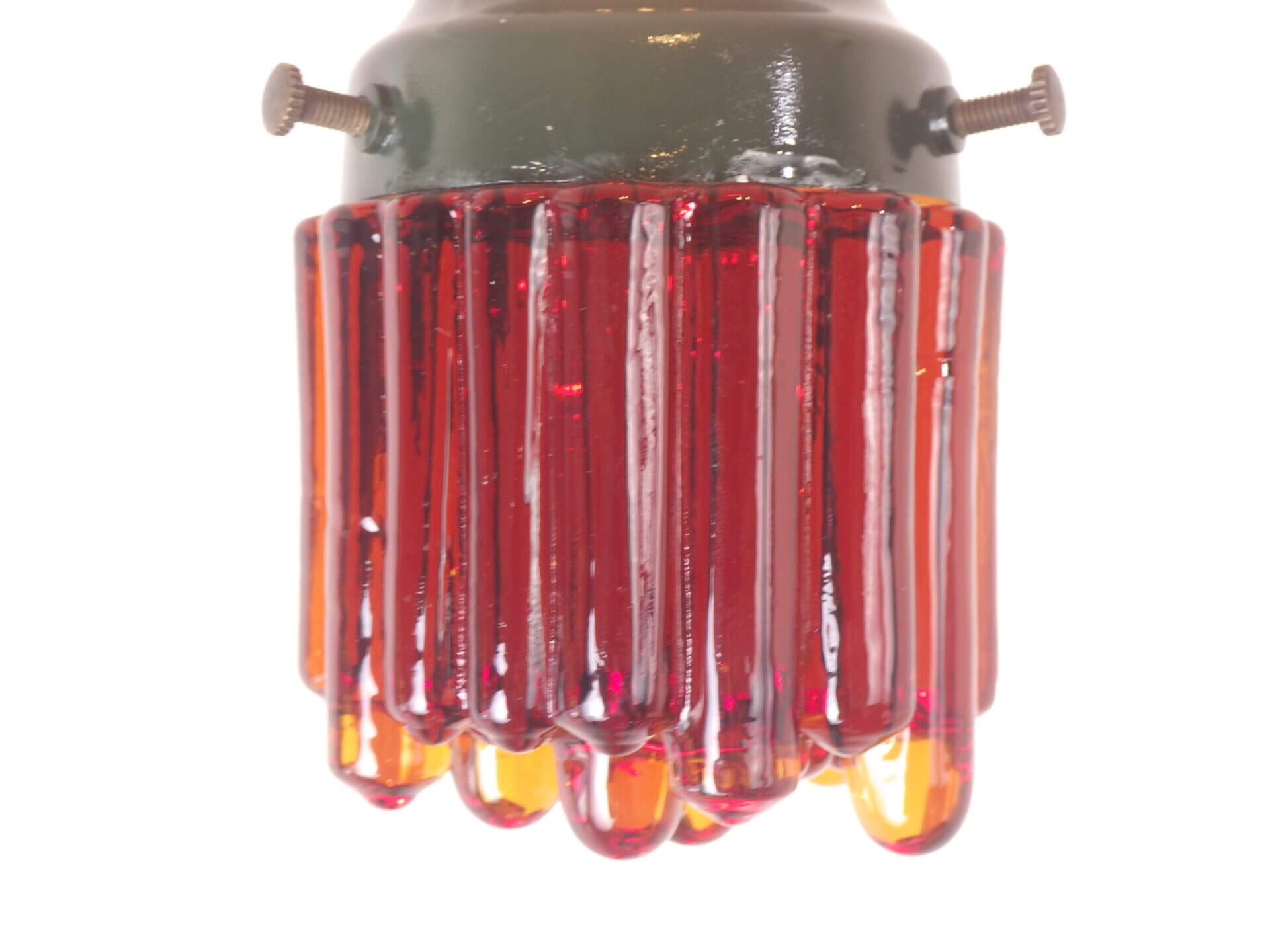 | ヨーロッパで買い付けしました。 つららの様なガラスがついた小ぶりなビンテージのペンダントランプです。 先端のガラスはシェードと言うより「ガラスのかたまり」となっており、電球はグリーンの筒状の本体につける構造となっています。 本体下部にぐるりと一周縦のラインで穴が空いており、灯りをつけるとそこからも光が漏れますが、先端のカラーガラスにも光が反射して綺麗です。 灯りをつけていない時でも自然光でガラスがキラキラするので良い雰囲気です。 こちらは赤いガラスですが、光の入り方や角度によってはアンバーのようにも見えます。 |