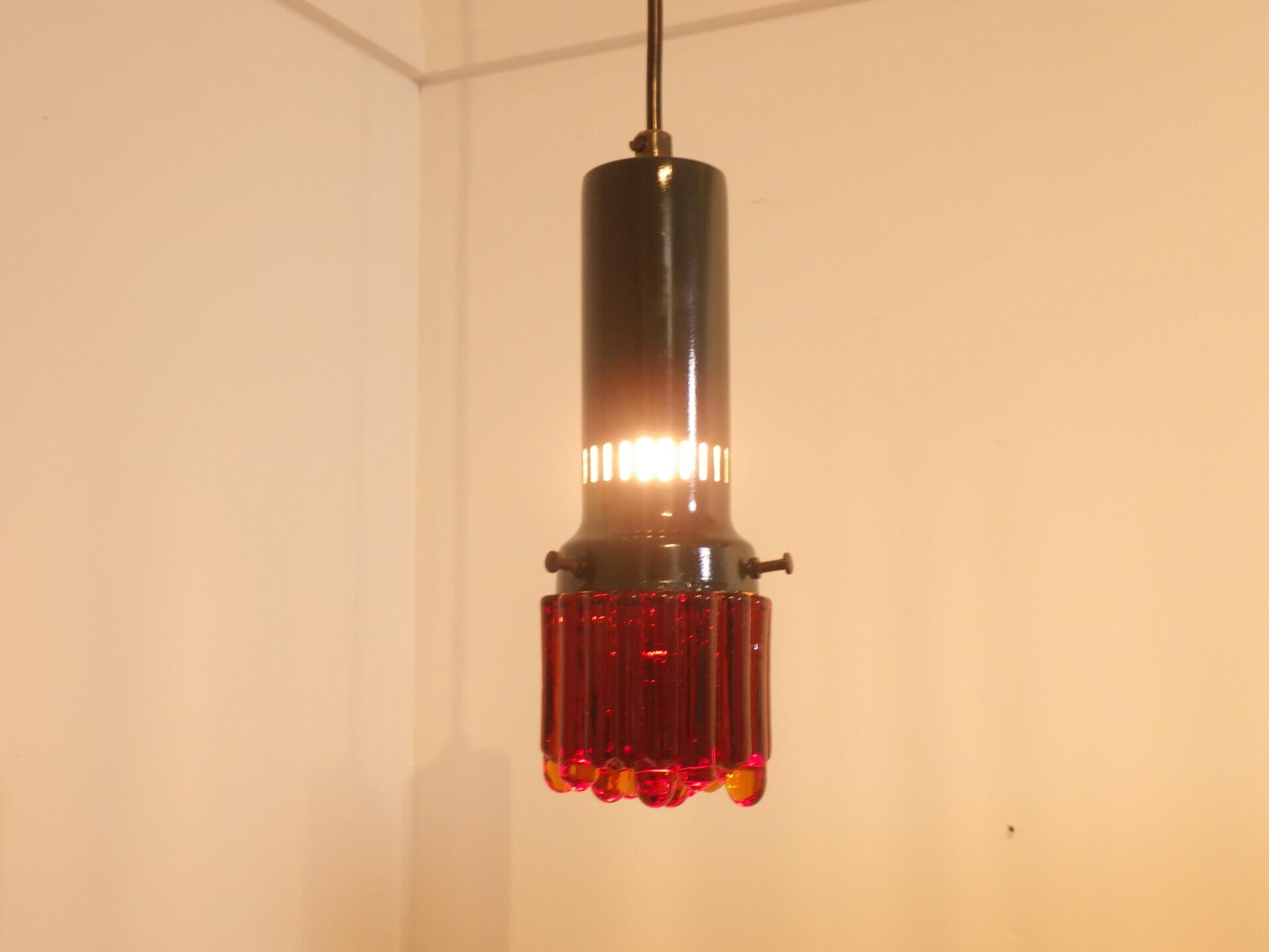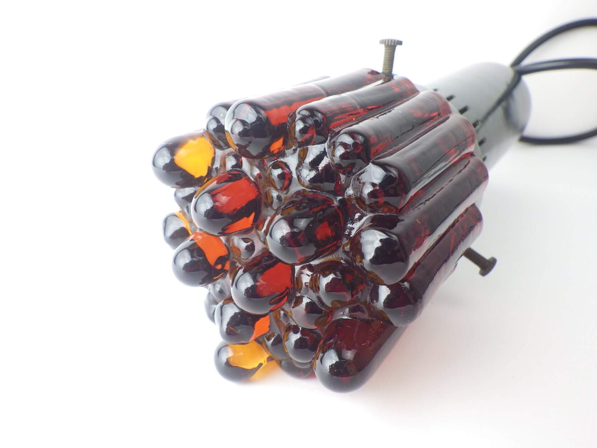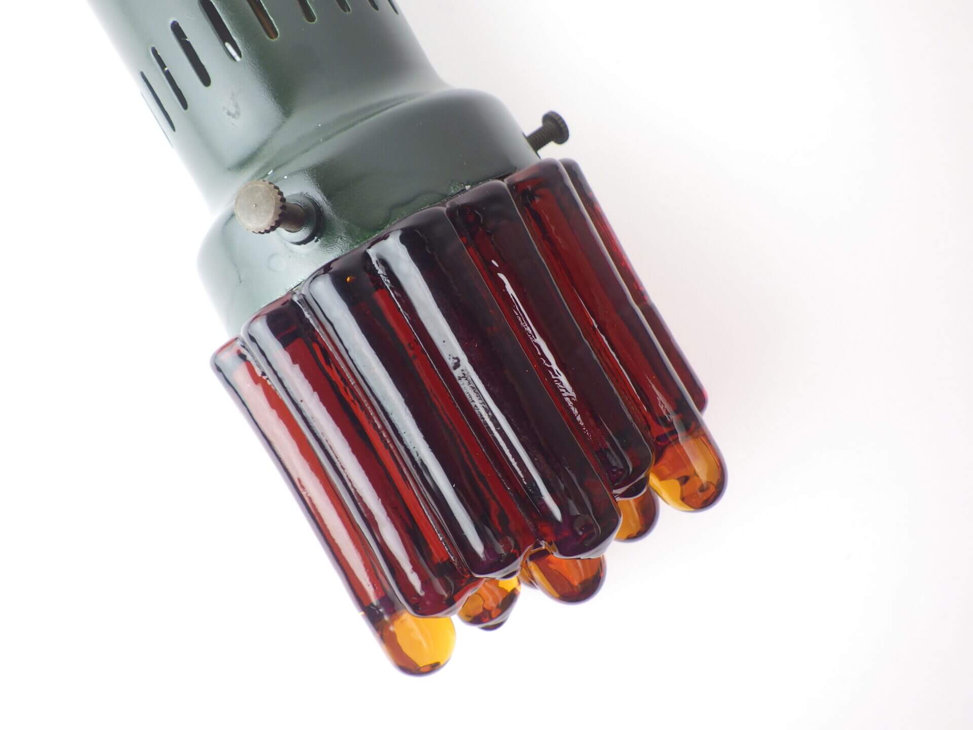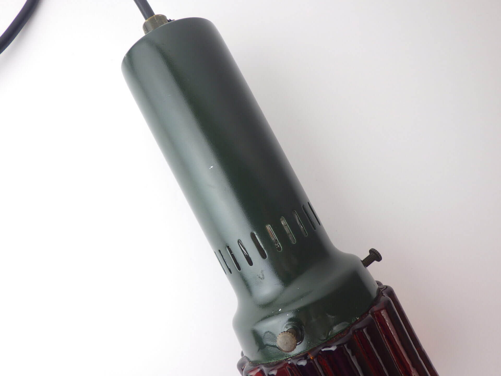 | ヨーロッパで買い付けしました。 つららの様なガラスがついた小ぶりなビンテージのペンダントランプです。 先端のガラスはシェードと言うより「ガラスのかたまり」となっており、電球はグリーンの筒状の本体につける構造となっています。 本体下部にぐるりと一周縦のラインで穴が空いており、灯りをつけるとそこからも光が漏れますが、先端のカラーガラスにも光が反射して綺麗です。 灯りをつけていない時でも自然光でガラスがキラキラするので良い雰囲気です。 こちらは赤いガラスですが、光の入り方や角度によってはアンバーのようにも見えます。 |