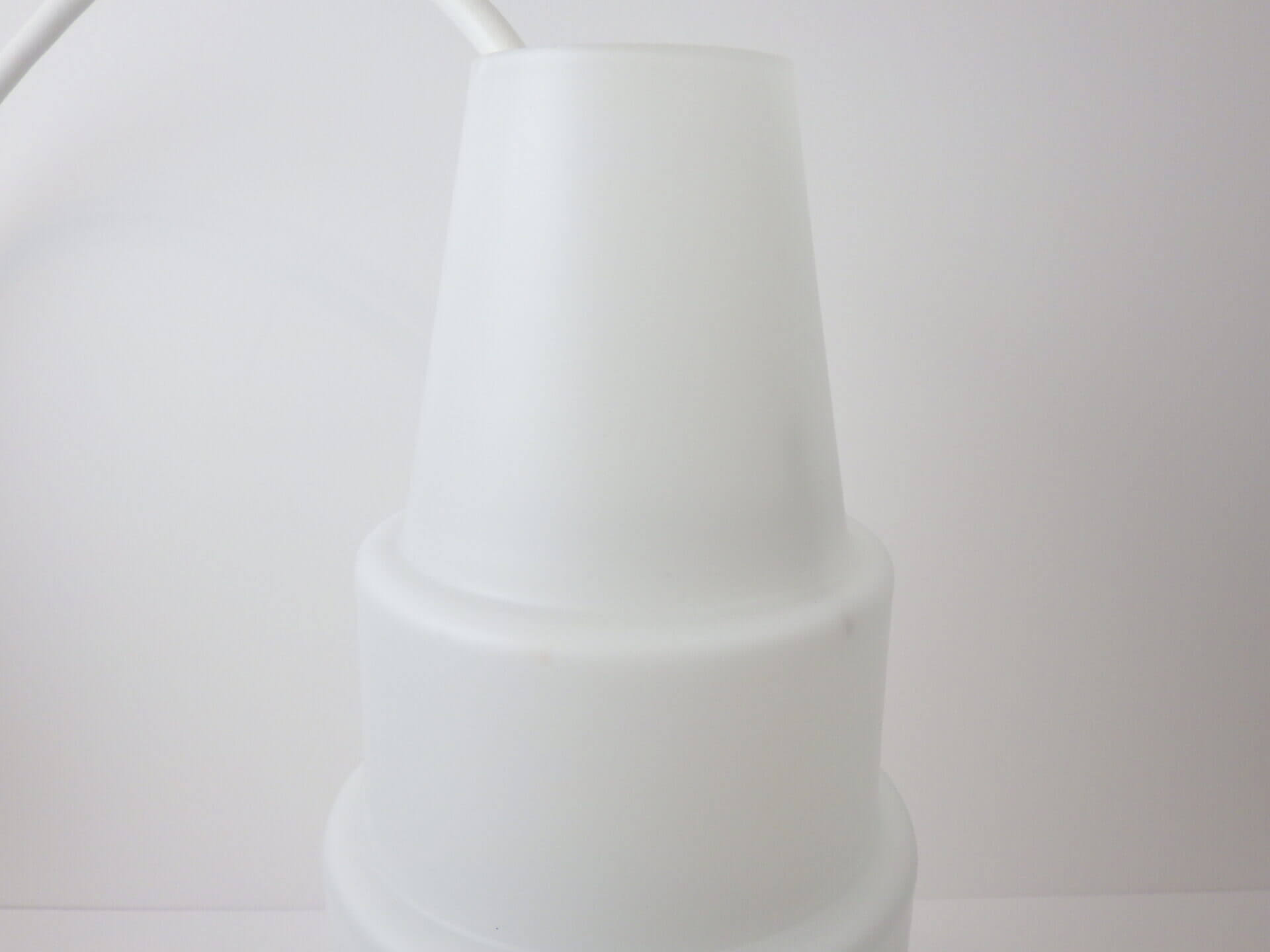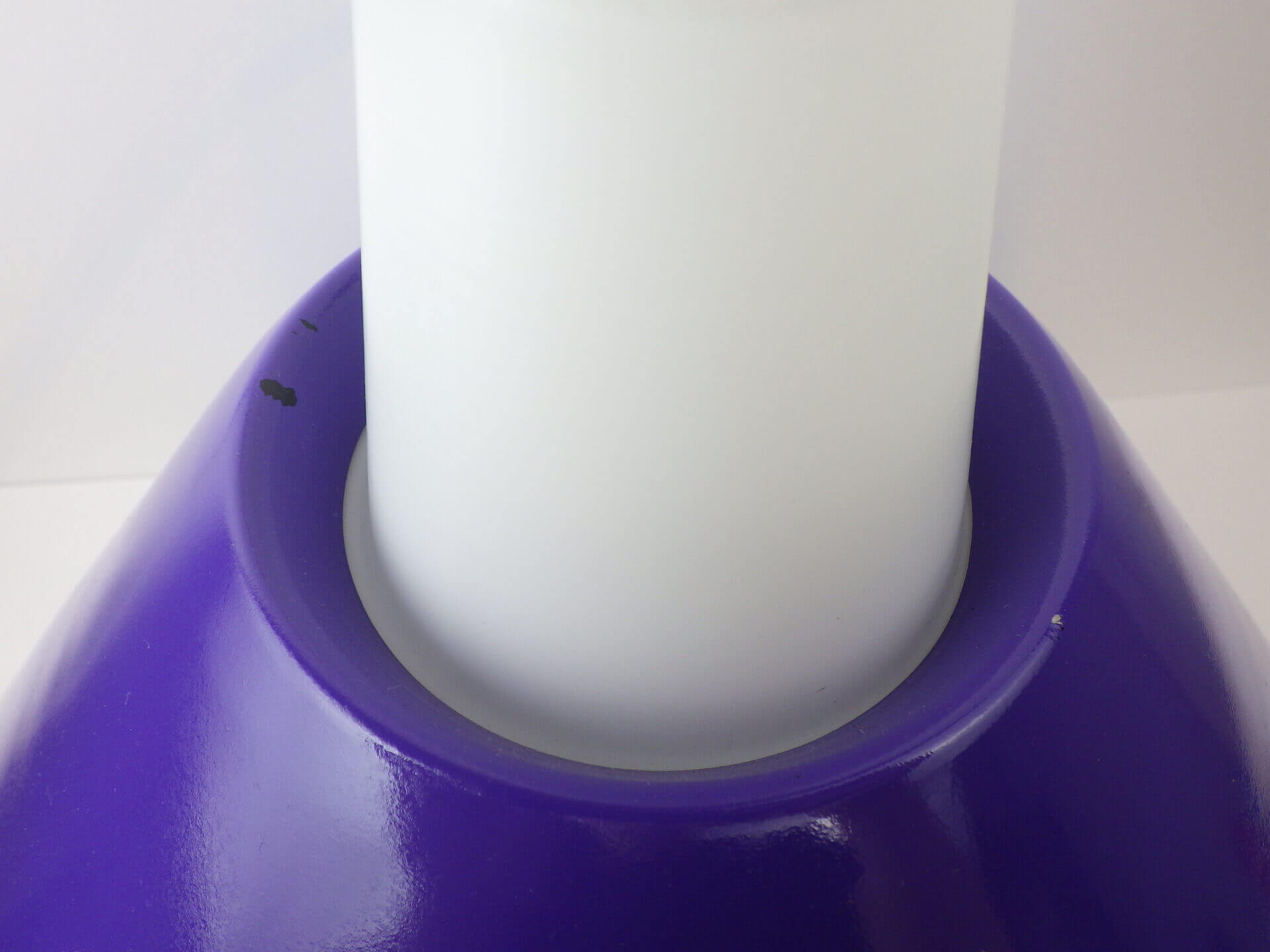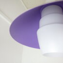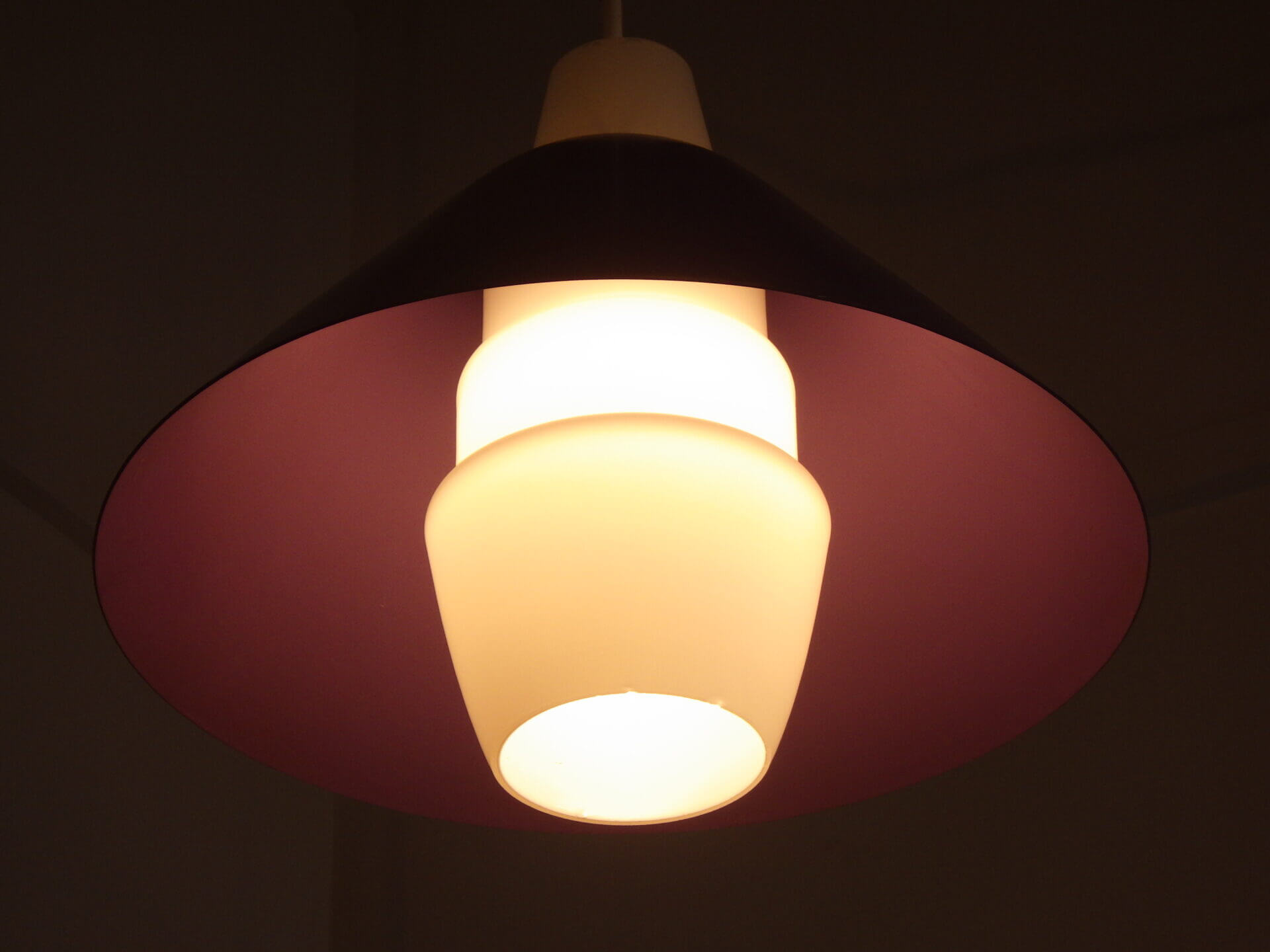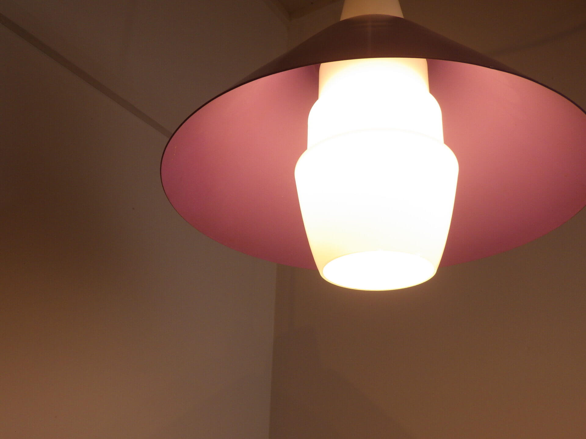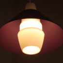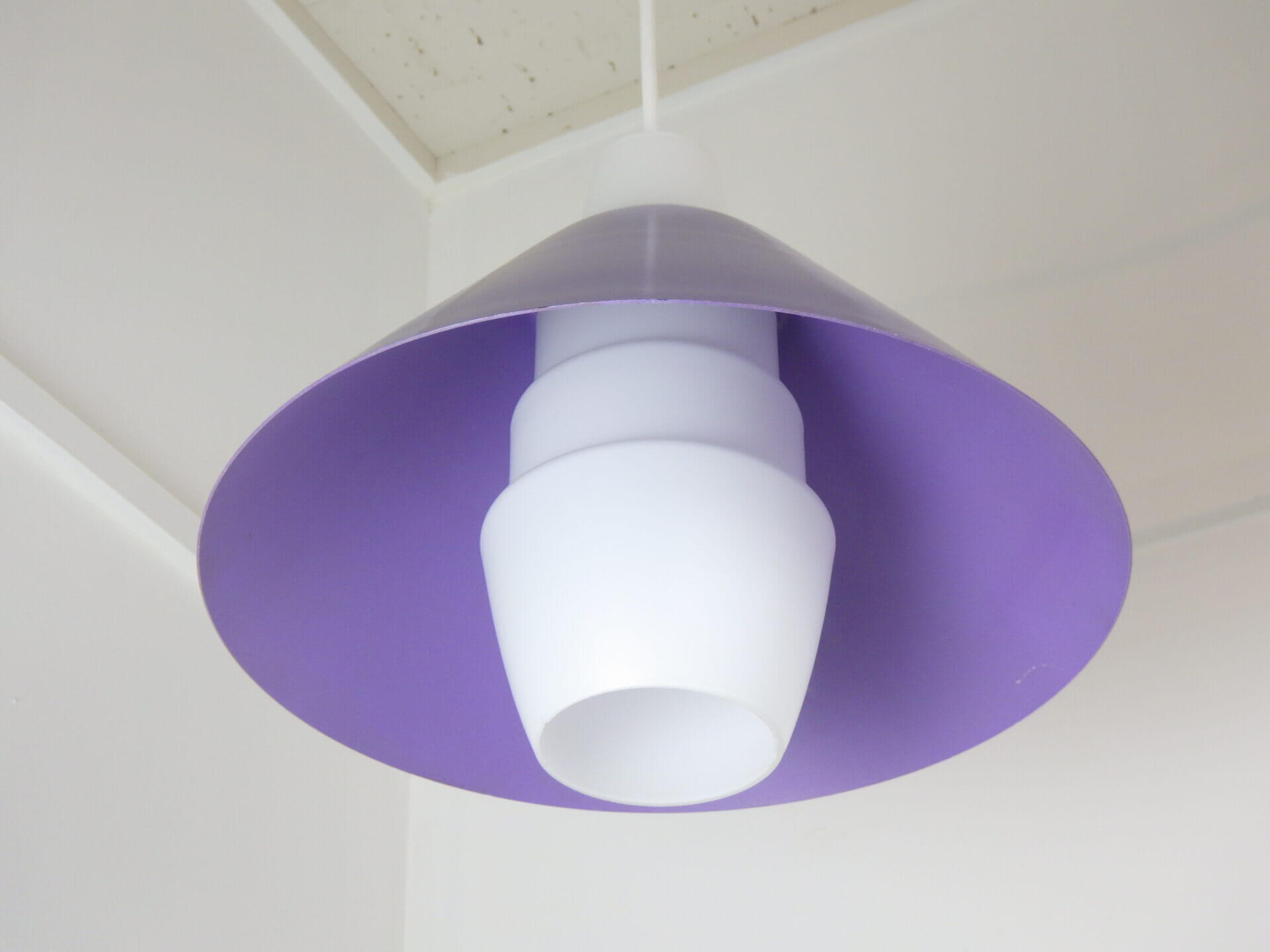 | ヨーロッパで買い付けました。 Louis KalffがPhilips社のためにデザインした照明と大変似た雰囲気のペンダントランプです。 紫のシェードの内部を突き抜ける形ですりガラスのシェードが入っており、上部までふんわりと灯りがもれるデザインとなっています。 紫のシェードは内側の方が少し薄いトーンとなっており、灯りをともすとそのトーンの違いがとても良い効果をもたらしてくれます。 使いやすいサイズ感なので、ダイニングに吊るせばモダンな雰囲気になりますし、寝室やリビングでサブ照明として良い雰囲気でお使いいただけるアイテムです。 お部屋のアクセントに、また店舗什器としても活躍してくれそうですね。 |