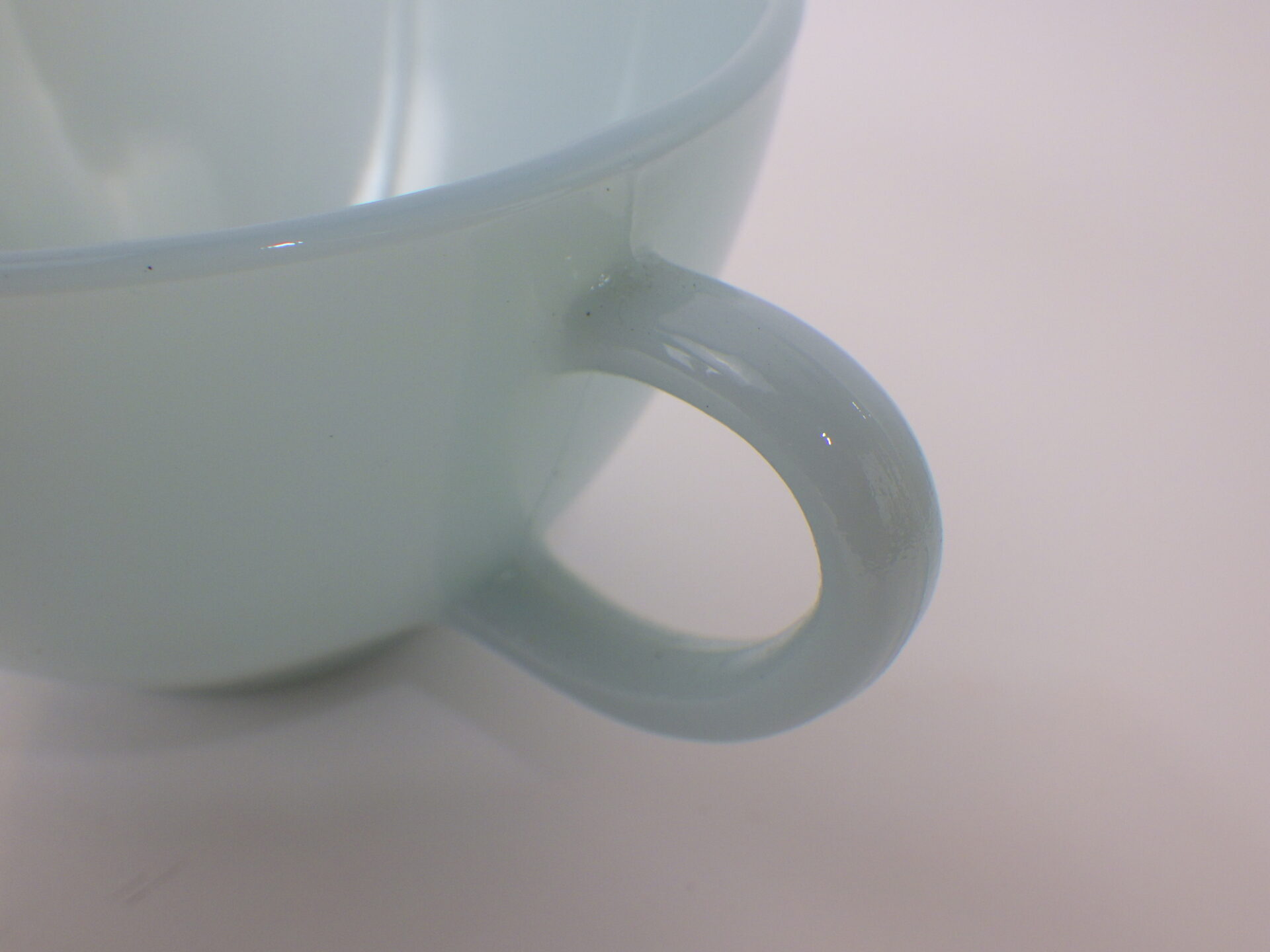 | アメリカで買い付けました。 1956年~58年の三年間だけ製造されていたターコイズブルーのC&Sです。 薄手なので、紅茶やコーヒーを注ぐとほんのり中が透け、とても綺麗ですね。 来客用にもオススメのアイテムです。 |