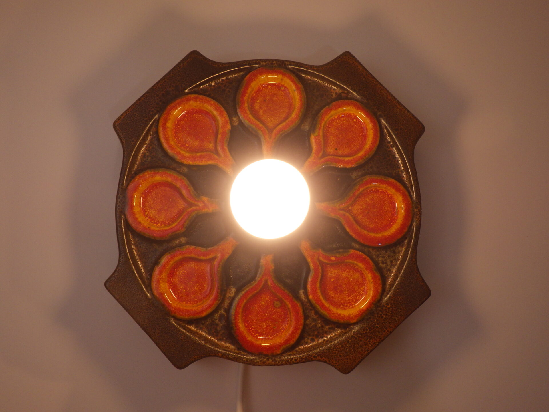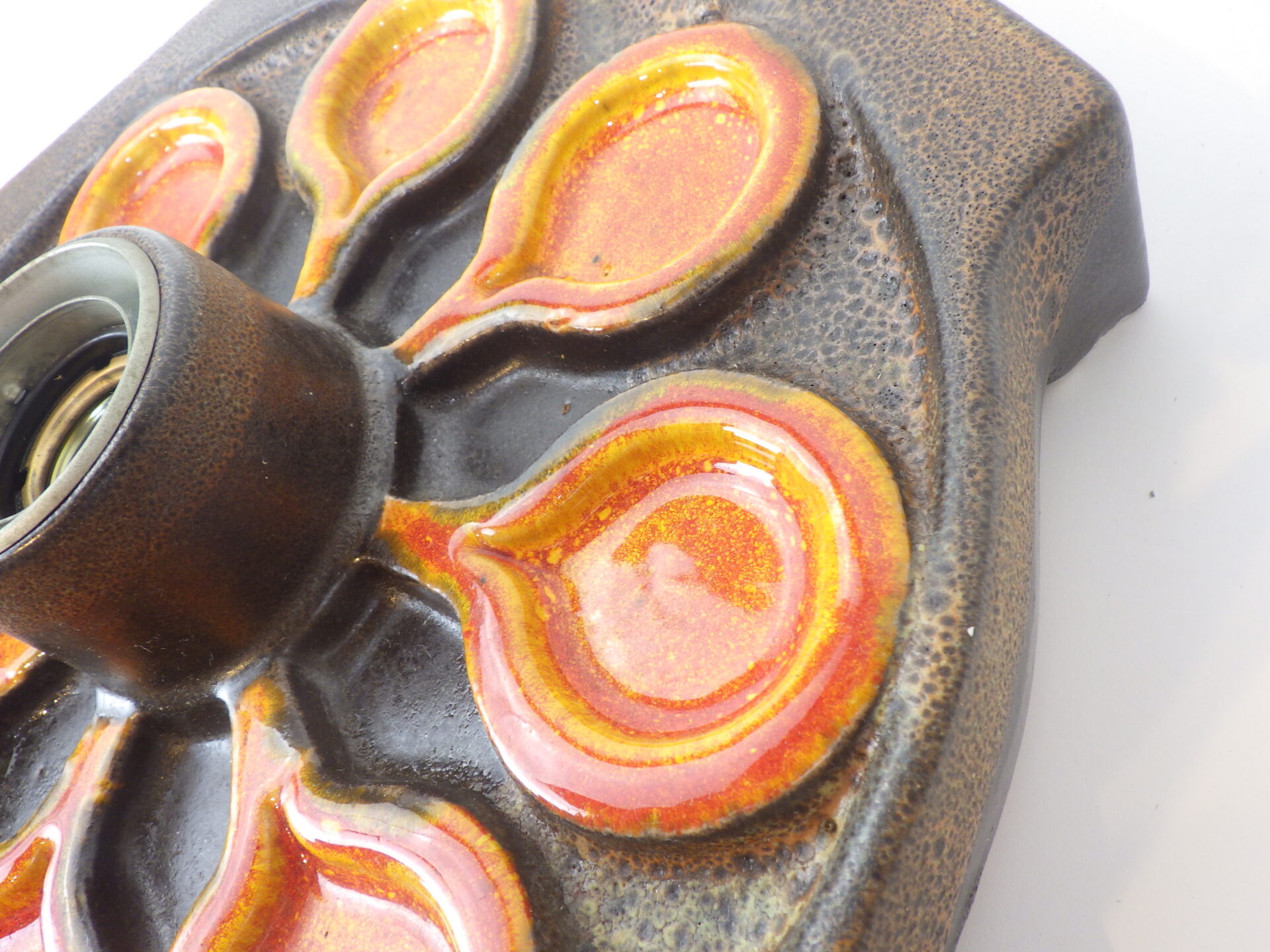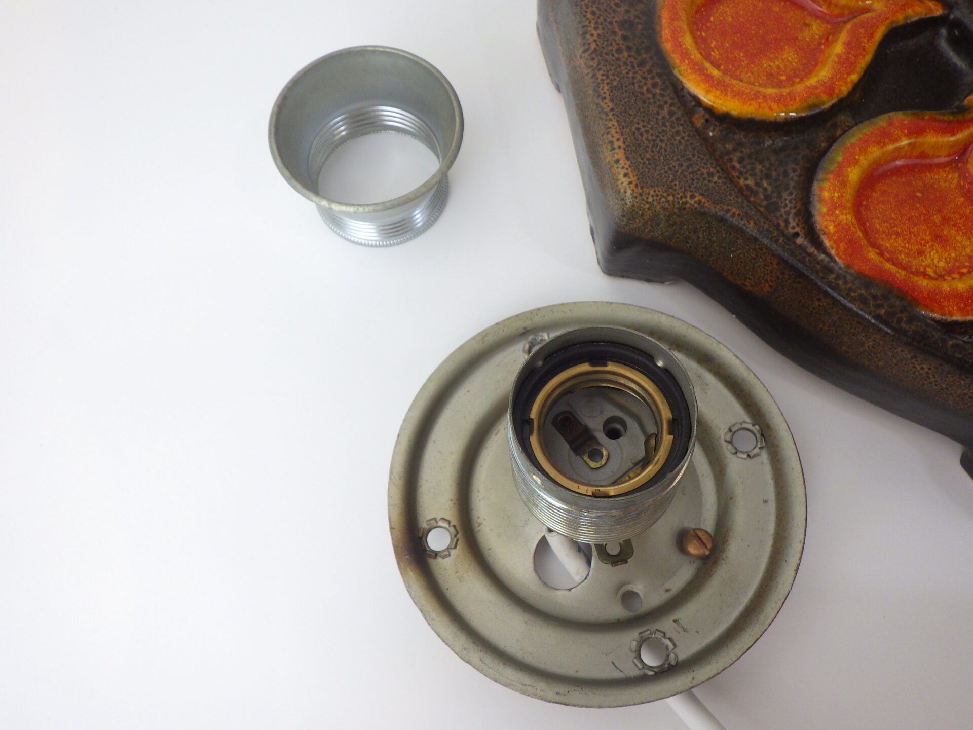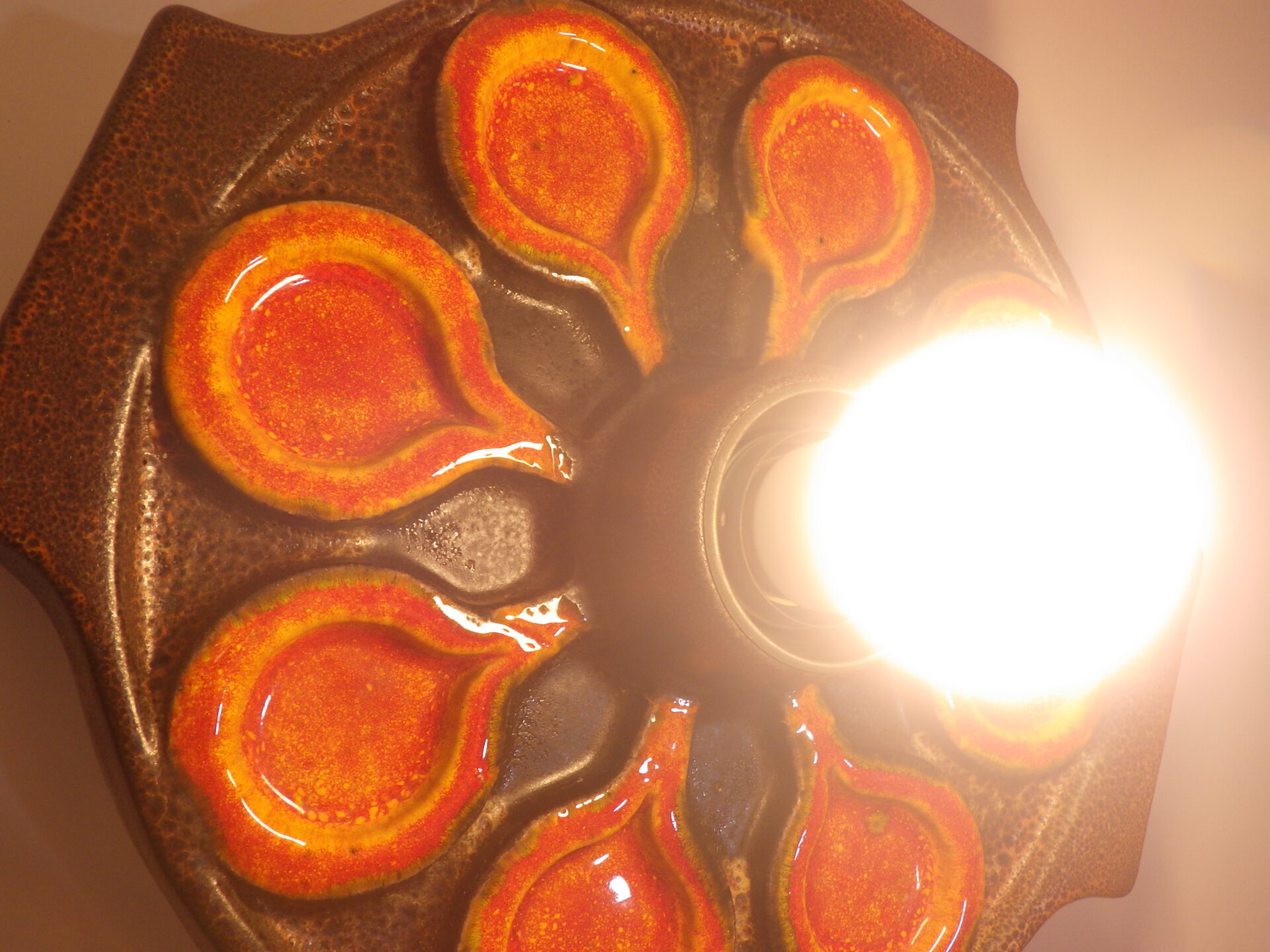 | ヨーロッパで買い付けました。 German art potteryと呼ばれるFat Lavaの陶板のウォールランプです。 ブラウンのまだらなベースに明るいオレンジの花弁が広がるような、大変鮮やかで目を惹くデザインです。 空間に華やかさや洗練された大人らしい可愛らしさを与えてくれるアイテムですね。 陶器ならではのぬくもりも感じられます。 ON/OFFのスイッチはコードに付いています。 電球取り付け部の内側のシルバーのカバーがネジになっており、それを外すと陶板と分解出来ます。陶板を外すことで、壁への取り付けを行うことが出来ます。 (電球の口金サイズ:E26 LED対応) |