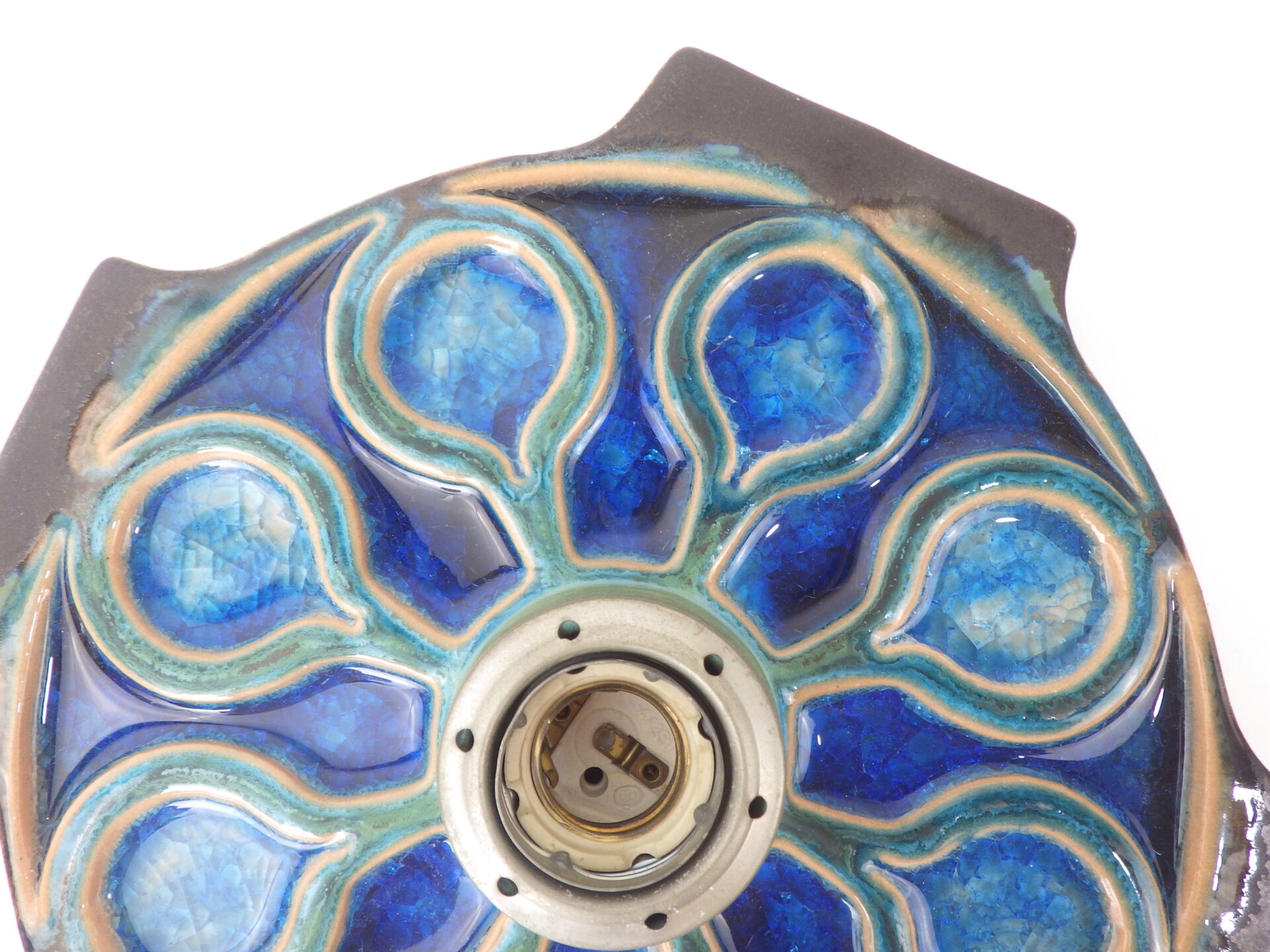 | ヨーロッパで買い付けました。 German art potteryと呼ばれるFat Lavaの陶板のウォールランプです。 太陽の光が反射する海面の様に、濃淡のあるブルーの釉薬が大変美しいアイテムです。 細かな貫入が入っており、点灯するとゆらゆらと輝きが揺らぎ、思わず見入ってしまいます。 空間に華やかさや洗練された大人らしい可愛らしさを与えてくれるアイテムですね。 陶器ならではのぬくもりも感じられます。 ON/OFFのスイッチはコードに付いています。 電球取り付け部の内側のシルバーのカバーがネジになっており、それを外すと陶板と分解出来ます。陶板を外すことで、壁への取り付けを行うことが出来ます。 (電球の口金サイズ:E26 LED対応) |