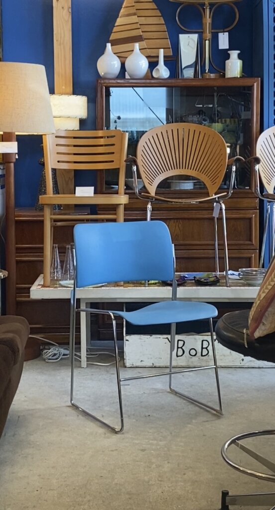 こちらの写真は背もたれと座面がツイード生地になっていますが、この他に、スチール製のブルーとブラウンがございます。