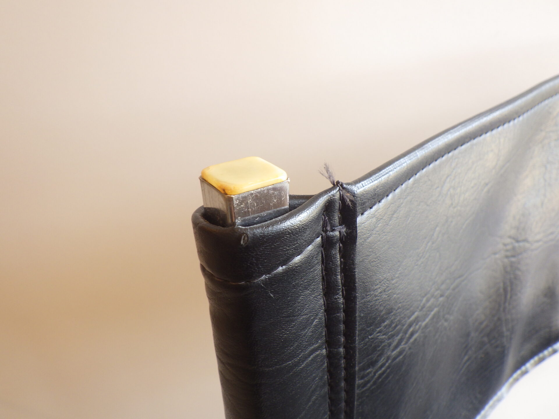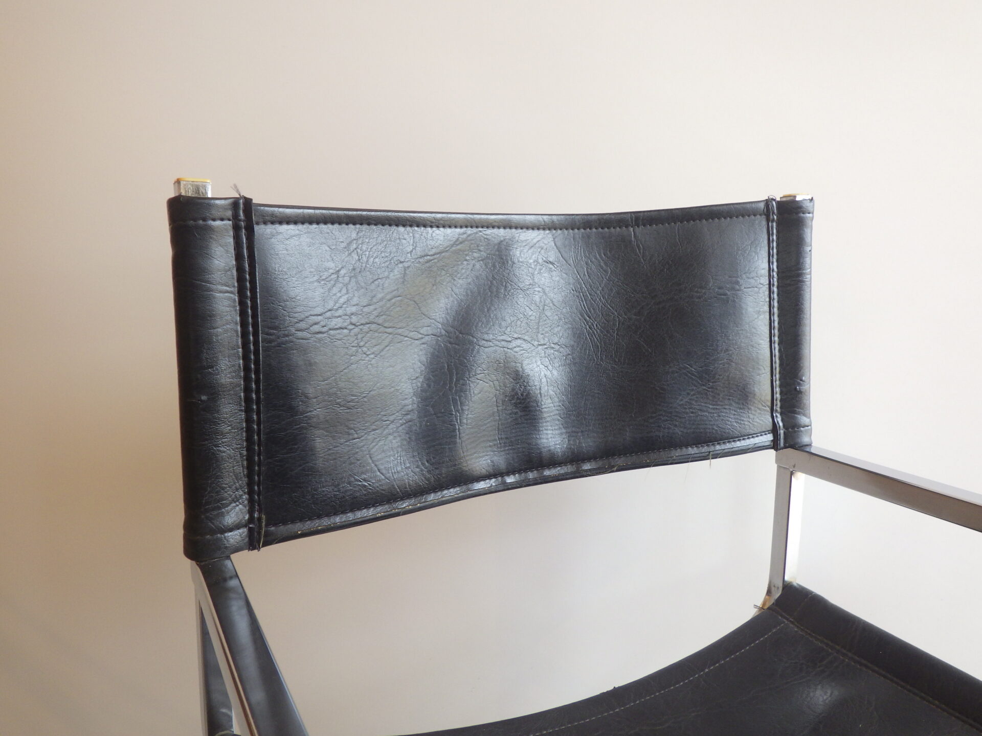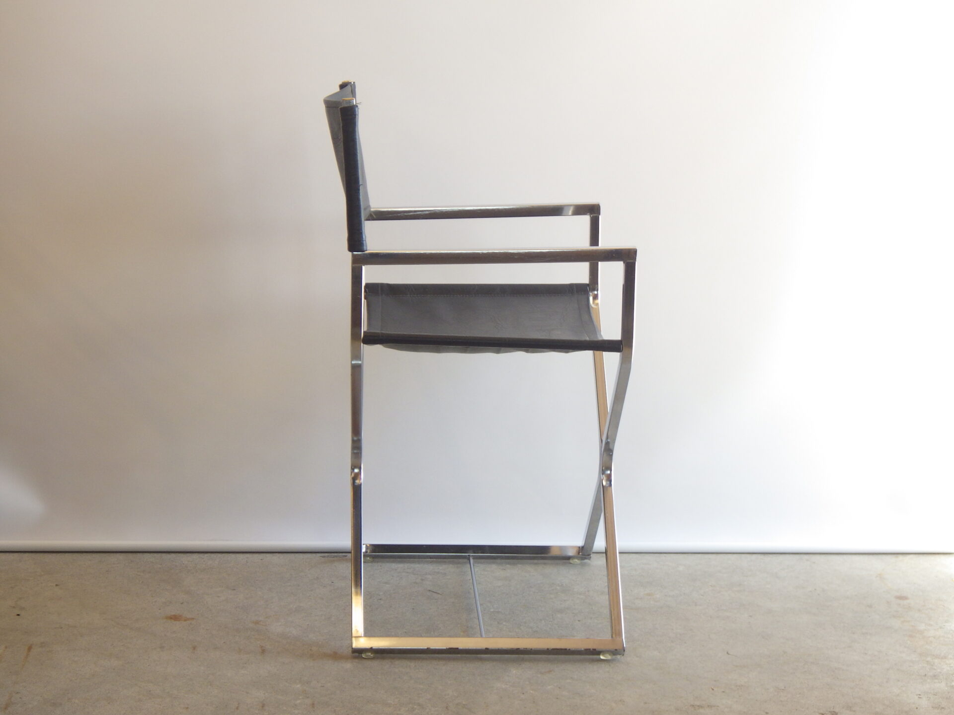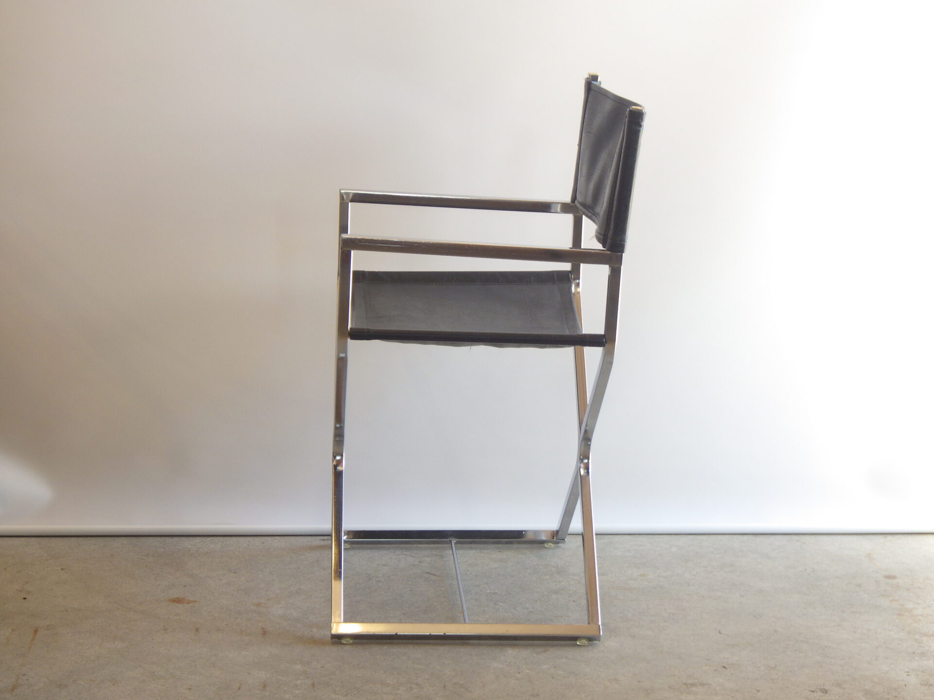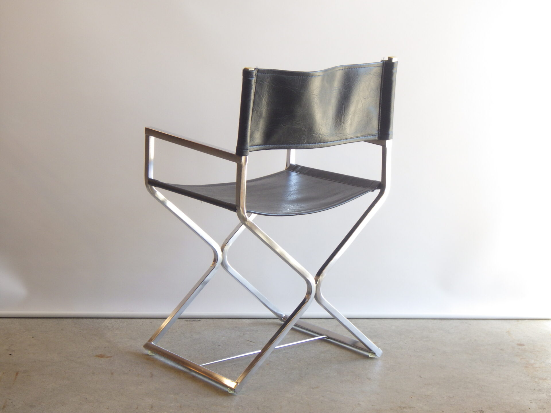 | アメリカで買い付けました。 Robert Kjer Jakobsenデザインのディレクターズチェアです。 クロームベースにブラックのビニールレザーの組み合わせが、とても雰囲気ある仕上がりとなっています。 脚はフォールディングではなく、溶接で固定されている無骨感満載な雰囲気もポイントです。 室内使いはもちろんのこと、ウッドデッキや中庭などでコーヒーブレイクやBBQをする際にご使用いただくのにおすすめです。 |