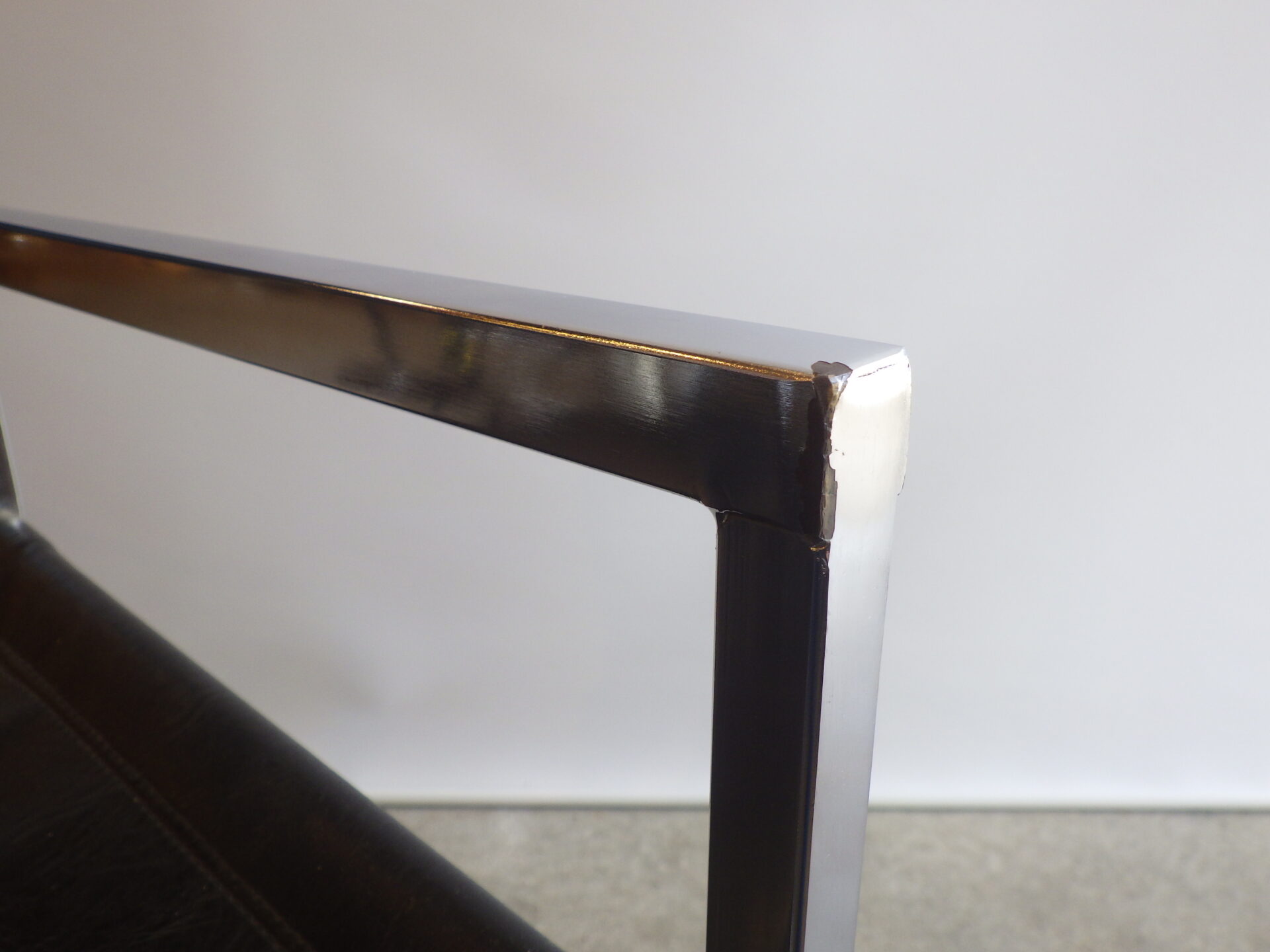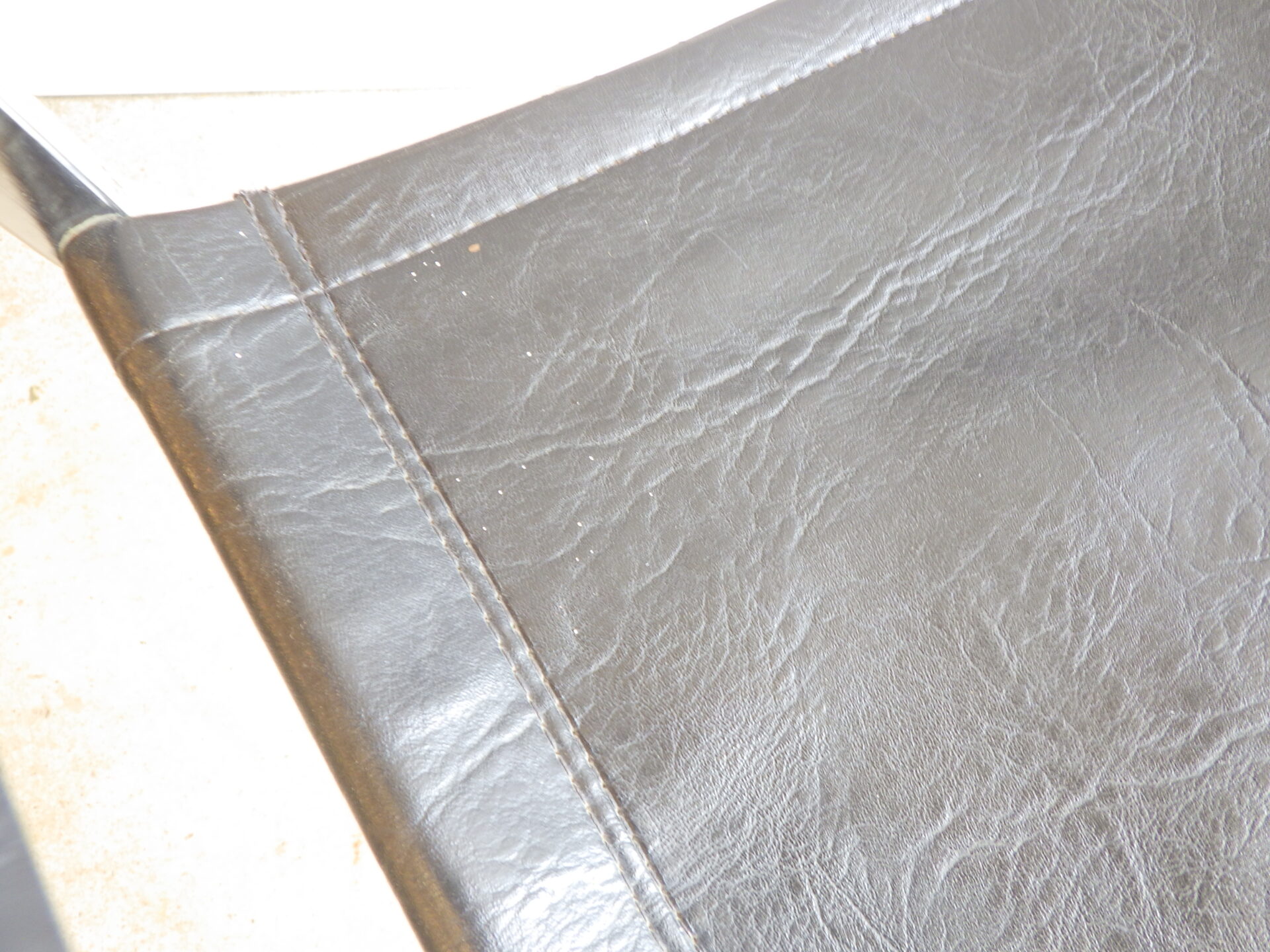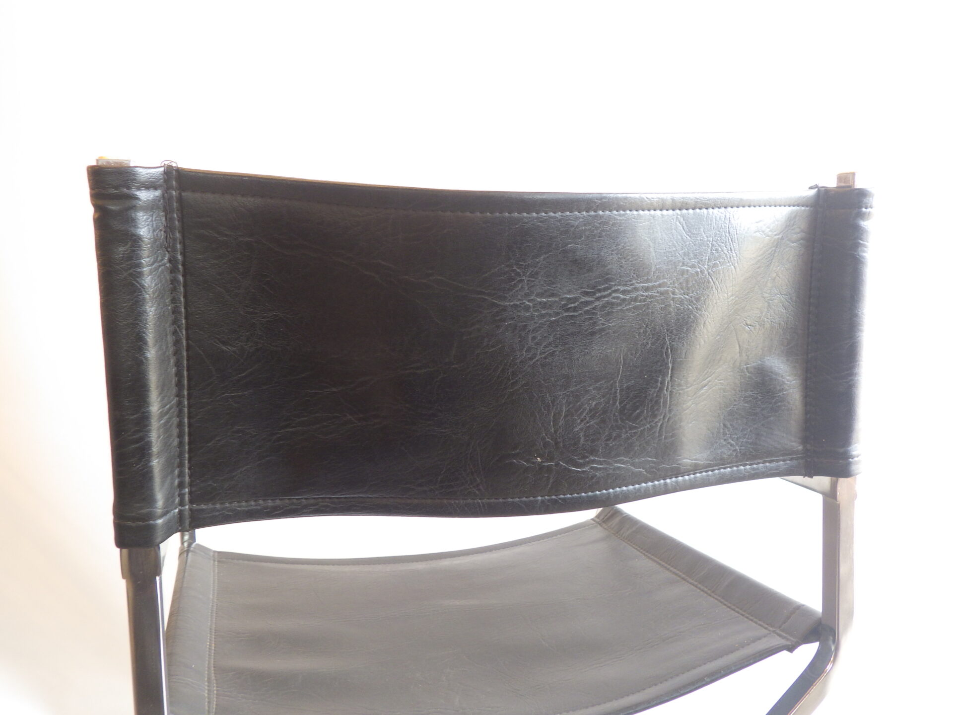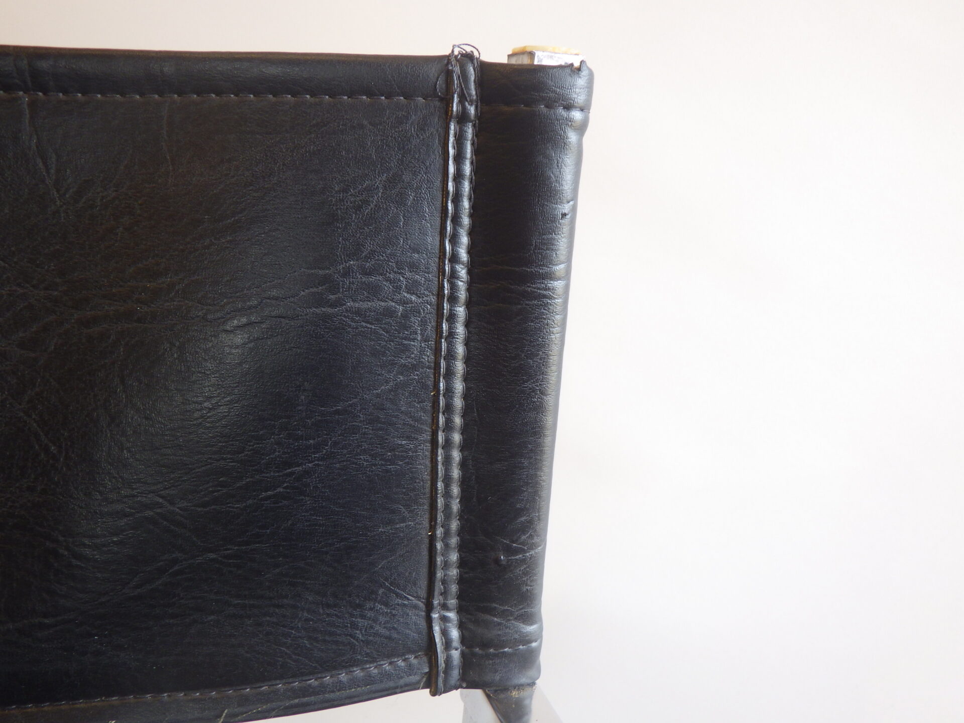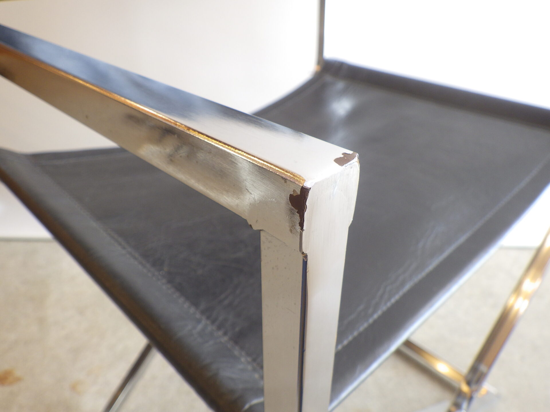 | アメリカで買い付けました。 Robert Kjer Jakobsenデザインのディレクターズチェアです。 クロームベースにブラックのビニールレザーの組み合わせが、とても雰囲気ある仕上がりとなっています。 脚はフォールディングではなく、溶接で固定されている無骨感満載な雰囲気もポイントです。 室内使いはもちろんのこと、ウッドデッキや中庭などでコーヒーブレイクやBBQをする際にご使用いただくのにおすすめです。 |