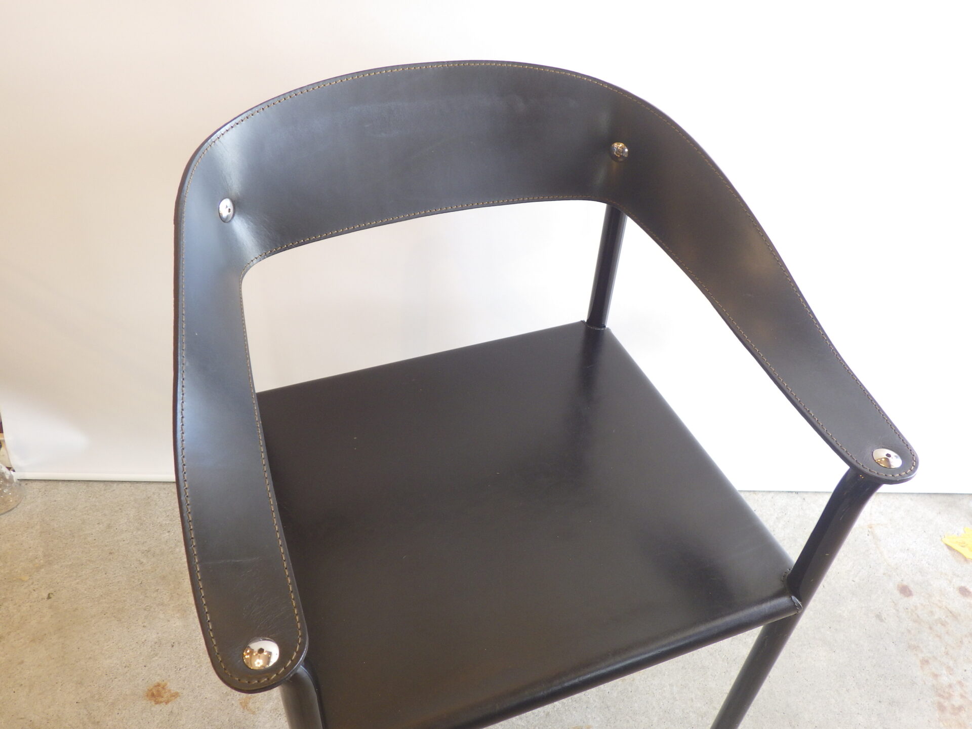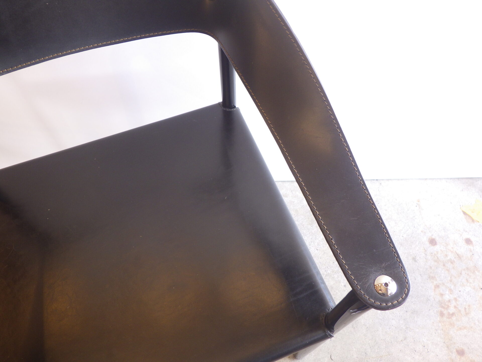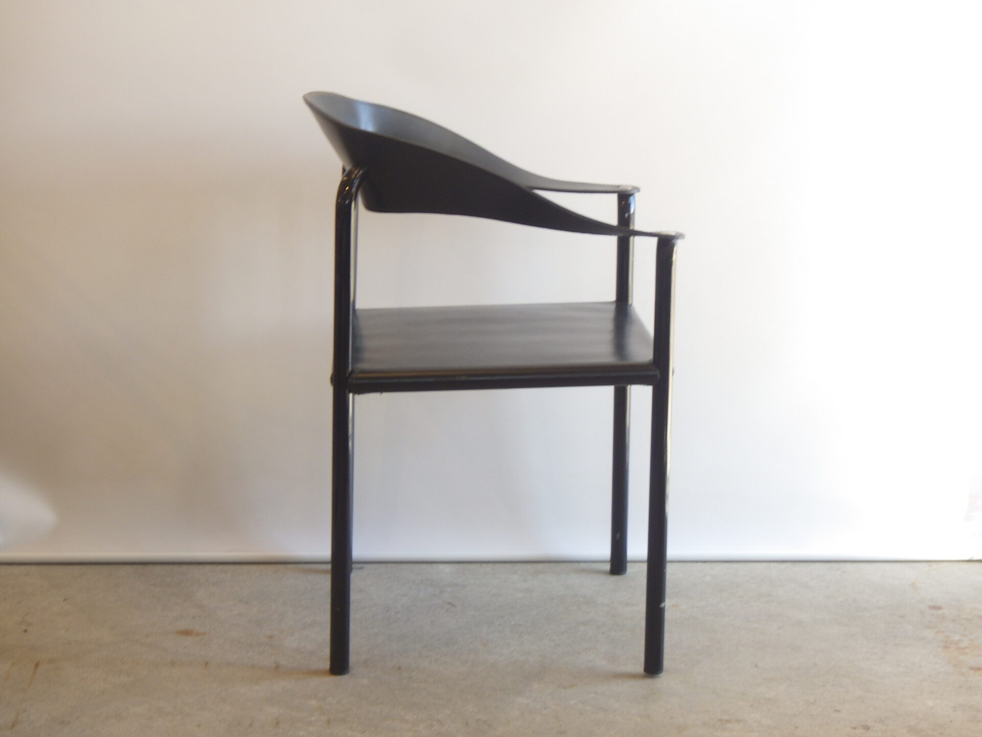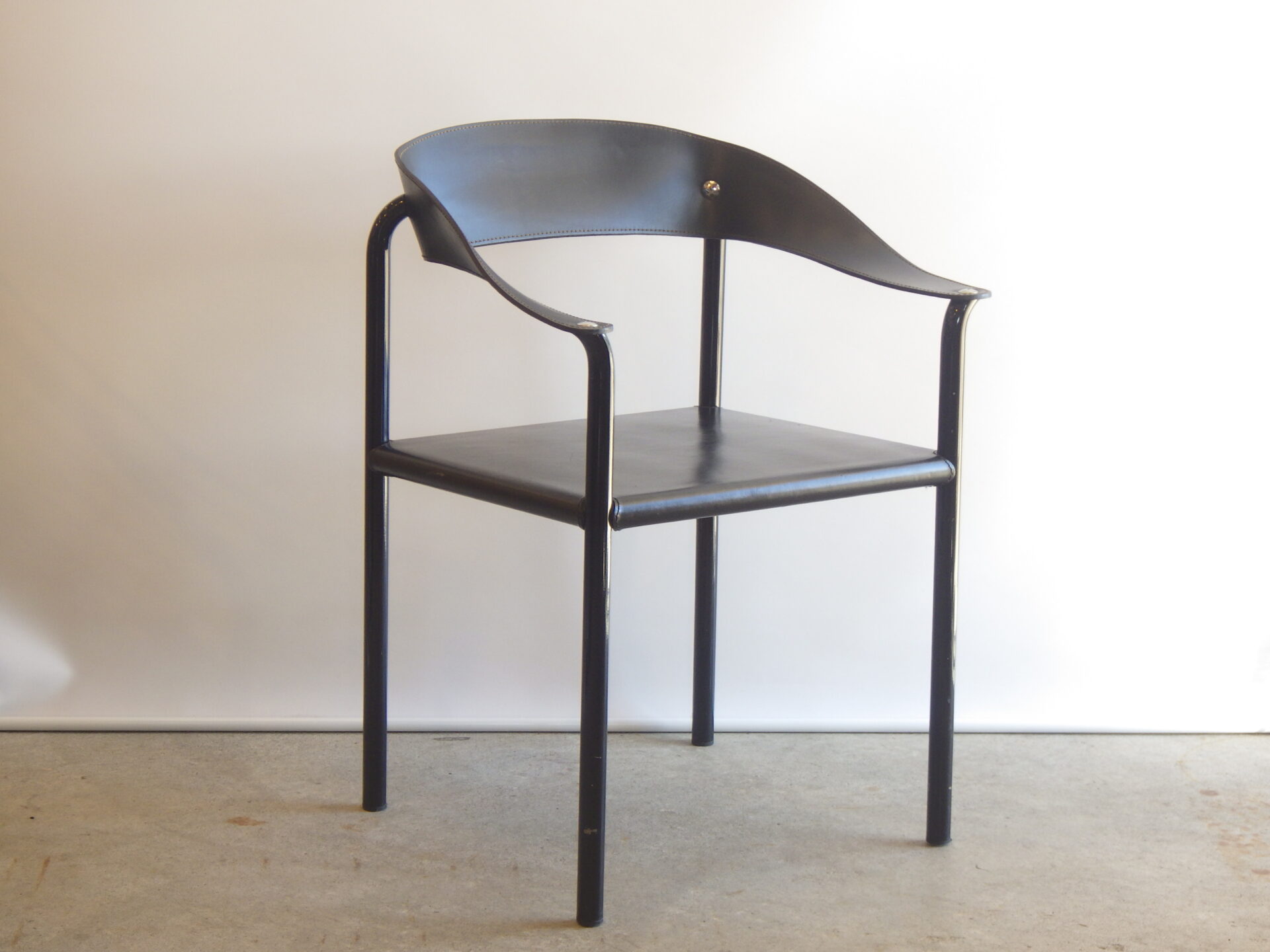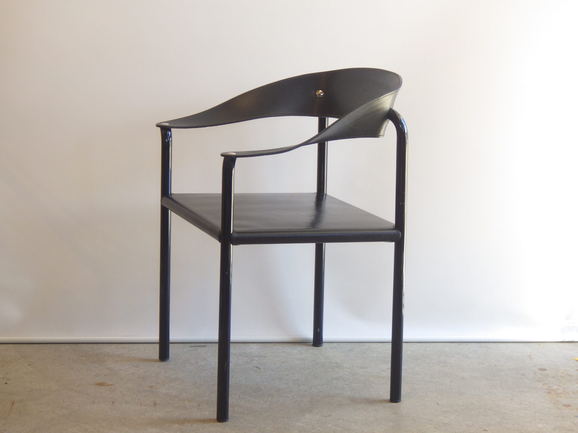 | ヨーロッパで買い付けました。 イタリア製のダイニングチェアです。 スチールフレーム、レザーともにブラックで、ひじ掛けにはクロムの金具がついています。 近年再評価されつつあるポストモダンデザイン。 ダイニングチェアとしてご使用いただくのはもちろんのこと、壁際に置いてこの時代ならではのデザインを空間のアクセントとして取り入れて頂くのもおすすめしています。 |