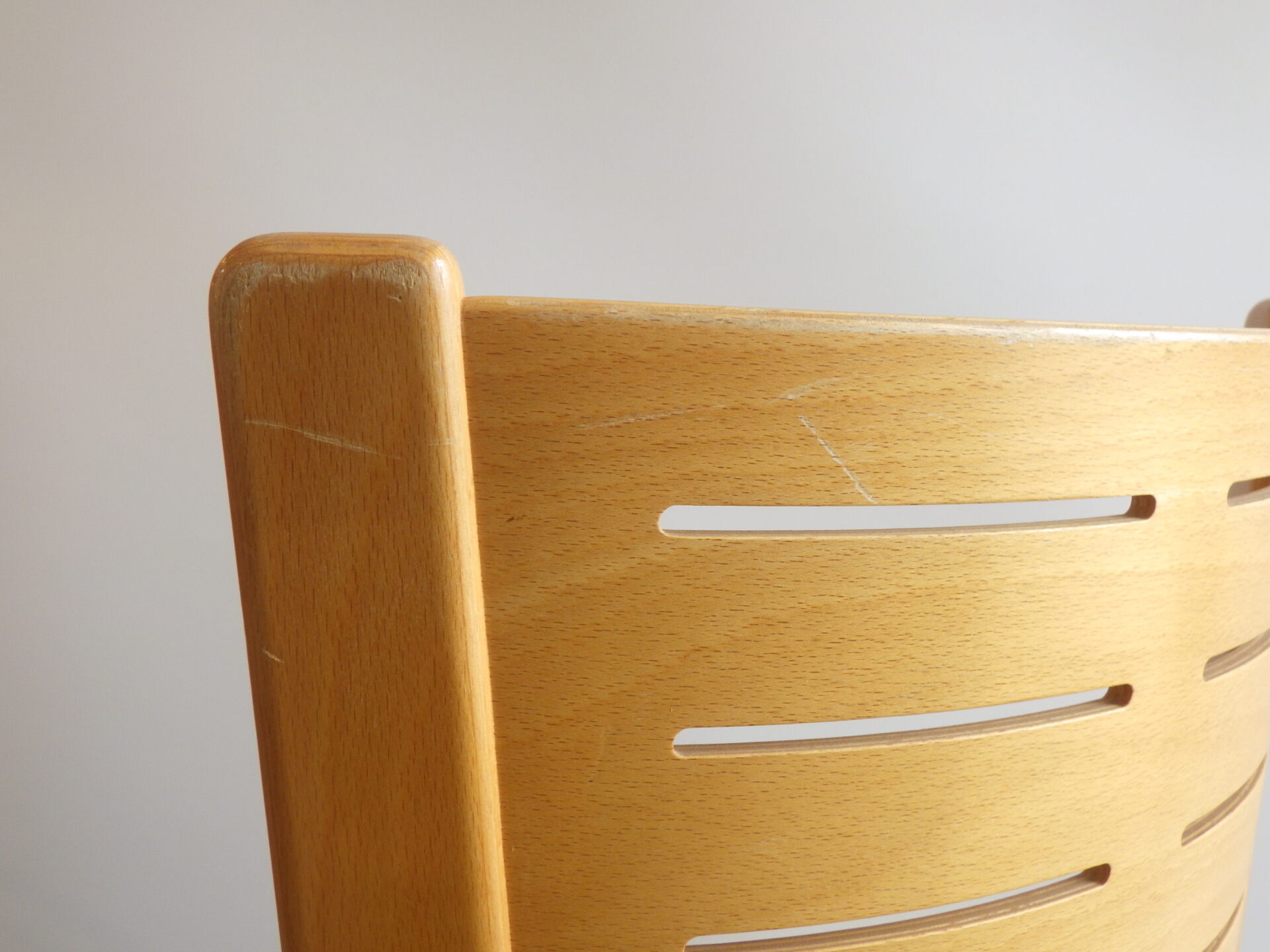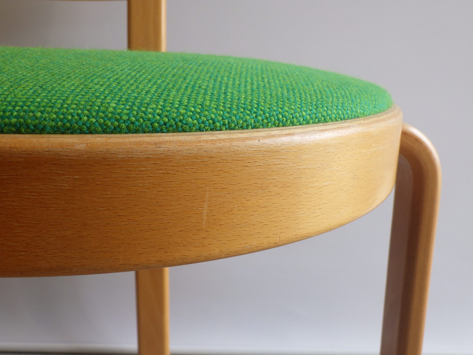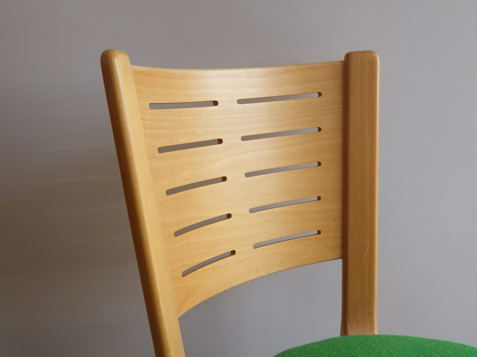 | ヨーロッパで買い付けました。 デンマークの老舗家具メーカーMagnus Olesen(マグナス・オルセン)社製、ダイニングチェアです。 デザイナーは1971年に発表した「8000シリーズ」で世界的評価を受けているRub Thygesen&Johnny Sorensen。 有機的な曲木のフレームには、脚部の取り付けも含め釘やネジが一切使われていません。 ビーチ材のナチュラルで優しい木目と色味も大変魅力的ですね。 こちらは明るめのグリーンのファブリックが空間の良い差し色になってくれそう。 スタッキングできるところもポイントですね。 インテリアを機能的で美しく表現する、マグナス・オルセンらしいアイテムです。 |
