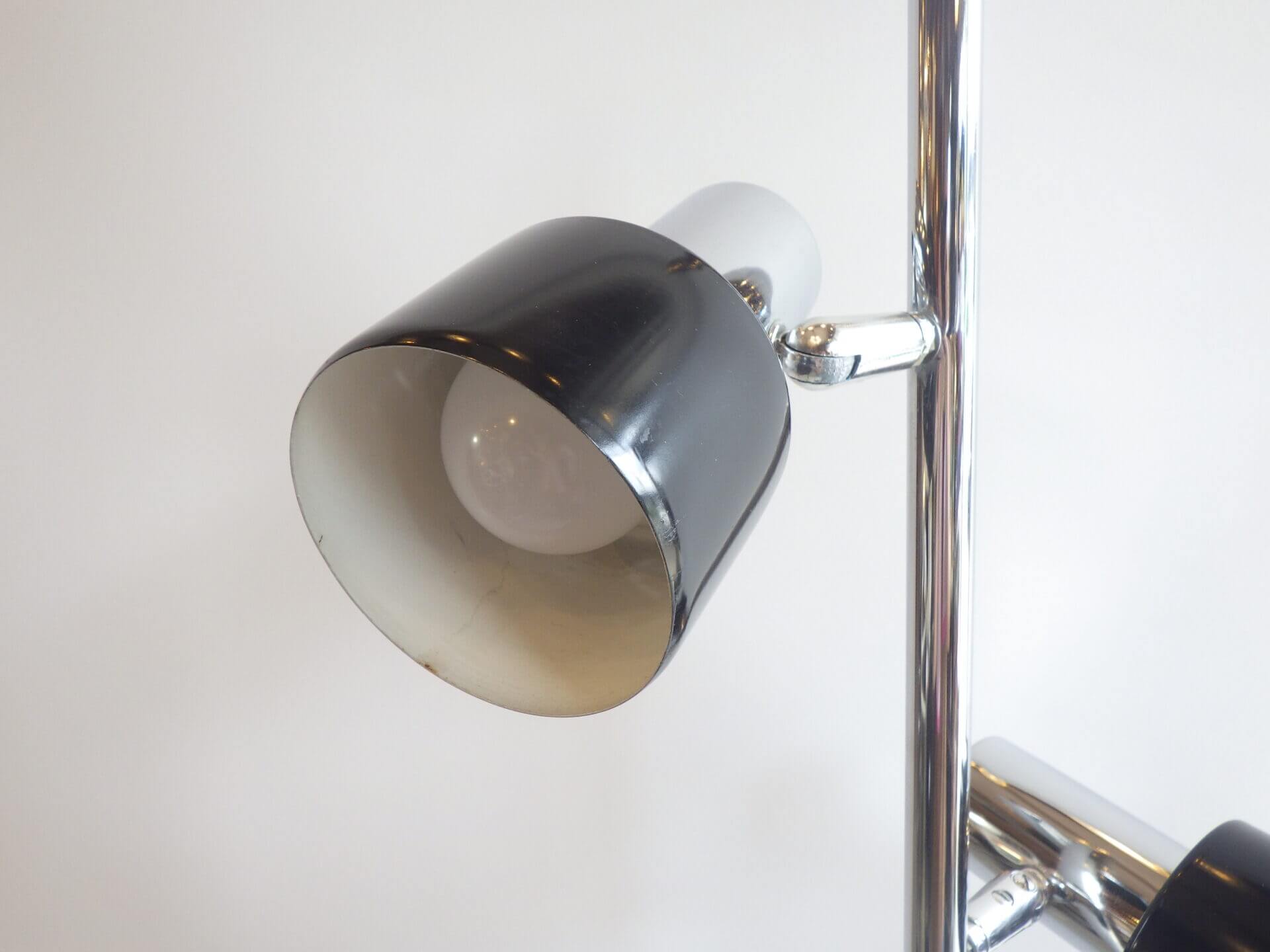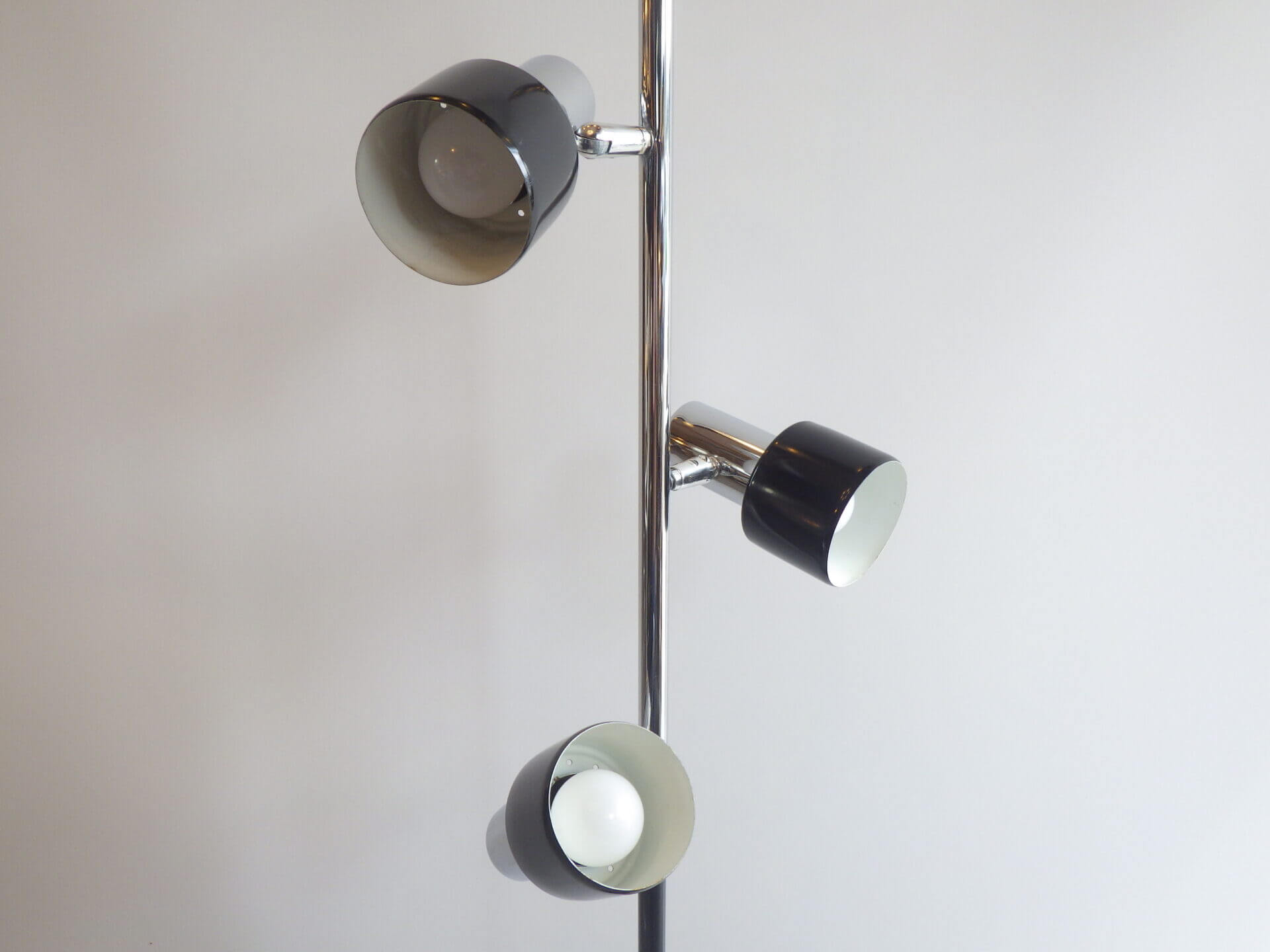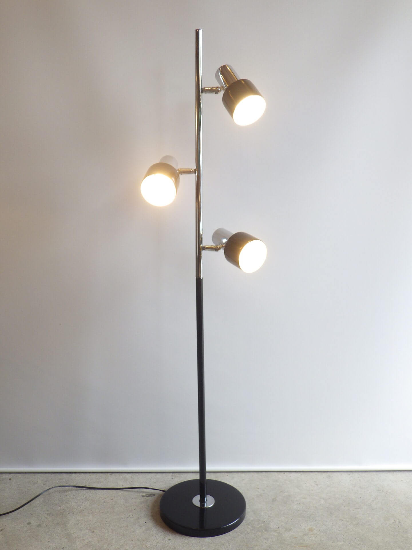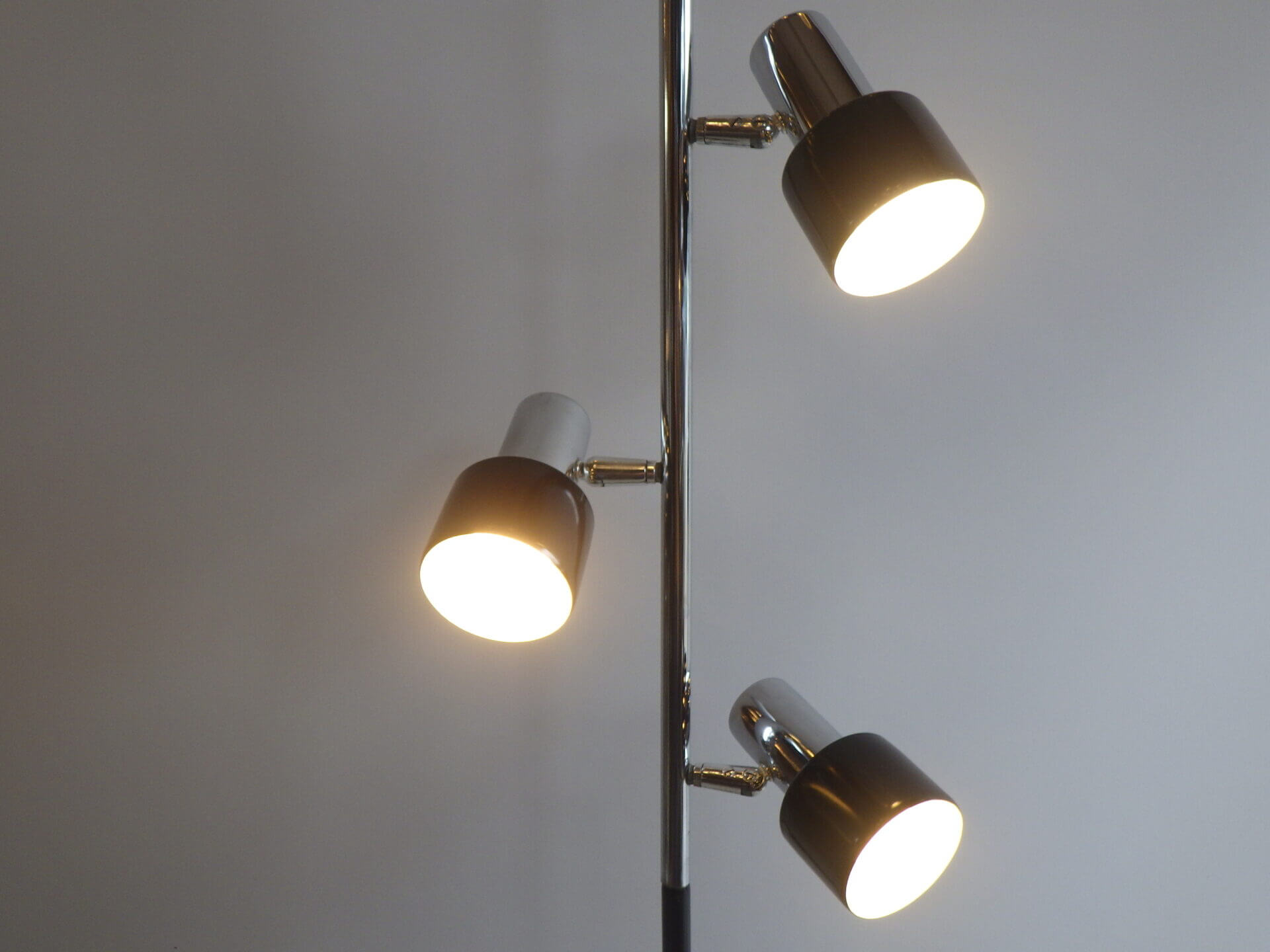 | アメリカで買い付けました。 1970年代頃のフロアランプです。 三灯それぞれが、支柱との付け根とシェードの付け根の二か所可動するため、自由に広い範囲を照らすことが出来ます。 スッキリとしたデザインですので、様々なテイストの空間に馴染んでくれそう。 シェードの頭についているスイッチで、三灯それぞれON/OFFの切り替えが出来ます。 インテリアのアクセントにいかがですか? |