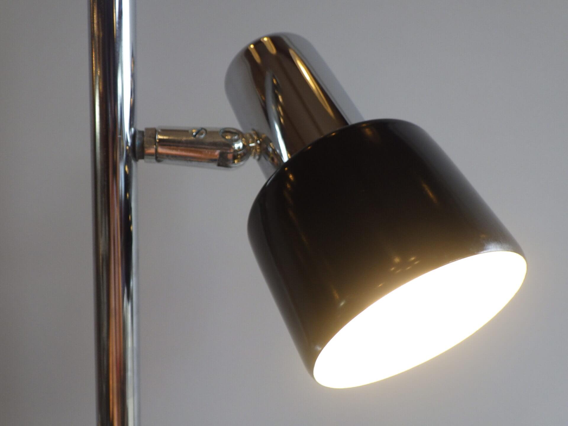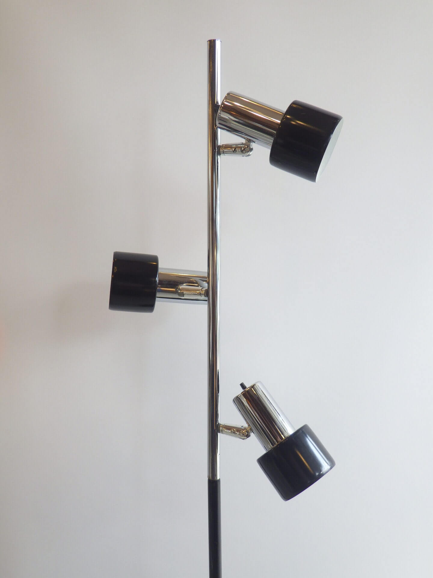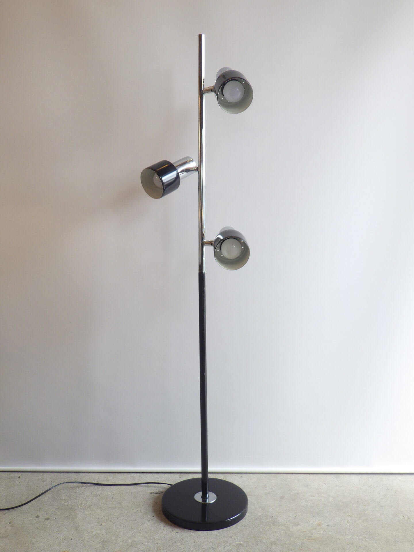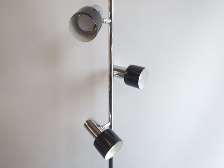 | アメリカで買い付けました。 1970年代頃のフロアランプです。 三灯それぞれが、支柱との付け根とシェードの付け根の二か所可動するため、自由に広い範囲を照らすことが出来ます。 スッキリとしたデザインですので、様々なテイストの空間に馴染んでくれそう。 シェードの頭についているスイッチで、三灯それぞれON/OFFの切り替えが出来ます。 インテリアのアクセントにいかがですか? |