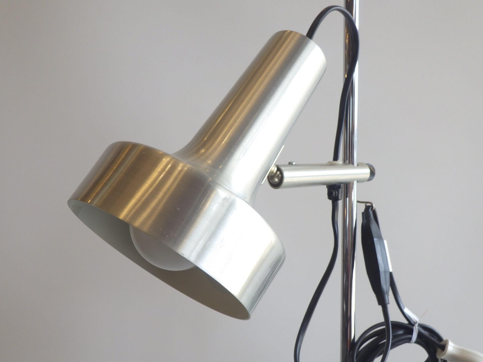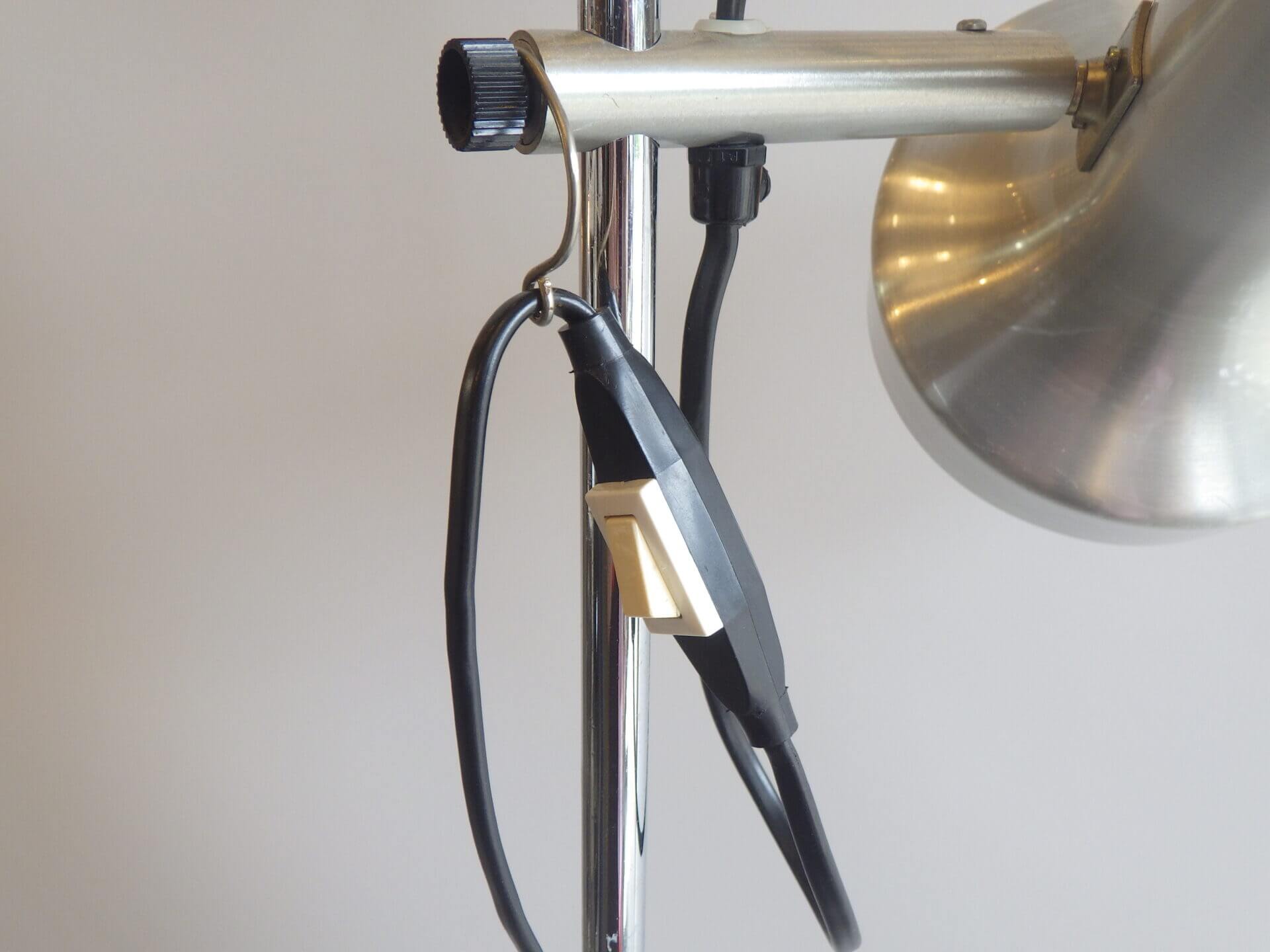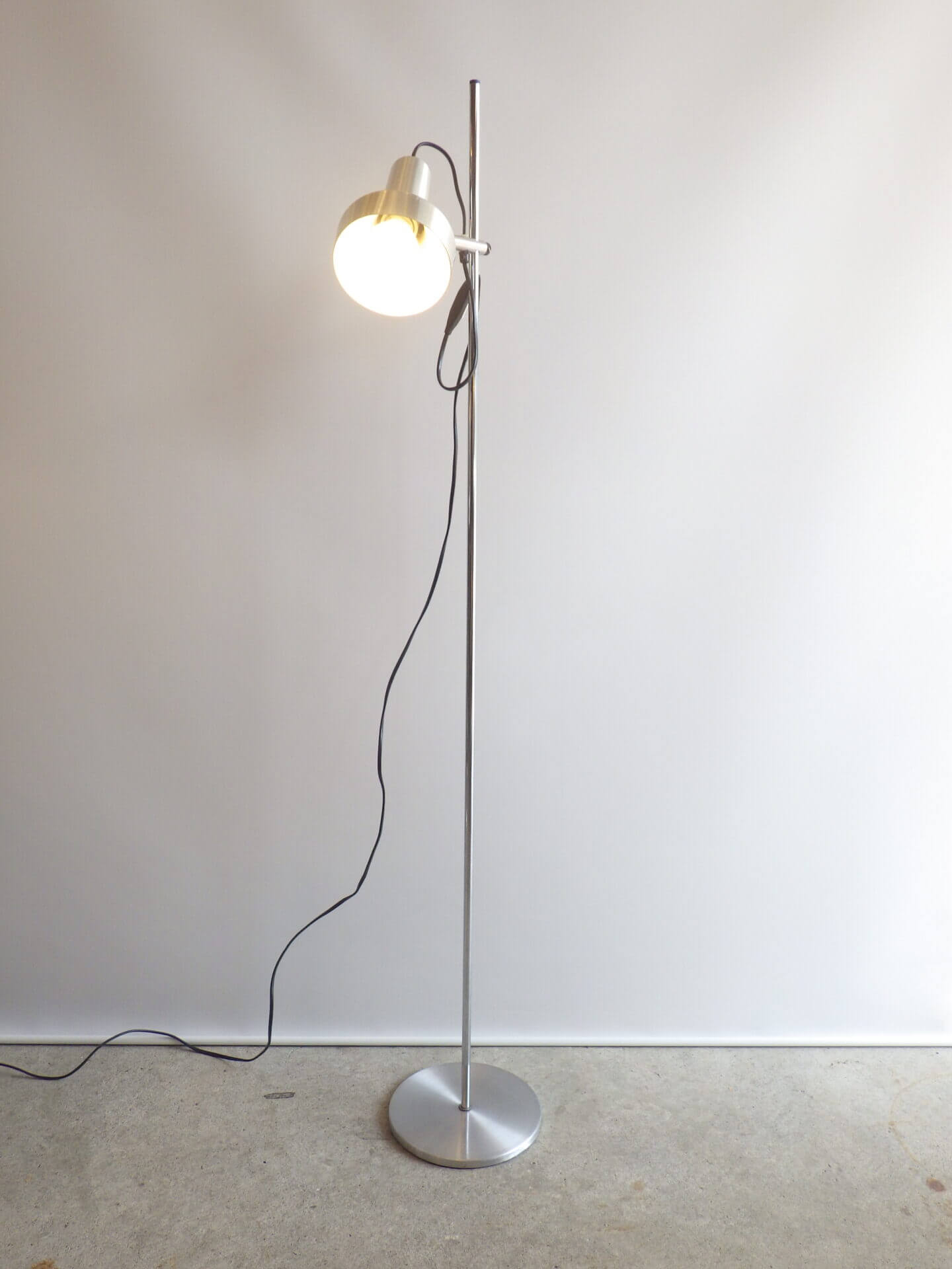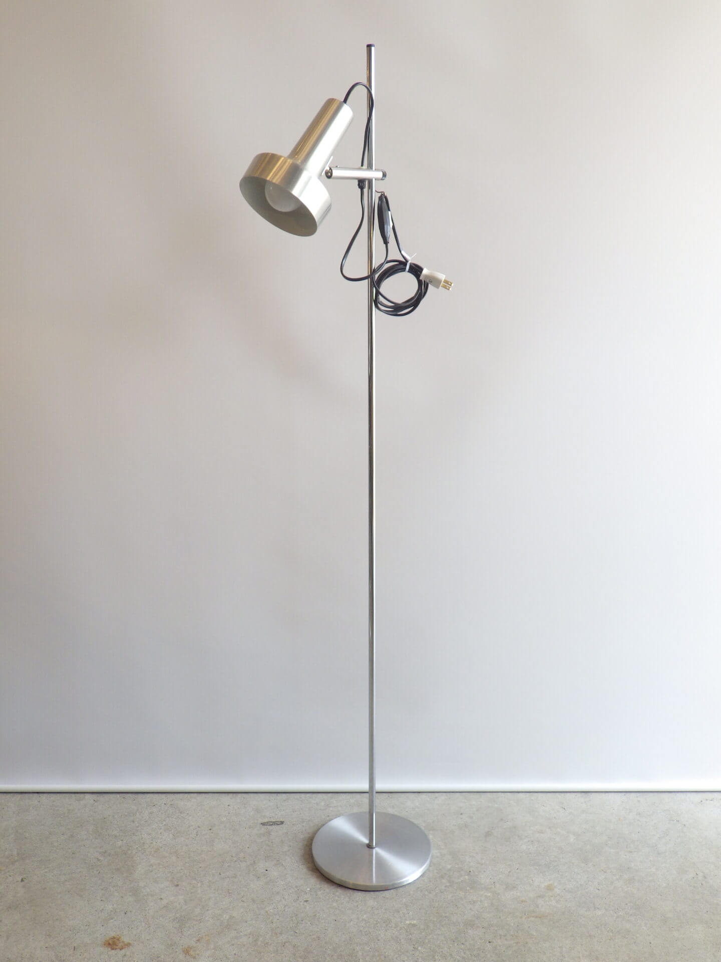 | ヨーロッパで買い付けました。 メタリックな質感とシンプルでスマートなフォルムが良い雰囲気のフロアランプです。 シェードの高さ、角度が変えられ、スポットライトのようにご使用いただくのに良さそうです。 コードについているスイッチでON/OFFの切り替えが出来ます。 インテリアのアクセントにいかがですか? |
