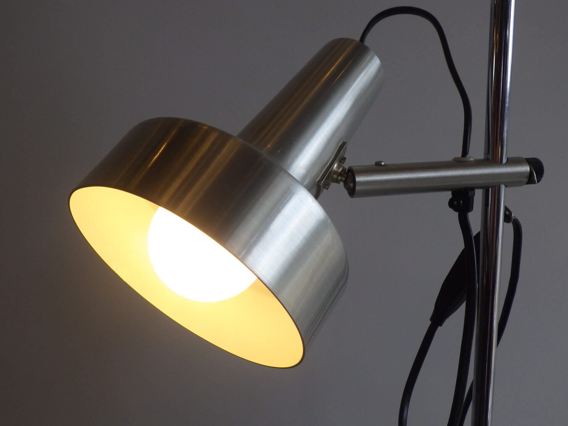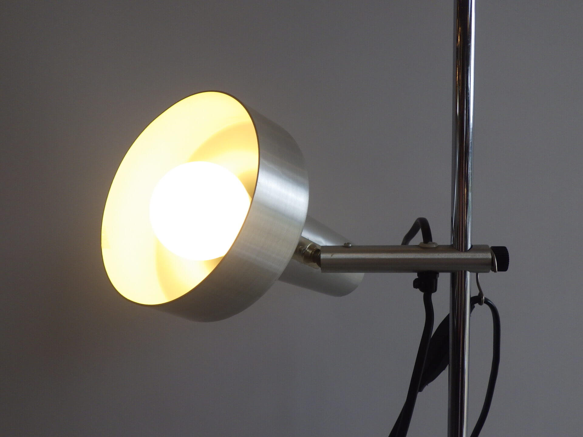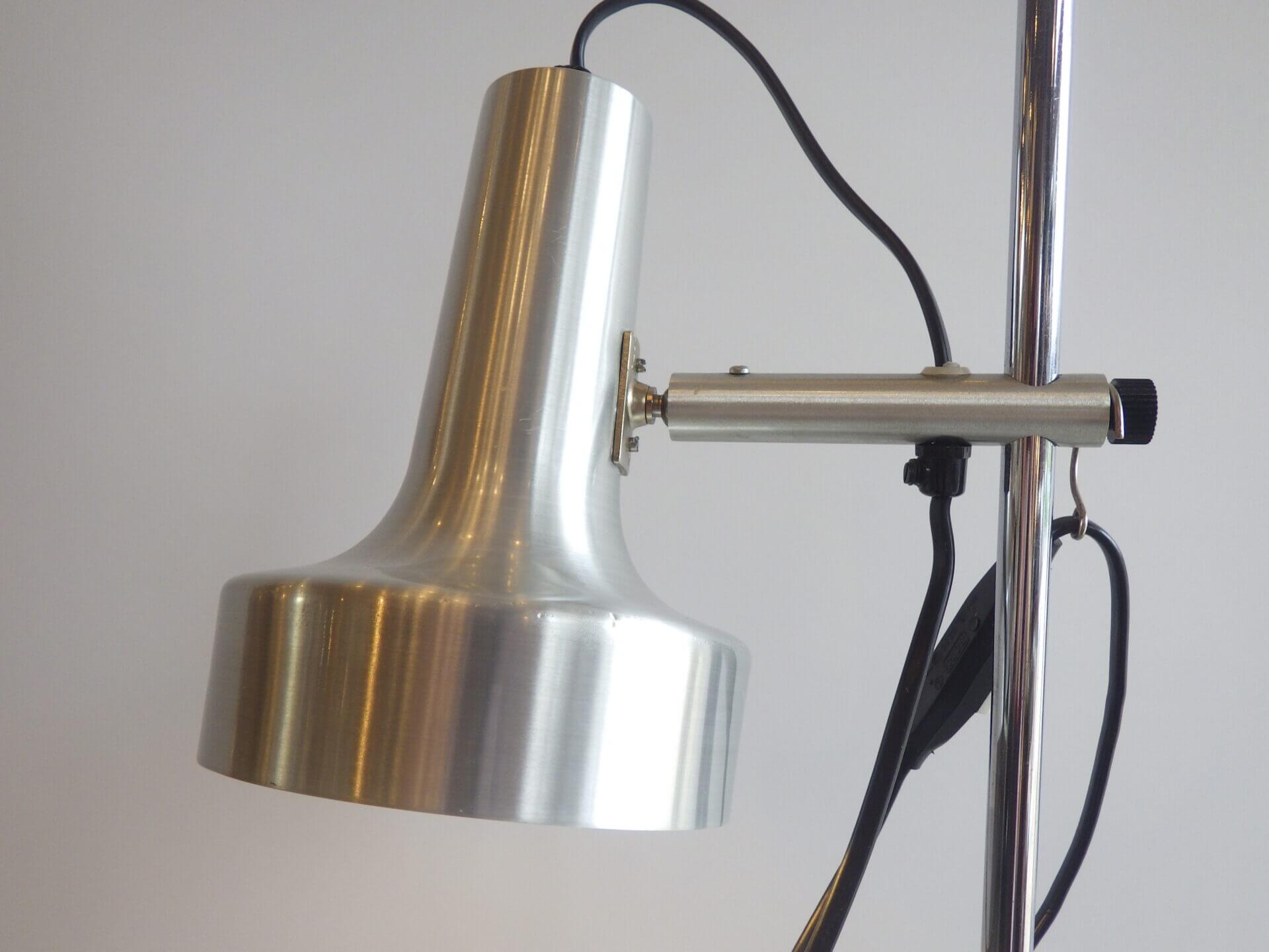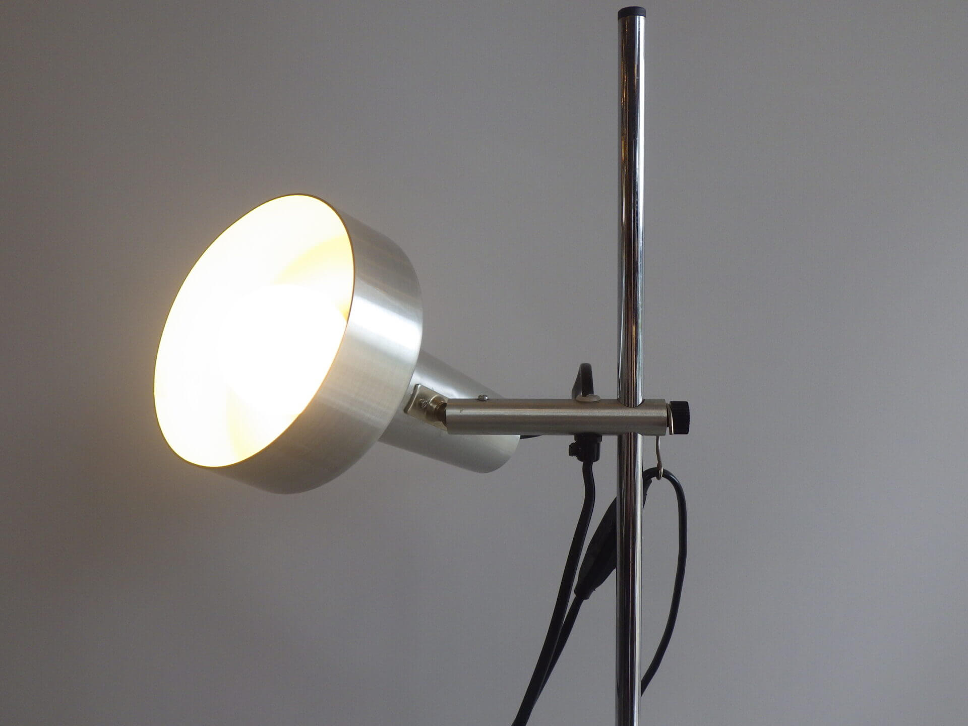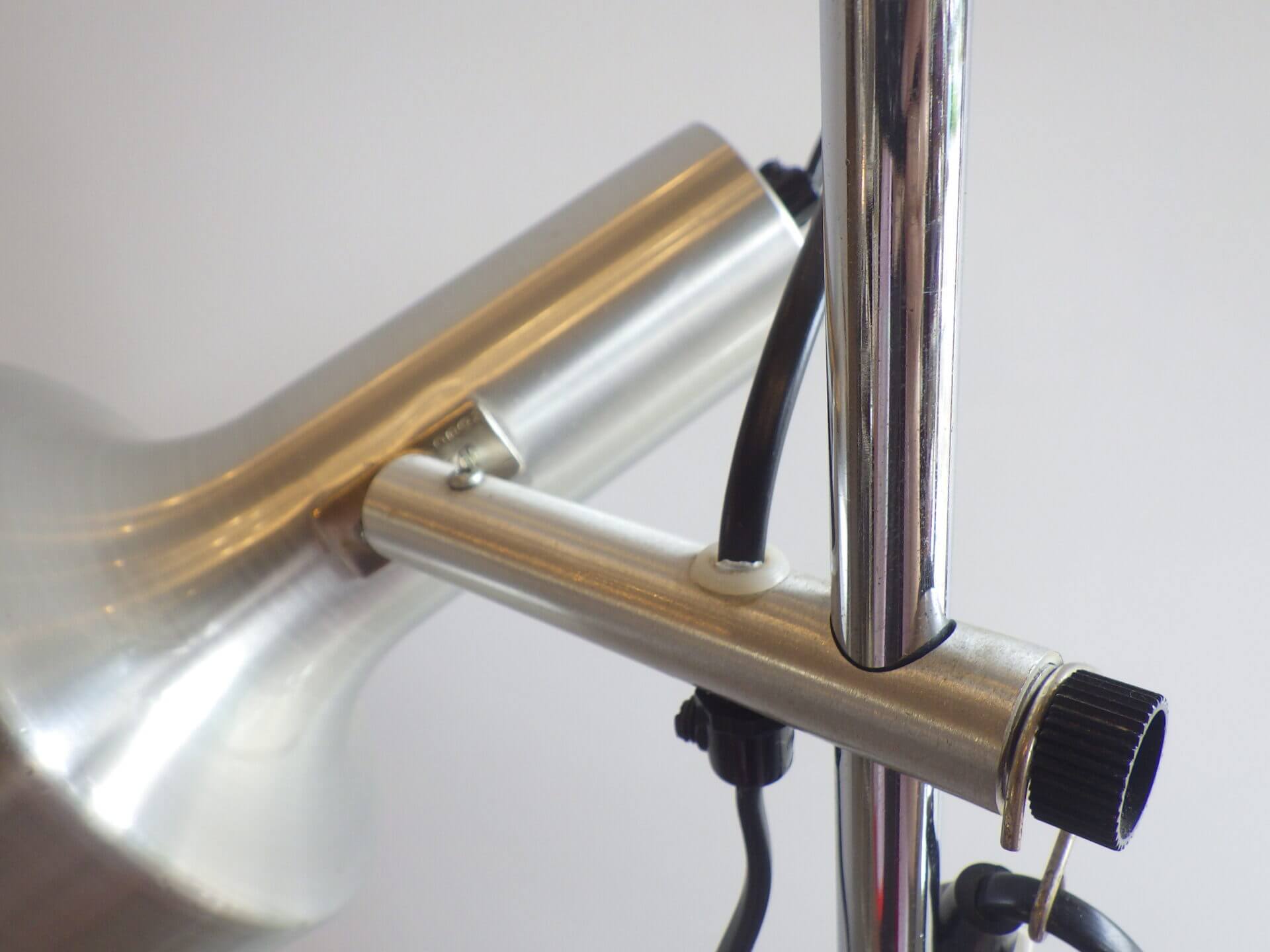 | ヨーロッパで買い付けました。 メタリックな質感とシンプルでスマートなフォルムが良い雰囲気のフロアランプです。 シェードの高さ、角度が変えられ、スポットライトのようにご使用いただくのに良さそうです。 コードについているスイッチでON/OFFの切り替えが出来ます。 インテリアのアクセントにいかがですか? |