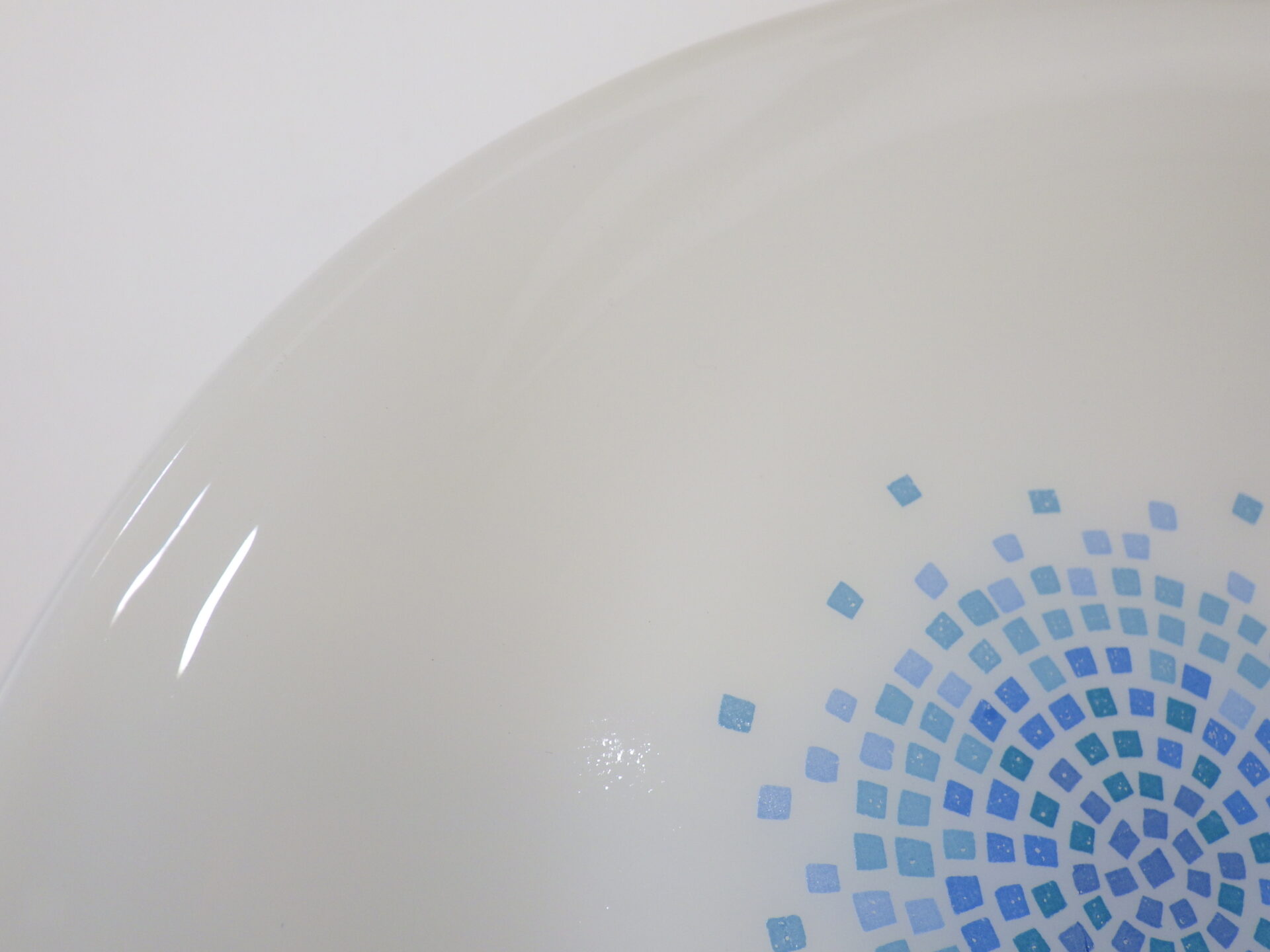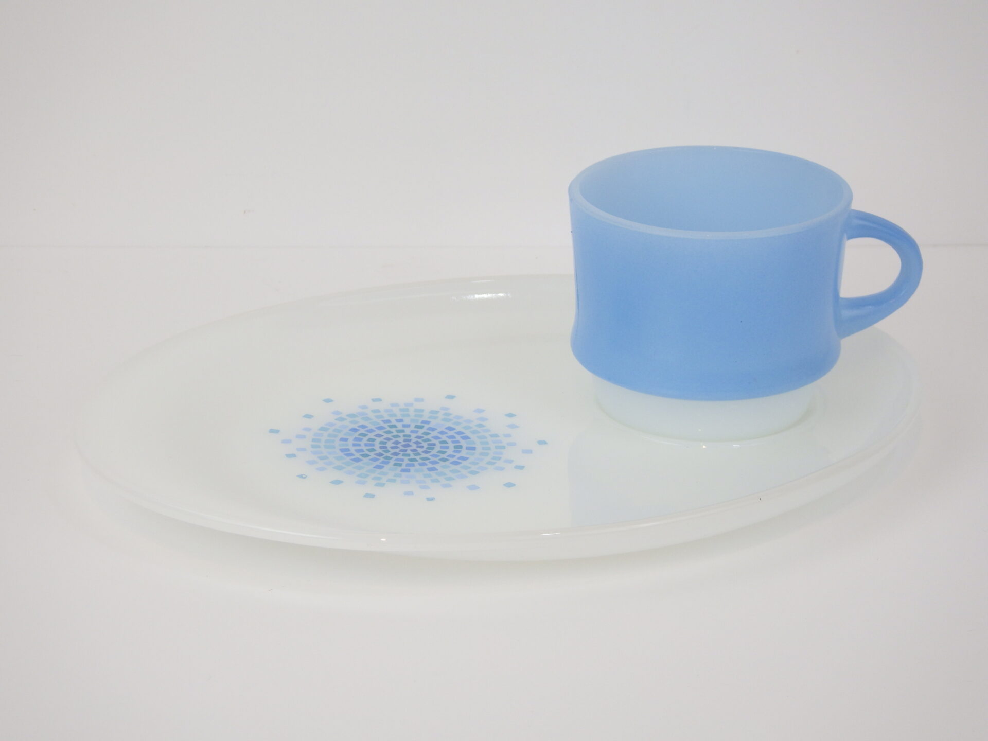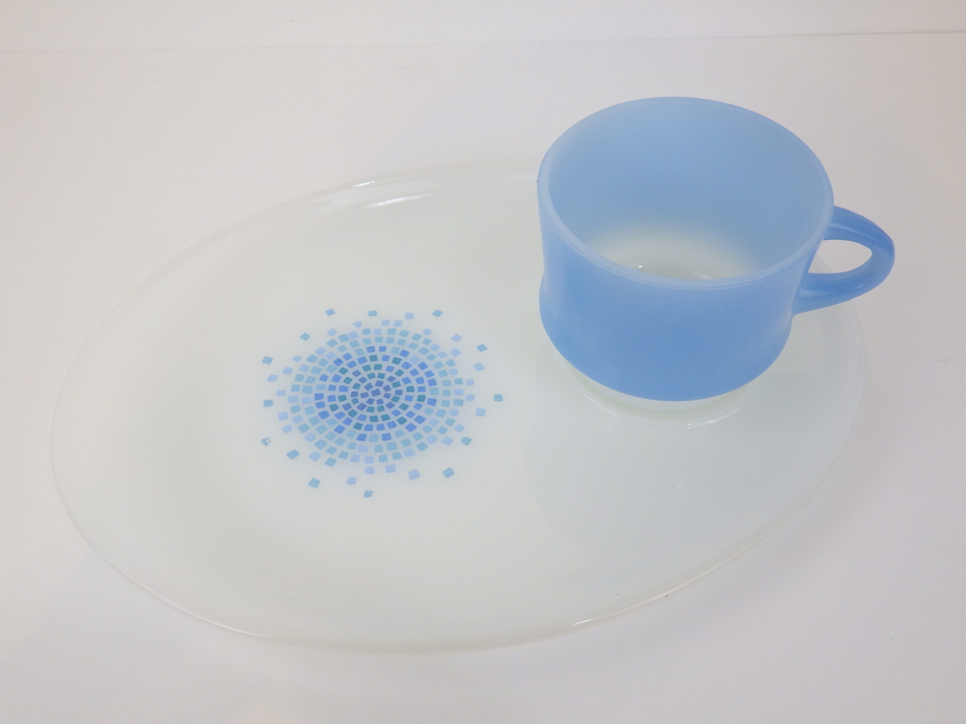 | アメリカで買い付けました。 ファイヤーキングのブルーモザイク、スナックセットです。 1966年から1969年に四年間だけ製造されていたシリーズで、ブルーのタイル柄が可愛らしいアイテムです。 モダンで落ち着いた雰囲気がとても良いですね。 スナックセットなので、デザート、朝食などにお勧めです。 |