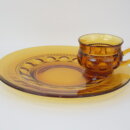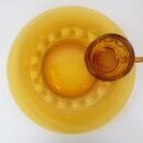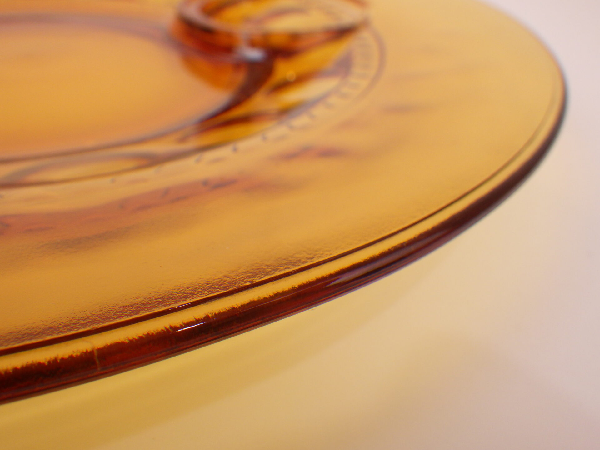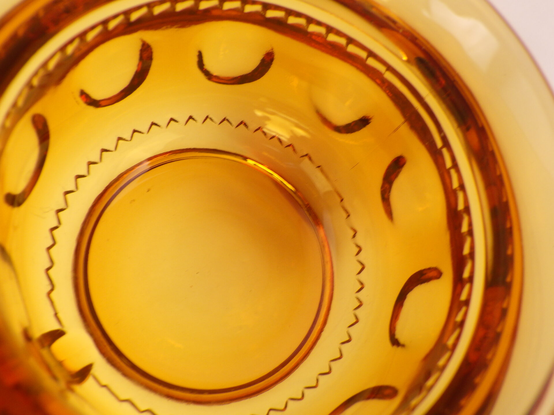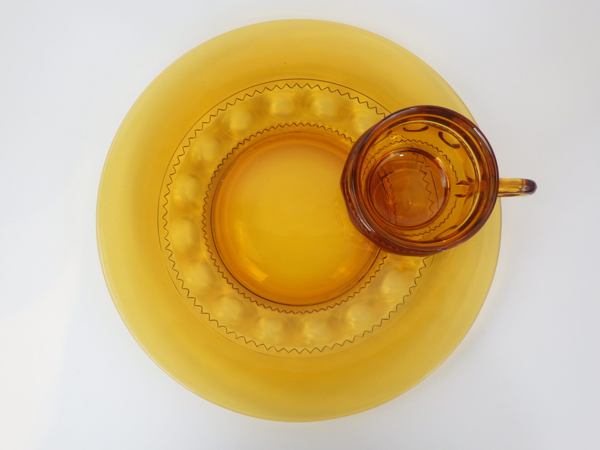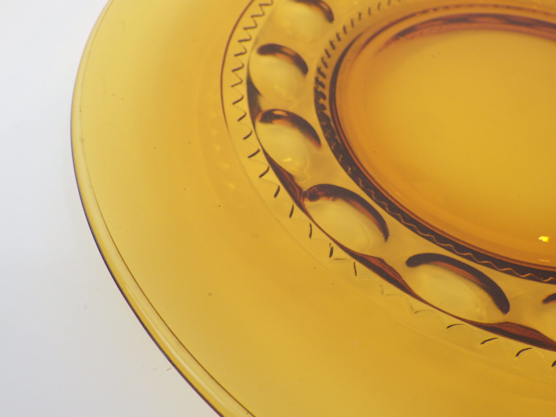| アメリカ、インディアナグラス社のキングスクラウン、スナックセットです。 はちみつのようにとろりとした、美しいアンバーカラーが印象的。 スナックセットのプレートとしては比較的大き目なので、お料理もしっかり盛り付けられます。 古いガラス製品特有の小さな気泡が見られますが、光が当たるとキラキラして綺麗です。 朝食やランチタイム、来客時にもおすすめのアイテムです。 |