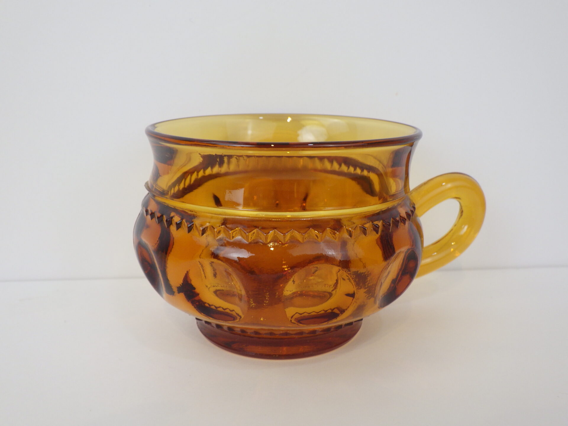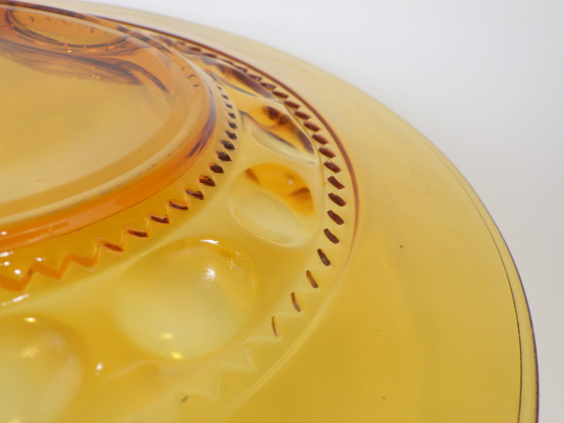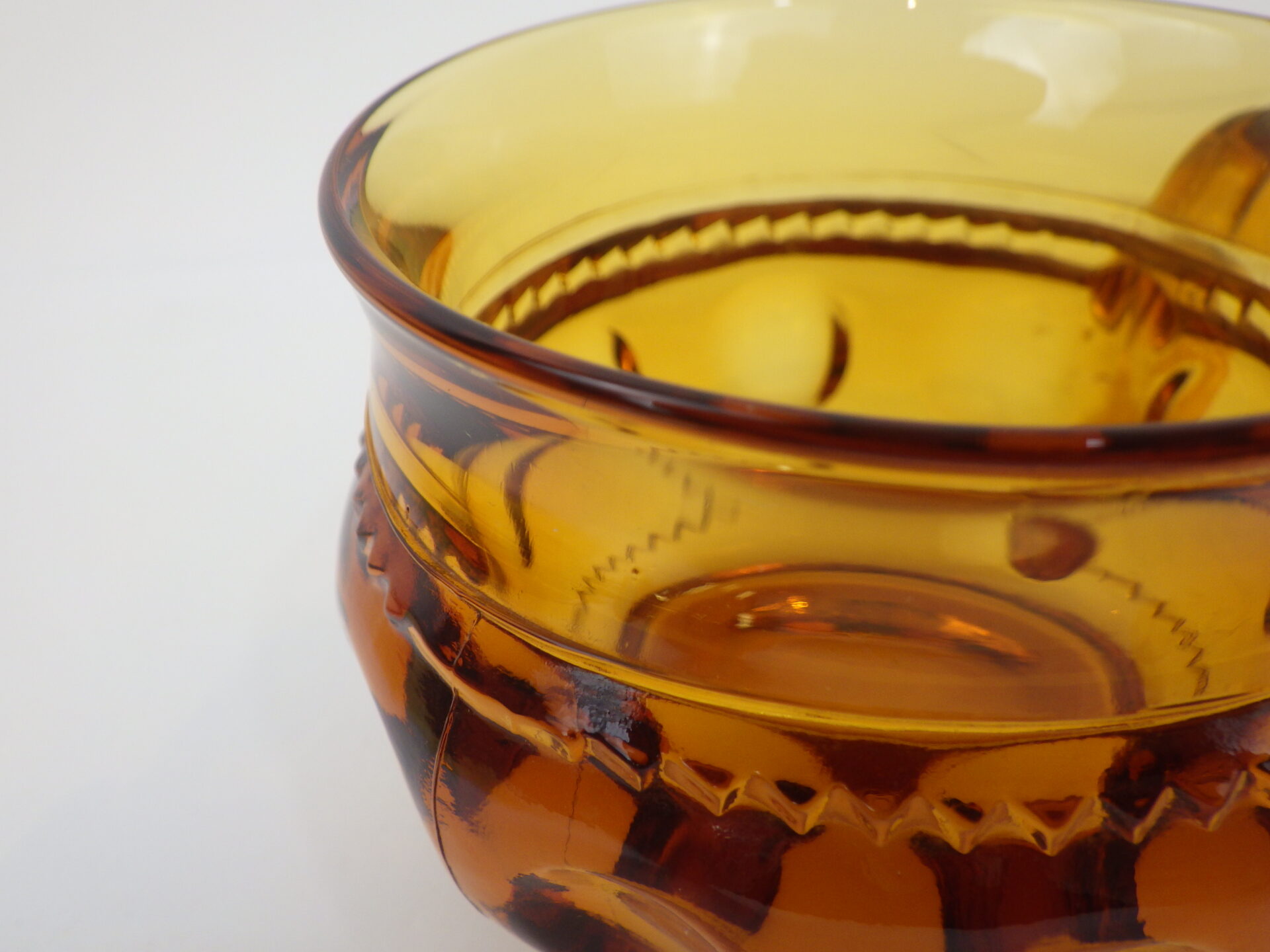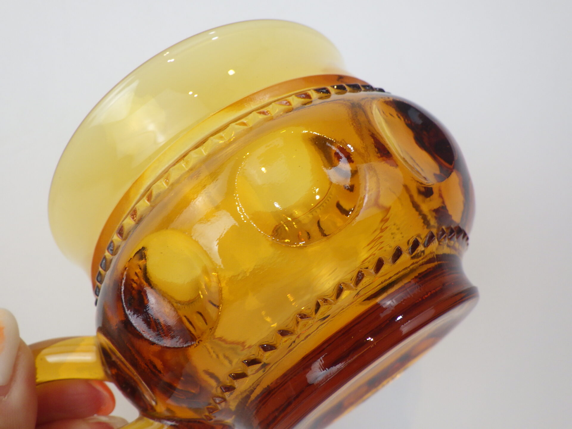 | アメリカ、インディアナグラス社のキングスクラウン、スナックセットです。 はちみつのようにとろりとした、美しいアンバーカラーが印象的。 スナックセットのプレートとしては比較的大き目なので、お料理もしっかり盛り付けられます。 古いガラス製品特有の小さな気泡が見られますが、光が当たるとキラキラして綺麗です。 朝食やランチタイム、来客時にもおすすめのアイテムです。 |