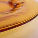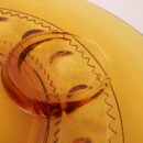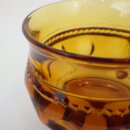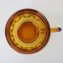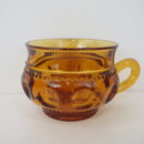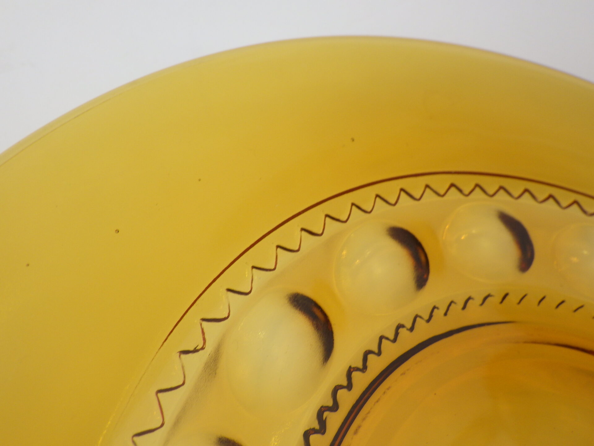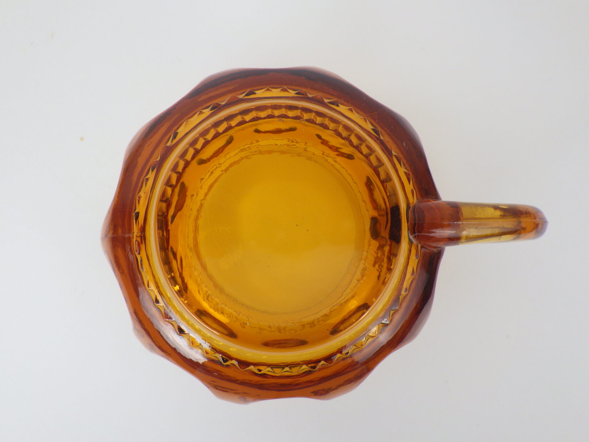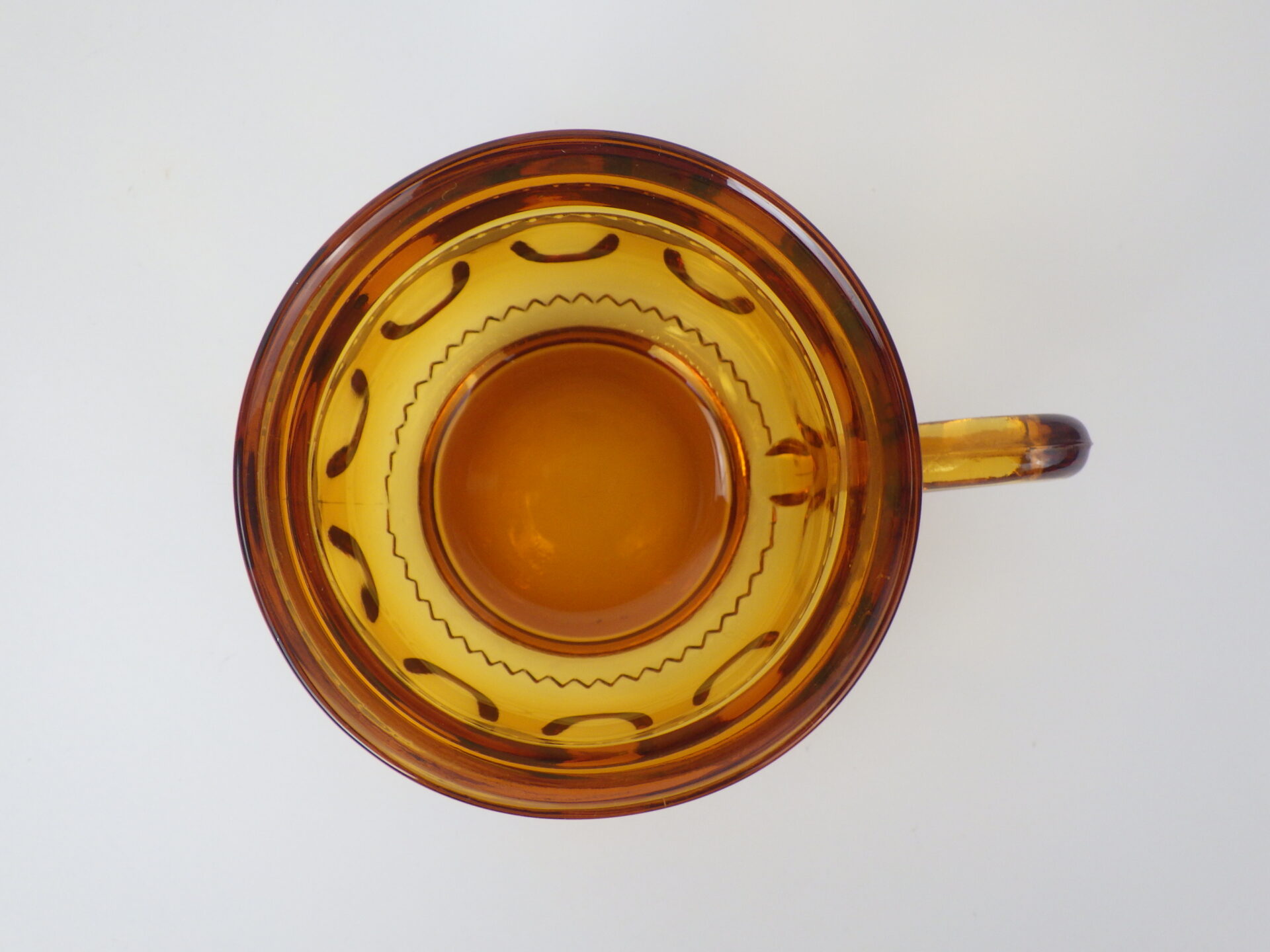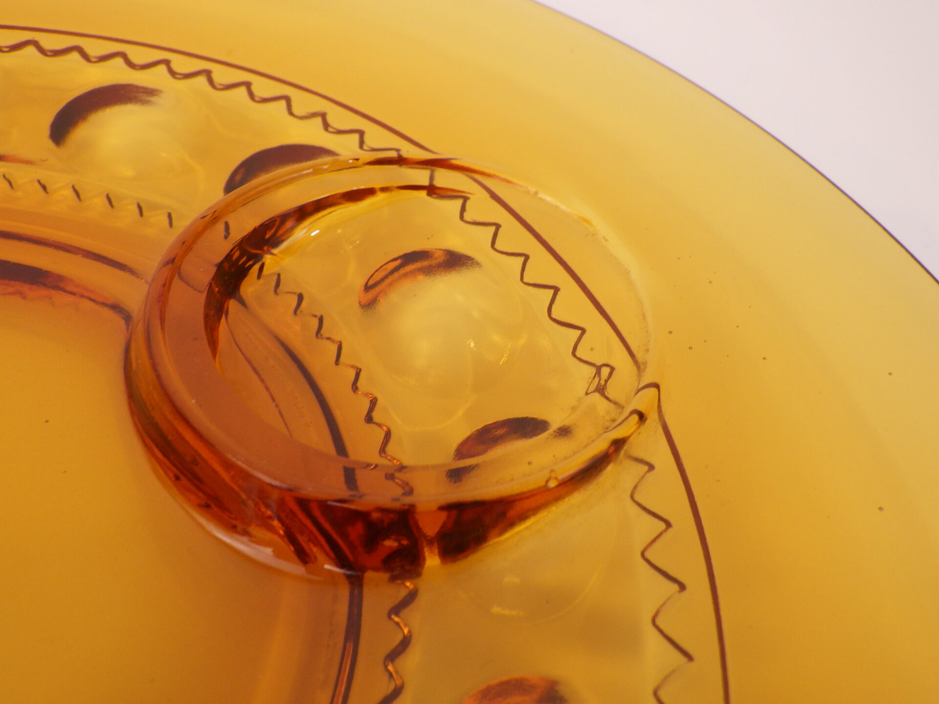 | アメリカ、インディアナグラス社のキングスクラウン、スナックセットです。 はちみつのようにとろりとした、美しいアンバーカラーが印象的。 スナックセットのプレートとしては比較的大き目なので、お料理もしっかり盛り付けられます。 古いガラス製品特有の小さな気泡が見られますが、光が当たるとキラキラして綺麗です。 朝食やランチタイム、来客時にもおすすめのアイテムです。 |